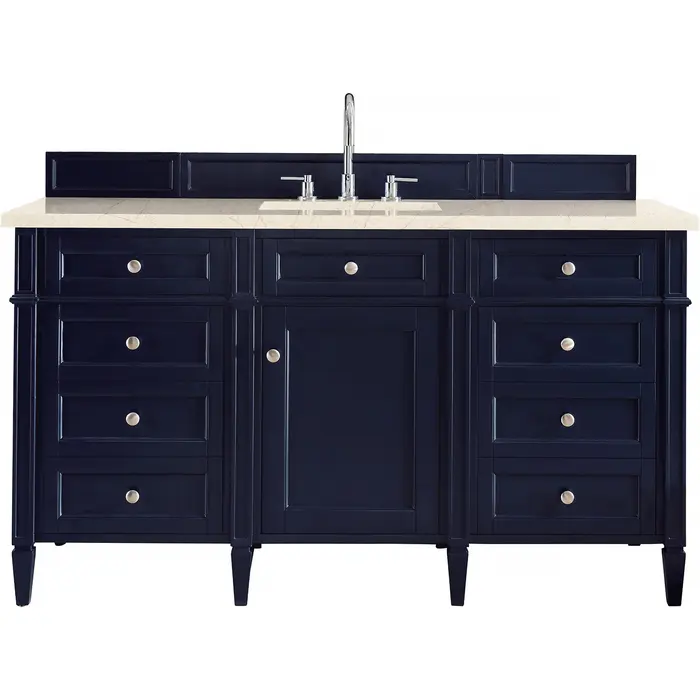 The Brittany 60" Victory Blue Single Vanity by James Martin Vanities features classic details that bridge both traditional and transitional styles. This beautiful piece of furniture includes one hide-away top row tip-out drawer, plus six full-depth drawers, two of which are double-height for storage of taller items. This cabinet also has one door, which conceals an interior shelf for ample storage. Handcrafted in yellow poplar solids and veneers with satin nickel hardware. Matching wood backsplash is included. The look is completed with a 3 CM eased edge Eternal Marfil Silestone top by Cosentino and one white ceramic sink.Single door cabinet with one adjustable interior shelf, one top-row tip-out drawer, and six standard full-extension drawersHardware Finish: Satin NickelSolid kiln-dried Grade A hardwoodCabinet is finished inside and out with a premium undercoat finish for superior moisture and UV resistanceSoft-close undermount drawer glides and soft-close door hingesDrawer bottoms are lined with our signature brushed aluminum laminateMatching decorative wood backsplash is included3 CM eased edge Eternal Marfil Silestone top and one white porcelain rectangular sinkCountertop is pre-drilled for one 3-hole 8" spreadFaucet sold separatelyOur most popular collection, the Brittany was thoughtfully crafted to combine both traditional and modern style. The tapered legs are a recognizable nod to the past, while the straight lines and shaker-style detailing suggest a more contemporary aesthetic. Available in eight beautiful finishes, Brittany's versatile design blends seamlessly with a wide range of interior styling, while the expansive storage options make this collection a functional solution for any bathroom.1 year warranty against manufacturer's defects. We will repair or replace any defective product, if the product is defective in material or workmanship at our discretion. No warranty is expressed or implied regarding damages resulting from consumer misuse.