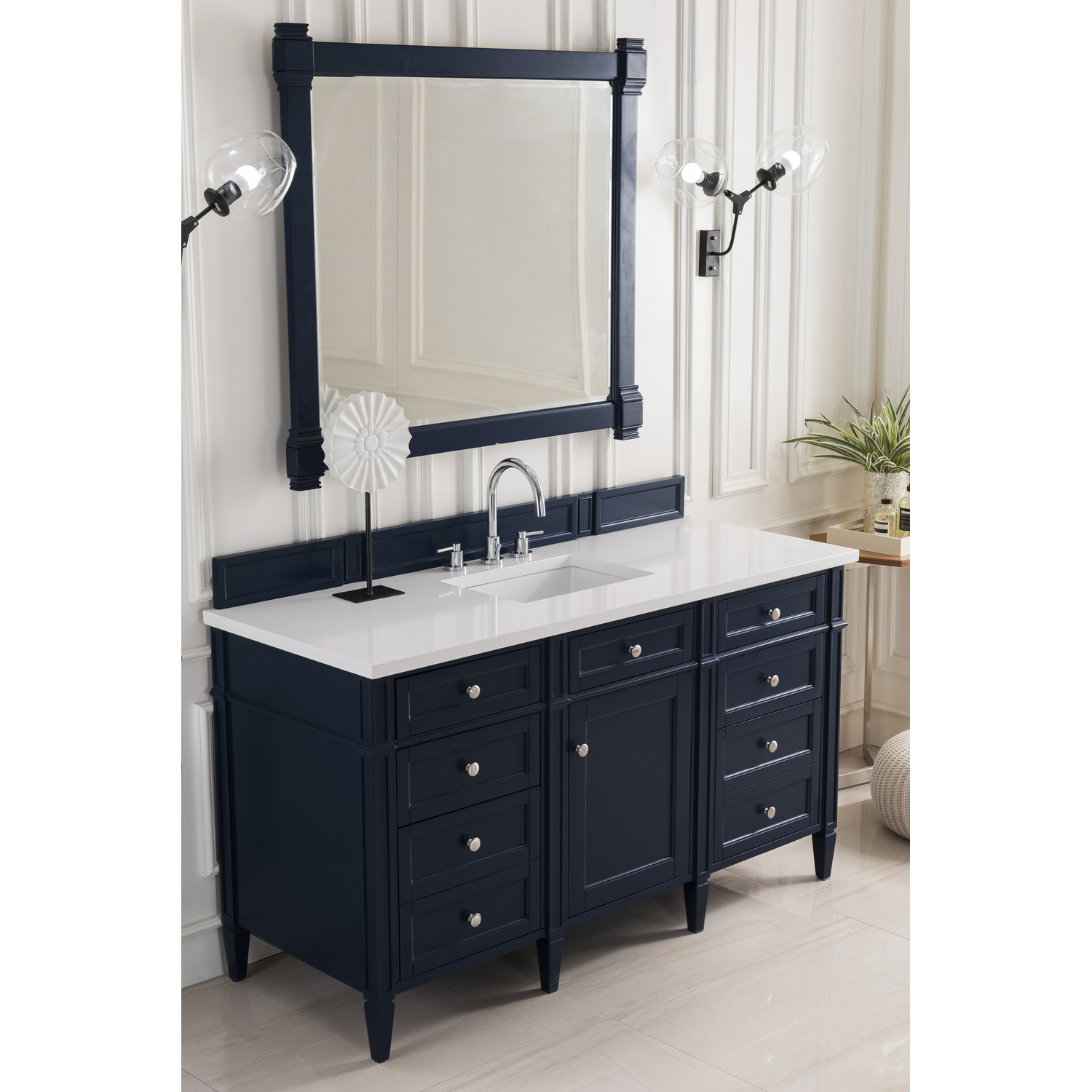 The Brittany 60" Victory Blue Single Vanity by James Martin Vanities features classic details that bridge both traditional and transitional styles. This beautiful piece of furniture includes one hide-away top row tip-out drawer, plus six full-depth drawers, two of which are double-height for storage of taller items. This cabinet also has one door, which conceals an interior shelf for ample storage. Handcrafted in yellow poplar solids and veneers with satin nickel hardware. Matching wood backsplash is included. The look is completed with a 3 CM eased edge White Zeus Silestone top by Cosentino and one white ceramic sink.Single door cabinet with one adjustable interior shelf, one top-row tip-out drawer, and six standard full-extension drawersHardware Finish: Satin NickelSolid kiln-dried Grade A hardwoodCabinet is finished inside and out with a premium undercoat finish for superior moisture and UV resistanceSoft-close undermount drawer glides and soft-close door hingesDrawer bottoms are lined with our signature brushed aluminum laminateMatching decorative wood backsplash is included3 CM eased edge White Zeus Silestone top and one white porcelain rectangular sinkCountertop is pre-drilled for one 3-hole 8" spreadFaucet sold separatelyOur most popular collection, the Brittany was thoughtfully crafted to combine both traditional and modern style. The tapered legs are a recognizable nod to the past, while the straight lines and shaker-style detailing suggest a more contemporary aesthetic. Available in eight beautiful finishes, Brittany's versatile design blends seamlessly with a wide range of interior styling, while the expansive storage options make this collection a functional solution for any bathroom.1 year warranty against manufacturer's defects. We will repair or replace any defective product, if the product is defective in material or workmanship at our discretion. No warranty is expressed or implied regarding damages resulting from consumer misuse.