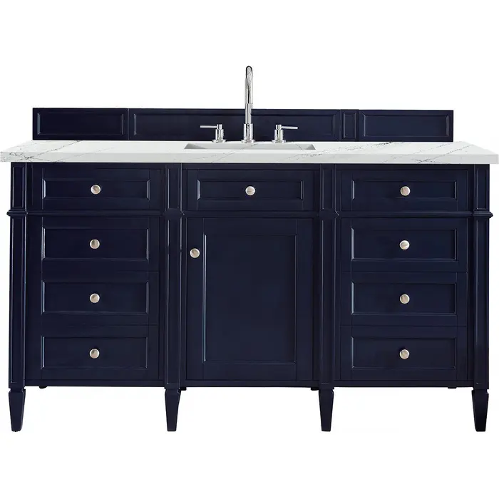 The Brittany 60" Single Vanity by James Martin Vanities features a Victory Blue finish and classic details that bridge both traditional and transitional styles. Featuring tapered legs and shaker-style detailing, this vanity includes one cabinet door that opens to reveal and interior shelf. Four standard full-extension drawers, two double-height drawers for storage of taller items, and one top-row tip-out drawer lend additional storage. Brittany showcases Satin Nickel hardware and comes with an optional coordinating wood backsplash. A striking Eternal Noctis Silestone® top with undermount sink completes the look. This unit is enabled with FreePower wireless charging; featuring a single-device charger seamlessly embedded into the countertop, indicated by a light-up halo to the left of the sink. Designed for modern living, FreePower offers convenient, integrated, wireless charging when and where you need it.FreePower Wireless Charging; single-device unit left of sinkOne door cabinet with six full-extension drawers (two double-deep), and one top-row tip-out drawerDrawer boxes feature English Dovetail joinery with premium, soft-close undermount drawer slides and doors feature soft-close, adjustable door hingesCabinet features a multi-stage premium finish coat to offer UV and moisture resistanceVictory Blue finish with Satin Nickel hardwareCountertop is pre-drilled for 8" widespread faucet(s); our 3cm eased edge countertops come with white porcelain rectangular sink(s) that ship separately and include mounting brackets for easy installationFaucet(s) sold separatelyDrawers lined with our signature brushed aluminum laminate for easy cleaningTop-row tip-out drawer with removable bamboo linerComes with optional, coordinating wood backsplash; matching stone backsplash available as add-on purchaseFreestanding VanityThe Brittany Collection by James Martin Vanities was thoughtfully crafted to combine both traditional and modern styles. The tapered legs are a recognizable nod to the past, while the straight lines and shaker-style detailing suggest a more contemporary aesthetic. Available in eight beautiful finishes, Brittany's versatile design blends seamlessly with a wide range of interior styling, while the expansive storage options make this collection a functional solution for any bathroom.1 year warranty against manufacturer's defects. We will repair or replace any defective product, if the product is defective in material or workmanship at our discretion. No warranty is expressed or implied regarding damages resulting from consumer misuse.