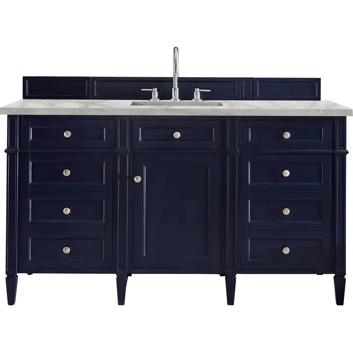 The Brittany 60" Single Vanity by James Martin Vanities features a Victory Blue finish and classic details that bridge both traditional and transitional styles. Featuring tapered legs and shaker-style detailing, this vanity includes one cabinet door that opens to reveal and interior shelf. Four standard full-extension drawers, two double-height drawers for storage of taller items, and one top-row tip-out drawer lend additional storage. Brittany showcases Satin Nickel hardware and comes with an optional coordinating wood backsplash. A stunning Victorian Silver Silestone® top with undermount sink completes the look. This unit is enabled with FreePower wireless charging; featuring a single-device charger seamlessly embedded into the countertop, indicated by a light-up halo to the left of the sink. Designed for modern living, FreePower offers convenient, integrated, wireless charging when and where you need it.FreePower Wireless Charging; single-device unit left of sinkOne door cabinet with six full-extension drawers (two double-deep), and one top-row tip-out drawerDrawer boxes feature English Dovetail joinery with premium, soft-close undermount drawer slides and doors feature soft-close, adjustable door hingesCabinet features a multi-stage premium finish coat to offer UV and moisture resistanceVictory Blue finish with Satin Nickel hardwareCountertop is pre-drilled for 8" widespread faucet(s); our 3cm eased edge countertops come with white porcelain rectangular sink(s) that ship separately and include mounting brackets for easy installationFaucet(s) sold separatelyDrawers lined with our signature brushed aluminum laminate for easy cleaningTop-row tip-out drawer with removable bamboo linerComes with optional, coordinating wood backsplash; matching stone backsplash available as add-on purchaseFreestanding VanityThe Brittany Collection by James Martin Vanities was thoughtfully crafted to combine both traditional and modern styles. The tapered legs are a recognizable nod to the past, while the straight lines and shaker-style detailing suggest a more contemporary aesthetic. Available in eight beautiful finishes, Brittany's versatile design blends seamlessly with a wide range of interior styling, while the expansive storage options make this collection a functional solution for any bathroom.1 year warranty against manufacturer's defects. We will repair or replace any defective product, if the product is defective in material or workmanship at our discretion. No warranty is expressed or implied regarding damages resulting from consumer misuse.