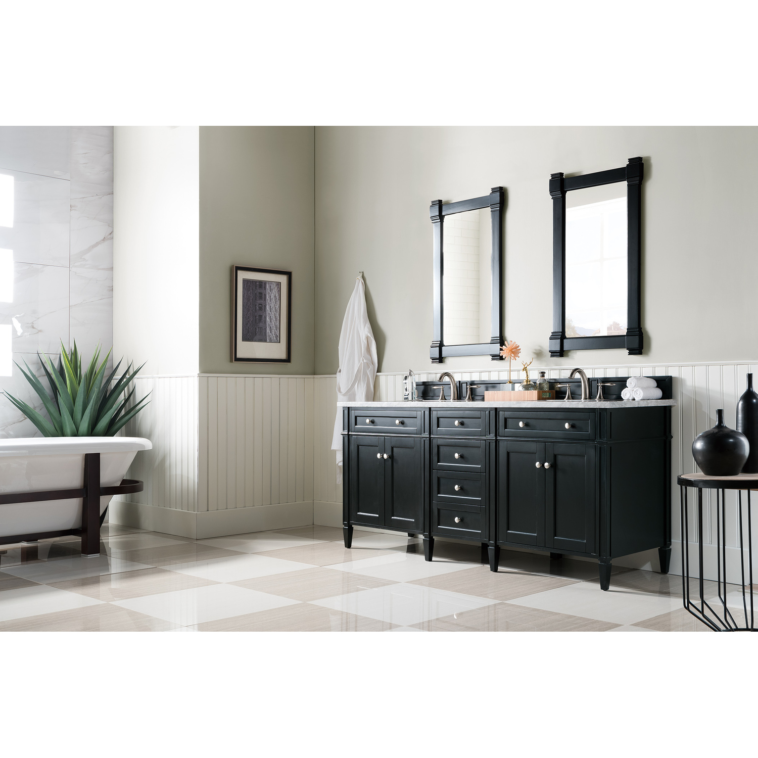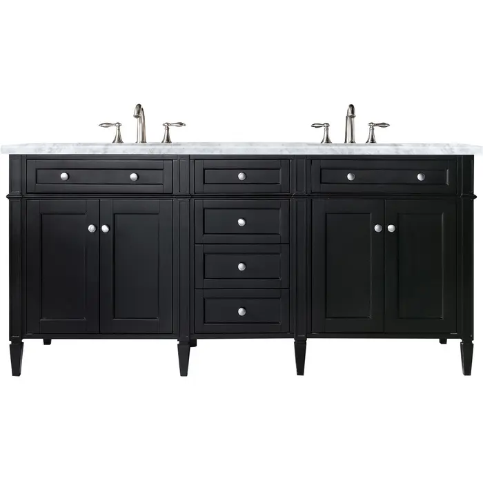 The Brittany 72" Black Onyx Double Vanity by James Martin Vanities features classic details that bridge both traditional and transitional styles. This beautiful piece of furniture includes two hide-away tip-out, top row drawers and four full-depth drawers. This cabinet also has four doors which conceal interior shelves for ample storage. Handcrafted in yellow poplar solids and veneers with satin nickel hardware. Matching wood backsplash is included. The look is completed with a 3 CM eased edge 3 CM eased edge Carrara Marble top with two white ceramic rectangular sinks.Four door Black Onyx double vanity with six drawers and interior shelf space; top outside drawers are tip-out styleHardware Finish: Satin NickelSolid kiln-dried Grade A hardwoodCabinet is finished inside and out with a premium undercoat finish for superior moisture and UV resistanceSoft-close undermount drawer glides and soft-close door hingesDrawer bottoms are lined with our signature brushed aluminum laminateMatching decorative wood backsplash is included3 CM eased edge Carrara Marble top and two white porcelain rectangular sinksCountertop is pre-drilled for two 3-hole 8" spreadsFaucets sold separatelyOur most popular collection, the Brittany was thoughtfully crafted to combine both traditional and modern style. The tapered legs are a recognizable nod to the past, while the straight lines and shaker-style detailing suggest a more contemporary aesthetic. Available in eight beautiful finishes, Brittany's versatile design blends seamlessly with a wide range of interior styling, while the expansive storage options make this collection a functional solution for any bathroom.1 year warranty against manufacturer's defects. We will repair or replace any defective product, if the product is defective in material or workmanship at our discretion. No warranty is expressed or implied regarding damages resulting from consumer misuse.