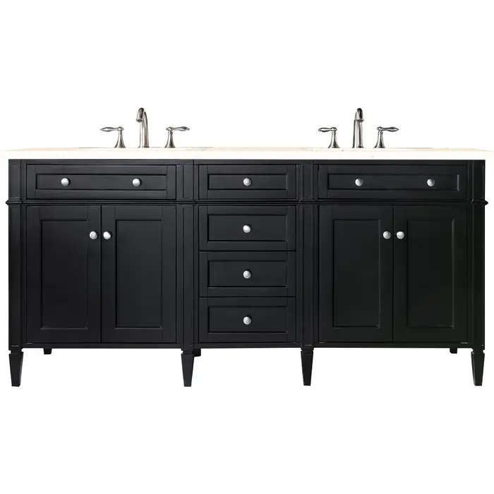 The Brittany 72" Black Onyx Double Vanity by James Martin Vanities features classic details that bridge both traditional and transitional styles. This beautiful piece of furniture includes two hide-away tip-out, top row drawers and four full-depth drawers. This cabinet also has four doors which conceal interior shelves for ample storage. Handcrafted in yellow poplar solids and veneers with satin nickel hardware. Matching wood backsplash is included. The look is completed with a 3 CM eased edge 3 CM eased edge Eternal Marfil Silestone top with two white ceramic rectangular sinks.Four door Black Onyx double vanity with six drawers and interior shelf space; top outside drawers are tip-out styleHardware Finish: Satin NickelSolid kiln-dried Grade A hardwoodCabinet is finished inside and out with a premium undercoat finish for superior moisture and UV resistanceSoft-close undermount drawer glides and soft-close door hingesDrawer bottoms are lined with our signature brushed aluminum laminateMatching decorative wood backsplash is included3 CM eased edge Eternal Marfil Silestone top and two white porcelain rectangular sinksCountertop is pre-drilled for two 3-hole 8" spreadsFaucets sold separatelyOur most popular collection, the Brittany was thoughtfully crafted to combine both traditional and modern style. The tapered legs are a recognizable nod to the past, while the straight lines and shaker-style detailing suggest a more contemporary aesthetic. Available in eight beautiful finishes, Brittany's versatile design blends seamlessly with a wide range of interior styling, while the expansive storage options make this collection a functional solution for any bathroom.1 year warranty against manufacturer's defects. We will repair or replace any defective product, if the product is defective in material or workmanship at our discretion. No warranty is expressed or implied regarding damages resulting from consumer misuse.