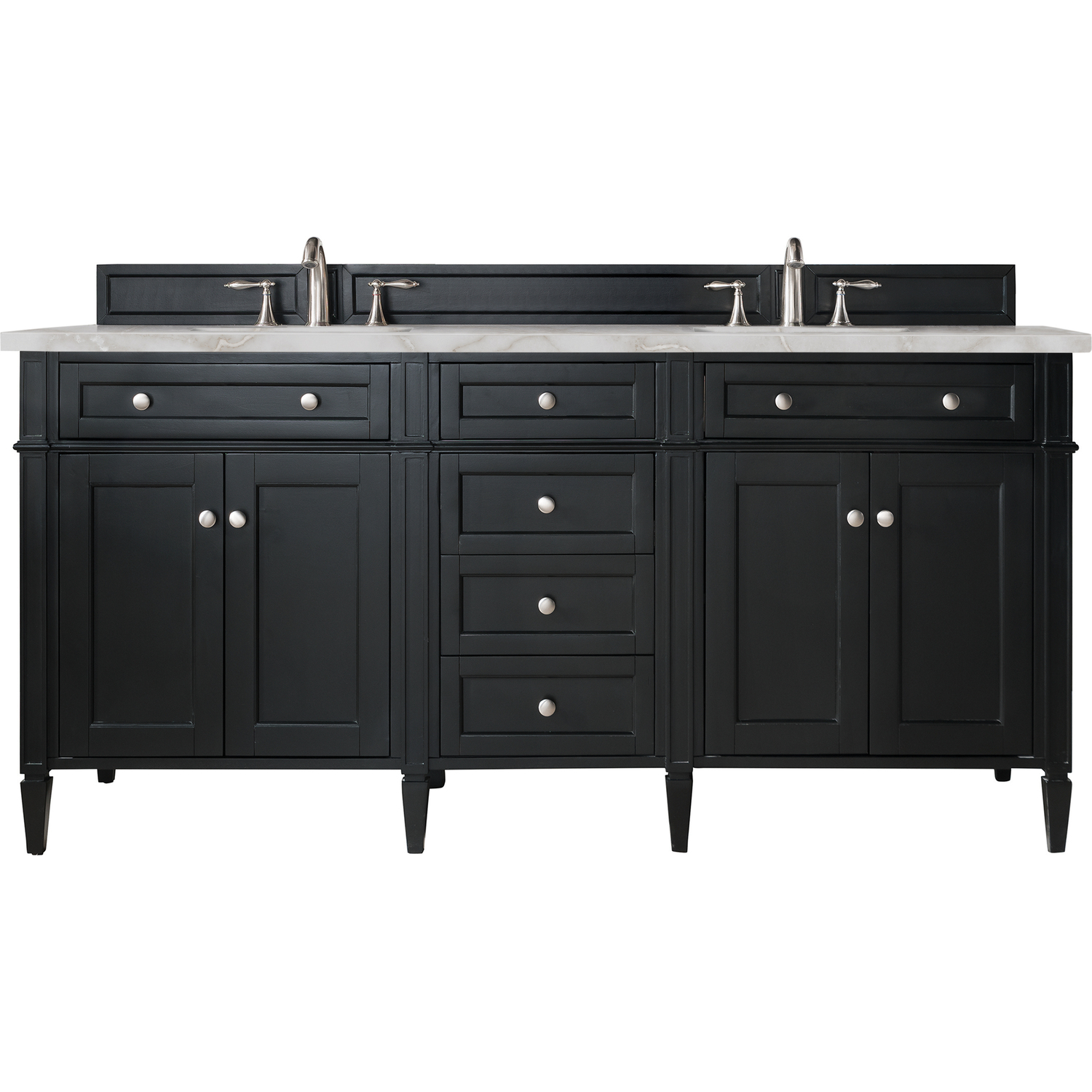 The Brittany 72" Black Onyx Double Vanity by James Martin Vanities features classic details that bridge both traditional and transitional styles. This beautiful piece of furniture includes two hide-away tip-out, top row drawers and four full-depth drawers. This cabinet also has four doors which conceal interior shelves for ample storage. Handcrafted in yellow Poplar solids and veneers with satin nickel hardware. Matching wood backsplash is included. The look is completed with a 3 CM eased-edge countertop by Cosentino in Victorian Silver, which features a cool background tone with silver and dark neutral veins, complimented with champagne metallic accents. It includes pre-drilled holes for two 8-inch widespread faucets (not included), two white porcelain rectangular sinks, as well as the appropriate mounting brackets for installation.Vanity set includes a 3cm eased edge Victorian Silver Silestone top, two white porcelain rectangular sinks and mounting brackets for easy installation. Top is pre-drilled for two 8" widespread faucets. Faucets not included.Four door Black Onyx double vanity with six drawers and interior shelf space; top outside drawers are tip-out styleCrafted from Poplar solids and plywood and is sealed inside and outside with our premium moisture and UV resistant coatingDrawer boxes are constructed using English Dovetail joinery, feature soft-close undermount glides and a Brushed Aluminum laminate drawer bottom.Polished Chrome hardwareIncludes one removable Bamboo drawer organizer trayMatching decorative wood backsplash is includedFaucets sold separatelyCountertop is pre-drilled for two 3-hole 8" spreadsOur most popular collection, the Brittany was thoughtfully crafted to combine both traditional and modern style. The tapered legs are a recognizable nod to the past, while the straight lines and shaker-style detailing suggest a more contemporary aesthetic. Available in eight beautiful finishes, Brittany's versatile design blends seamlessly with a wide range of interior styling, while the expansive storage options make this collection a functional solution for any bathroom.1 year warranty against manufacturer's defects. We will repair or replace any defective product, if the product is defective in material or workmanship at our discretion. No warranty is expressed or implied regarding damages resulting from consumer misuse.