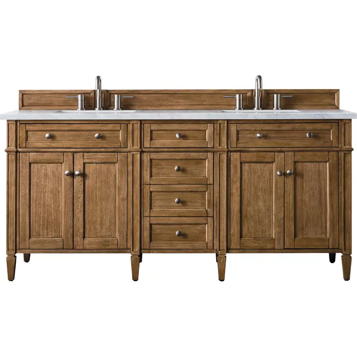 The Brittany 72" Saddle Brown Double Vanity by James Martin Vanities features classic details that bridge both traditional and transitional styles. This beautiful piece of furniture includes two hide-away tip-out, top row drawers and four full-depth drawers. This cabinet also has four doors which conceal interior shelves for ample storage. Handcrafted in yellow poplar solids and veneers with satin nickel hardware. Matching wood backsplash is included. The look is completed with a 3 CM eased edge 3 CM eased edge Arctic Fall Solid Surface top with two white ceramic rectangular sinks.Four door Saddle Brown double vanity with six drawers and interior shelf space; top outside drawers are tip-out styleHardware Finish: Satin NickelSolid kiln-dried Grade A hardwoodCabinet is finished inside and out with a premium undercoat finish for superior moisture and UV resistanceSoft-close undermount drawer glides and soft-close door hingesDrawer bottoms are lined with our signature brushed aluminum laminateMatching decorative wood backsplash is included3 CM eased edge Arctic Fall Solid Surface top and two white porcelain rectangular sinksCountertop is pre-drilled for two 3-hole 8" spreadsFaucets sold separatelySubtle luxury. James Martin Vanities most popular collection, Brittany, was designed to merge traditional and transitional tastes. The tapered legs are a nod to the past, but the restrained use of ornamentation suggests a modern aesthetic. Interior space and storage are ample, including our top row “tip out” drawers which utilize the space in front of the sink. Cabinets are crafted from kiln-dried North American Birch and White Poplar hardwoods. Seven widths of cabinet are offered in the Brittany series and are available in six finish options: Burnished Mahogany, Bright White, Urban Gray, Black Onyx, Saddle Brown and Sage Green. Three widths of coordinating mirrors will add finishing touches to your room.1 year warranty against manufacturer's defects. We will repair or replace any defective product, if the product is defective in material or workmanship at our discretion. No warranty is expressed or implied regarding damages resulting from consumer misuse.