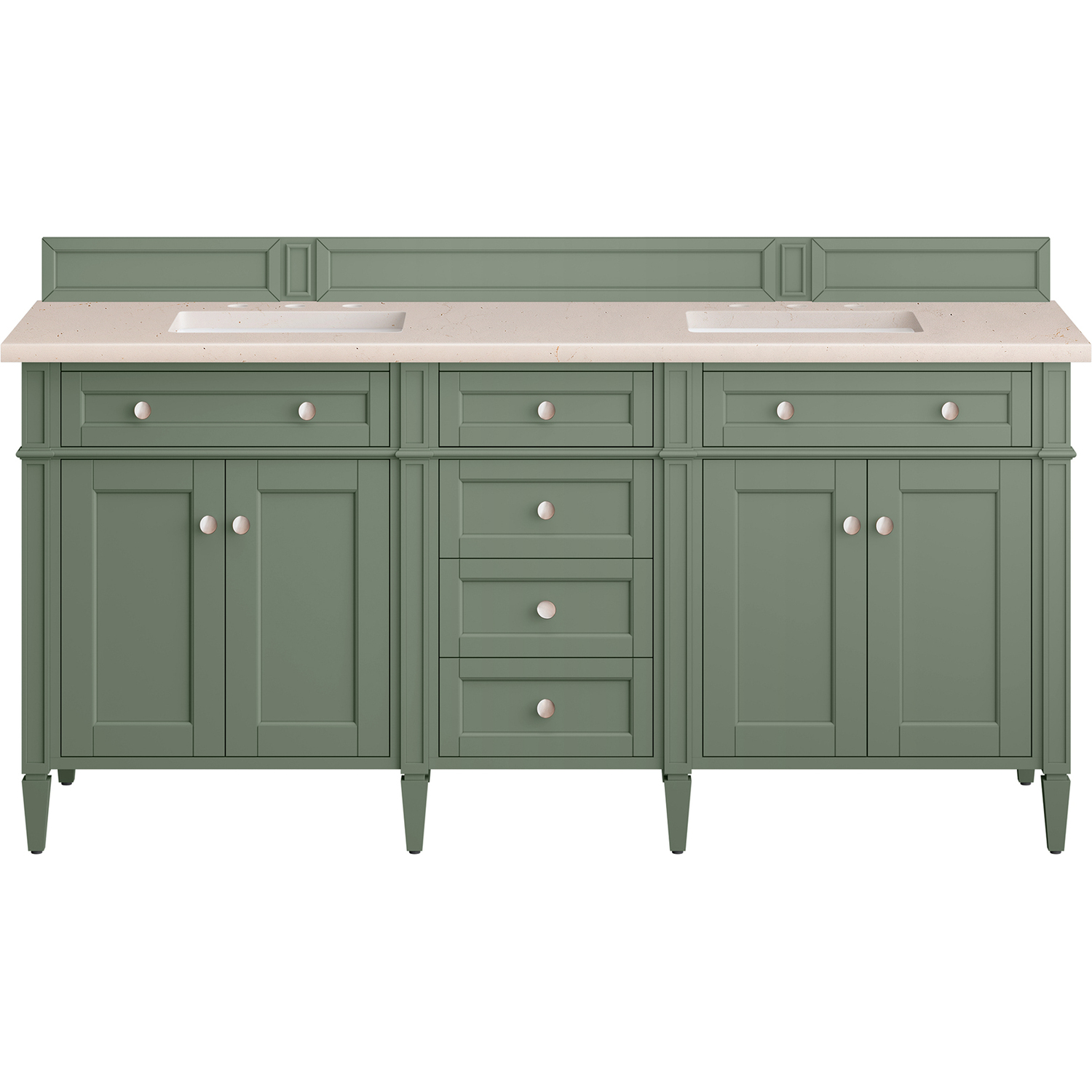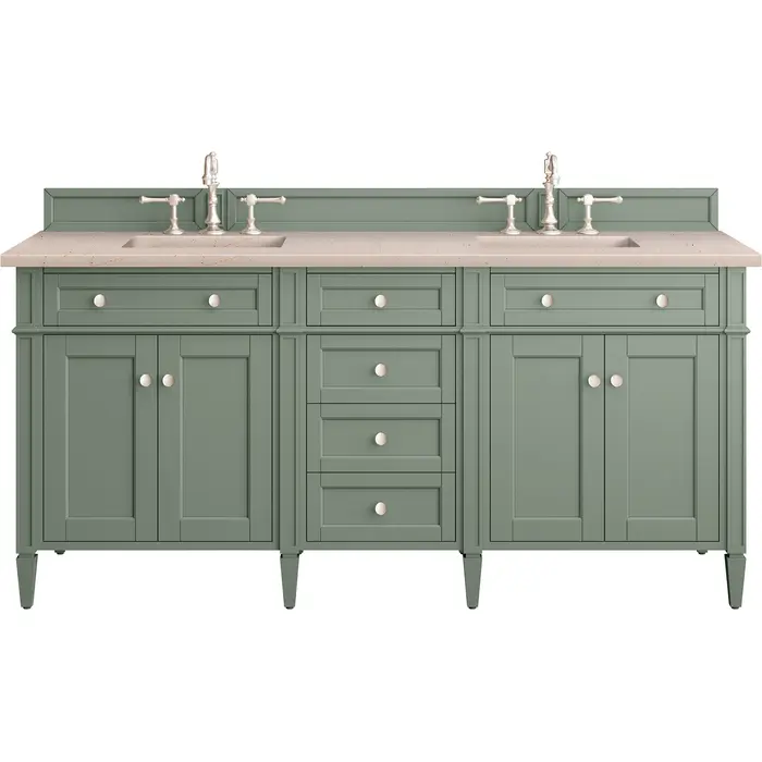 The Smokey Celadon finish on the 72" Brittany Vanity adds a refreshing, natural element to any bathroom space. This moody, yet muted green, with subtle blue and grey undertones, brings the rich, timeless details of the Brittany collection to life. The 72" cabinet, with decorative wood backsplash, features optimal organization with two hide-away tip-out drawers plus four center drawers. This cabinet has two sets of doors, each concealing an interior shelf. All drawers are lined with an aluminum laminate surface for easy cleaning and are equipped with undermount soft-close slides. The warm, neutral tones and copper veining in the Eternal Marfil 3 CM Silestone top create a soft, inviting feel. All of our 3 CM tops include a porcelain undermount sink.Four door Smokey Celadon double vanity with six drawers and interior shelf space; top outside drawers are tip-out styleHardware Finish: Satin NickelSolid kiln-dried Grade A hardwoodCabinet is finished inside and out with a premium undercoat finish for superior moisture and UV resistanceSoft-close undermount drawer glides and soft-close door hingesDrawer bottoms are lined with our signature brushed aluminum laminateMatching decorative wood backsplash is included3 CM eased edge Eternal Marfil Silestone top and two white porcelain rectangular sinksCountertop is pre-drilled for two 3-hole 8" spreadsFaucets sold separatelyOur most popular collection, the Brittany was thoughtfully crafted to combine both traditional and modern style. The tapered legs are a recognizable nod to the past, while the straight lines and shaker-style detailing suggest a more contemporary aesthetic. Available in eight beautiful finishes, Brittany's versatile design blends seamlessly with a wide range of interior styling, while the expansive storage options make this collection a functional solution for any bathroom.1 year warranty against manufacturer's defects. We will repair or replace any defective product, if the product is defective in material or workmanship at our discretion. No warranty is expressed or implied regarding damages resulting from consumer misuse.