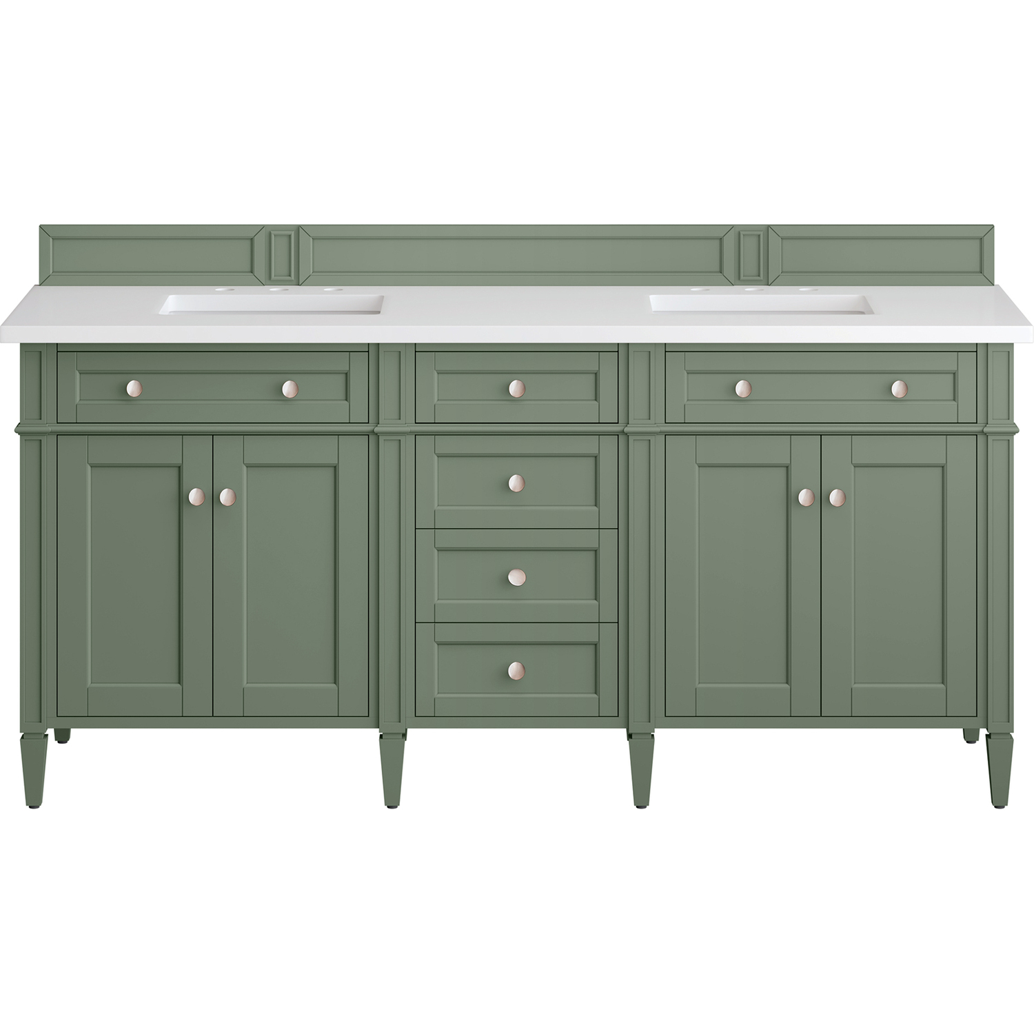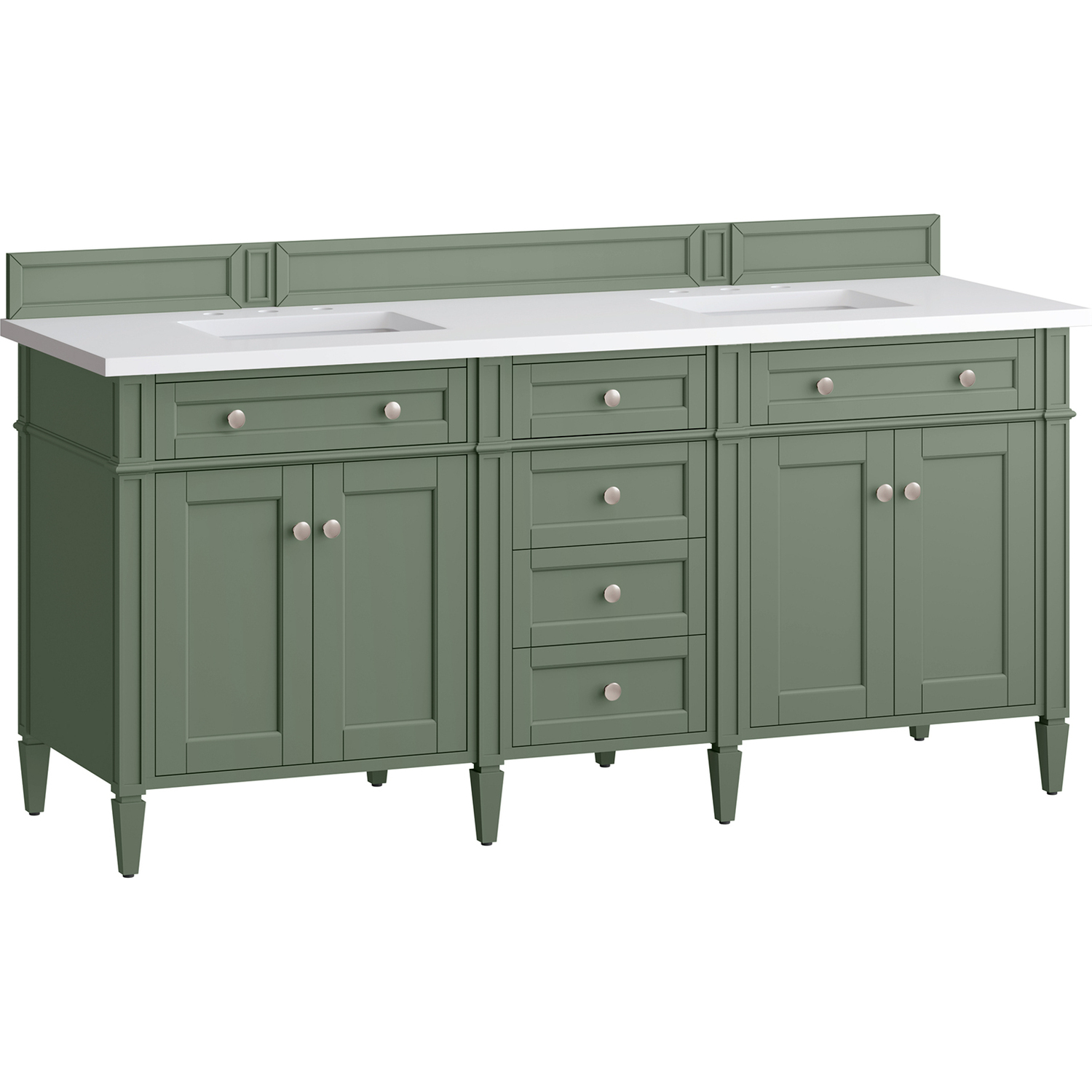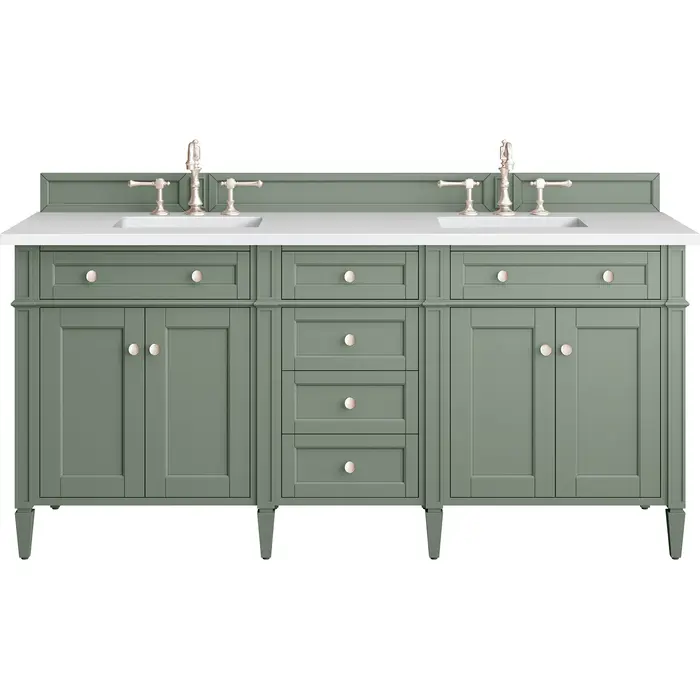 The Smokey Celadon finish on the 72" Brittany Vanity adds a refreshing, natural element to any bathroom space. This moody, yet muted green, with subtle blue and grey undertones, brings the rich, timeless details of the Brittany collection to life. The 72" cabinet, with decorative wood backsplash, features optimal organization with two hide-away tip-out drawers plus four center drawers. This cabinet has two sets of doors, each concealing an interior shelf. All drawers are lined with an aluminum laminate surface for easy cleaning and are equipped with undermount soft-close slides. The bright, crisp White Zeus 3 CM Silestone top adds a beautiful finishing touch. All of our 3 CM tops include a porcelain undermount sink.Four door Smokey Celadon double vanity with six drawers and interior shelf space; top outside drawers are tip-out styleHardware Finish: Satin NickelSolid kiln-dried Grade A hardwoodCabinet is finished inside and out with a premium undercoat finish for superior moisture and UV resistanceSoft-close undermount drawer glides and soft-close door hingesDrawer bottoms are lined with our signature brushed aluminum laminateMatching decorative wood backsplash is included3 CM eased edge White Zeus Silestone top and two white porcelain rectangular sinksCountertop is pre-drilled for two 3-hole 8" spreadsFaucets sold separatelyOur most popular collection, the Brittany was thoughtfully crafted to combine both traditional and modern style. The tapered legs are a recognizable nod to the past, while the straight lines and shaker-style detailing suggest a more contemporary aesthetic. Available in eight beautiful finishes, Brittany's versatile design blends seamlessly with a wide range of interior styling, while the expansive storage options make this collection a functional solution for any bathroom.1 year warranty against manufacturer's defects. We will repair or replace any defective product, if the product is defective in material or workmanship at our discretion. No warranty is expressed or implied regarding damages resulting from consumer misuse.