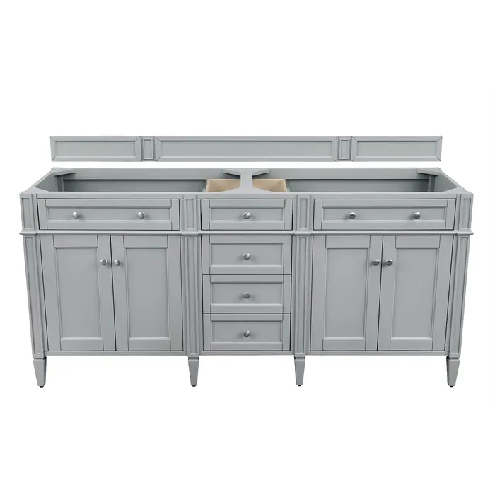 The Brittany 72" Urban Gray Double Vanity by James Martin Vanities features classic details that bridge both traditional and transitional styles.  This beautiful piece of furniture includes two hide-away tip-out drawers, plus four full-depth drawers.  This cabinet also has four doors, which conceals an interior shelf, for ample storage.  Handcrafted in yellow poplar solids and veneers with satin nickel hardware.  Matching wood backsplash is included.Four door Urban Gray double vanity cabinet with six drawers and interior shelf space; top outside drawers are tip-out styleHardware Finish: Satin NickelSolid kiln-dried Grade A hardwoodCabinet is finished inside and out with a premium undercoat finish for superior moisture and UV resistanceSoft-close undermount drawer glides and soft-close door hingesDrawer bottoms are lined with our signature brushed aluminum laminateMatching decorative wood backsplash is includedCabinet only, countertop and sinks not includedOur most popular collection, the Brittany was thoughtfully crafted to combine both traditional and modern style. The tapered legs are a recognizable nod to the past, while the straight lines and shaker-style detailing suggest a more contemporary aesthetic. Available in eight beautiful finishes, Brittany's versatile design blends seamlessly with a wide range of interior styling, while the expansive storage options make this collection a functional solution for any bathroom.1 year warranty against manufacturer's defects. We will repair or replace any defective product, if the product is defective in material or workmanship at our discretion. No warranty is expressed or implied regarding damages resulting from consumer misuse.
