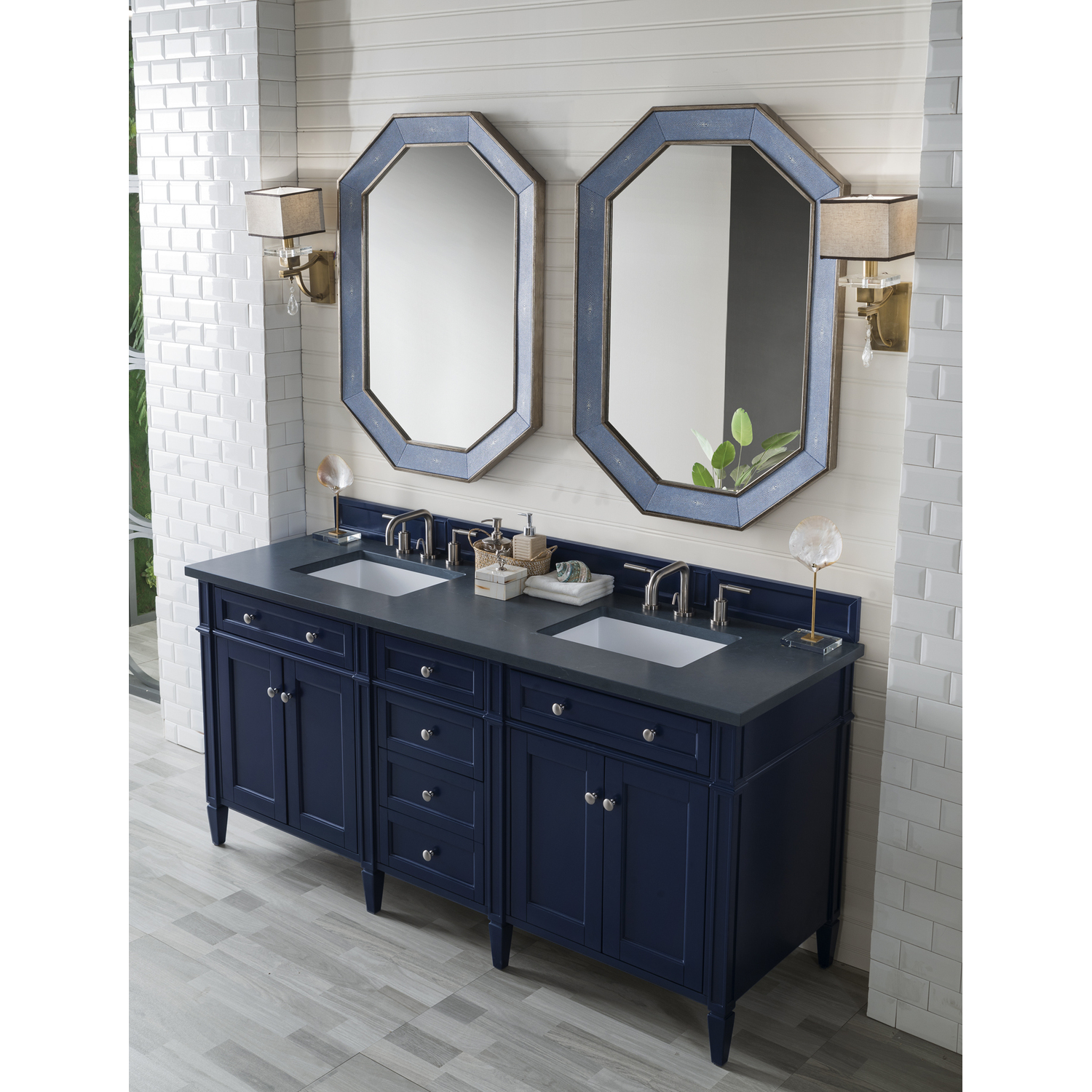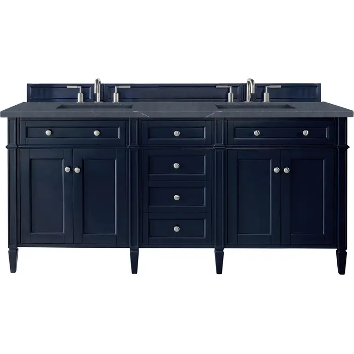 The Brittany 72" Victory Blue Double Vanity by James Martin Vanities features classic details that bridge both traditional and transitional styles. This beautiful piece of furniture includes two hide-away tip-out, top row drawers and four full-depth drawers. This cabinet also has four doors which conceal interior shelves for ample storage. Handcrafted in yellow poplar solids and veneers with satin nickel hardware. Matching wood backsplash is included. The look is completed with a 3 CM eased edge 3 CM eased edge Charcoal Soapstone Silestone top with two white ceramic rectangular sinks.Four door Victory Blue double vanity with six drawers and interior shelf space; top outside drawers are tip-out styleHardware Finish: Satin NickelSolid kiln-dried Grade A hardwoodCabinet is finished inside and out with a premium undercoat finish for superior moisture and UV resistanceSoft-close undermount drawer glides and soft-close door hingesDrawer bottoms are lined with our signature brushed aluminum laminateMatching decorative wood backsplash is included3 CM eased edge Charcoal Soapstone Silestone top and two white porcelain rectangular sinksCountertop is pre-drilled for two 3-hole 8" spreadsFaucets sold separatelyOur most popular collection, the Brittany was thoughtfully crafted to combine both traditional and modern style. The tapered legs are a recognizable nod to the past, while the straight lines and shaker-style detailing suggest a more contemporary aesthetic. Available in eight beautiful finishes, Brittany's versatile design blends seamlessly with a wide range of interior styling, while the expansive storage options make this collection a functional solution for any bathroom.1 year warranty against manufacturer's defects. We will repair or replace any defective product, if the product is defective in material or workmanship at our discretion. No warranty is expressed or implied regarding damages resulting from consumer misuse.