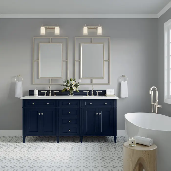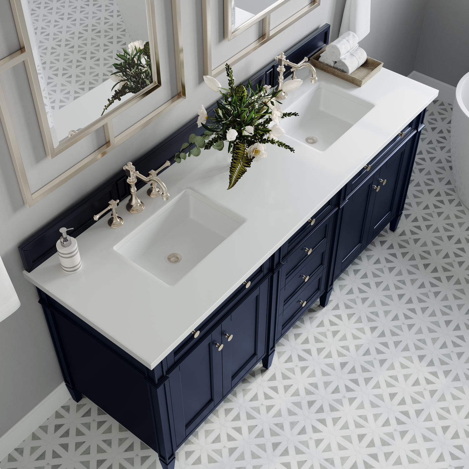 The Brittany 72" Victory Blue Double Vanity by James Martin Vanities features classic details that bridge both traditional and transitional styles. This beautiful piece of furniture includes two hide-away tip-out, top row drawers and four full-depth drawers. This cabinet also has four doors which conceal interior shelves for ample storage. Handcrafted in yellow poplar solids and veneers with satin nickel hardware. Matching wood backsplash is included. The look is completed with a 3 CM eased edge 3 CM eased edge White Zeus Silestone top with two white ceramic rectangular sinks.Four door Victory Blue double vanity with six drawers and interior shelf space; top outside drawers are tip-out styleHardware Finish: Satin NickelSolid kiln-dried Grade A hardwoodCabinet is finished inside and out with a premium undercoat finish for superior moisture and UV resistanceSoft-close undermount drawer glides and soft-close door hingesDrawer bottoms are lined with our signature brushed aluminum laminateMatching decorative wood backsplash is included3 CM eased edge White Zeus Silestone top and two white porcelain rectangular sinksCountertop is pre-drilled for two 3-hole 8" spreadsFaucets sold separatelyOur most popular collection, the Brittany was thoughtfully crafted to combine both traditional and modern style. The tapered legs are a recognizable nod to the past, while the straight lines and shaker-style detailing suggest a more contemporary aesthetic. Available in eight beautiful finishes, Brittany's versatile design blends seamlessly with a wide range of interior styling, while the expansive storage options make this collection a functional solution for any bathroom.1 year warranty against manufacturer's defects. We will repair or replace any defective product, if the product is defective in material or workmanship at our discretion. No warranty is expressed or implied regarding damages resulting from consumer misuse.