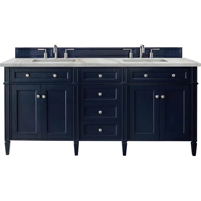 The Brittany 72" Double Vanity by James Martin Vanities features a Victory Blue finish and classic details that bridge both traditional and transitional styles. Featuring tapered legs and shaker-style detailing, this vanity includes four cabinet doors that open to reveal interior shelving. Four standard full-extension drawers and two top-row tip-out drawers lend additional storage. Brittany showcases Satin Nickel hardware and comes with an optional coordinating wood backsplash. A stunning Victorian Silver Silestone® top with undermount sinks completes the look. This unit is enabled with FreePower wireless charging; featuring a two-device charger seamlessly embedded into the countertop, indicated by a light-up halo in between the sinks. Designed for modern living, FreePower offers convenient, integrated, wireless charging when and where you need it.FreePower Wireless Charging; two-device unit in between sinksFour door cabinet with four full-extension drawers and two top-row tip-out drawersDrawer boxes feature English Dovetail joinery with premium, soft-close undermount drawer slides and doors feature soft-close, adjustable door hingesCabinet features a multi-stage premium finish coat to offer UV and moisture resistanceVictory Blue finish with Satin Nickel hardwareCountertop is pre-drilled for 8" widespread faucet(s); our 3cm eased edge countertops come with white porcelain rectangular sink(s) that ship separately and include mounting brackets for easy installationFaucet(s) sold separatelyDrawers lined with our signature brushed aluminum laminate for easy cleaningTop-row tip-out drawers with removable bamboo linersComes with optional, coordinating wood backsplash; matching stone backsplash available as add-on purchaseFreestanding VanityThe Brittany Collection by James Martin Vanities was thoughtfully crafted to combine both traditional and modern styles. The tapered legs are a recognizable nod to the past, while the straight lines and shaker-style detailing suggest a more contemporary aesthetic. Available in eight beautiful finishes, Brittany's versatile design blends seamlessly with a wide range of interior styling, while the expansive storage options make this collection a functional solution for any bathroom.1 year warranty against manufacturer's defects. We will repair or replace any defective product, if the product is defective in material or workmanship at our discretion. No warranty is expressed or implied regarding damages resulting from consumer misuse.
