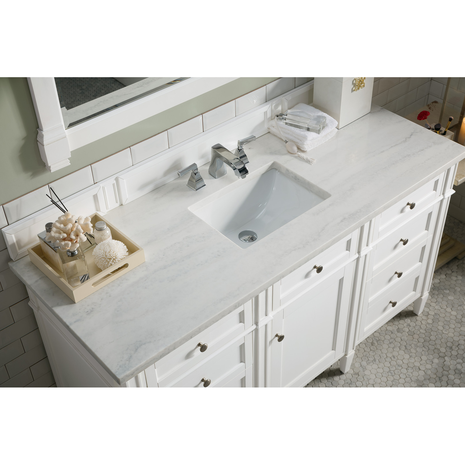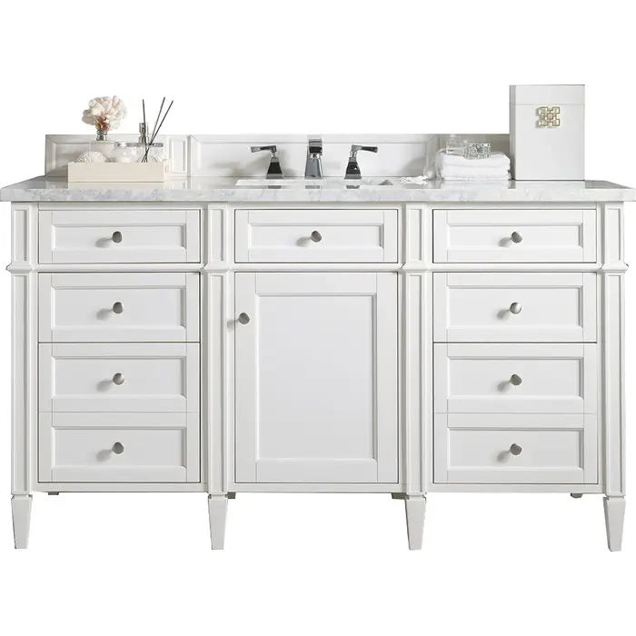 The Brittany 60" Bright White Single Vanity by James Martin Vanities features classic details that bridge both traditional and transitional styles. This beautiful piece of furniture includes one hide-away top row tip-out drawer, plus six full-depth drawers, two of which are double-height for storage of taller items. This cabinet also has one door, which conceals an interior shelf for ample storage. Hand crafted in yellow poplar solids and yellow poplar veneers with Satin Nickel hardware. Matching wood backsplash is included. Completing this beautiful vanity is a 3 cm solid surface Arctic Fall vanity top, which displays horizontal grey veining, giving you the look of classic marble with the benefits of modern technology.3 CM eased edge Arctic Fall Solid Surface top, pre-drilled for eight inch widespread faucet, includes white porcelain rectangular sink that ships separately and includes mounting brackets for easy installation.Solid Poplar frame with Solid plywood panels.Matching wood backsplash includedTwo door double vanity with six drawers and interior shelf space; top outside drawers are tip-out styleSatin Nickel HardwareSoft-close undermount drawer glides and soft-close door hingesCabinet is finished inside and out with an premium undercoat finish for superior moisture and UV resistanceDrawer bottoms are lined with our signature brushed aluminum laminateOur most popular collection, the Brittany was thoughtfully crafted to combine both traditional and modern style. The tapered legs are a recognizable nod to the past, while the straight lines and shaker-style detailing suggest a more contemporary aesthetic. Available in eight beautiful finishes, Brittany's versatile design blends seamlessly with a wide range of interior styling, while the expansive storage options make this collection a functional solution for any bathroom.1 year warranty against manufacturer's defects. We will repair or replace any defective product, if the product is defective in material or workmanship at our discretion. No warranty is expressed or implied regarding damages resulting from consumer misuse.