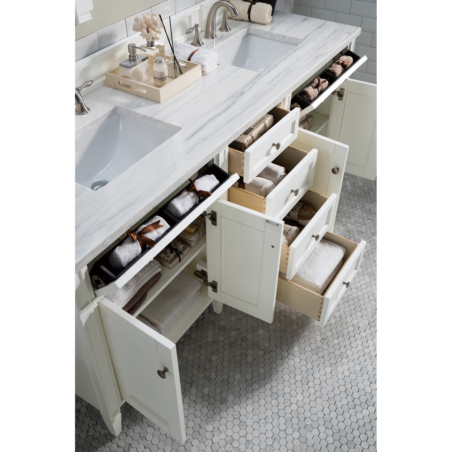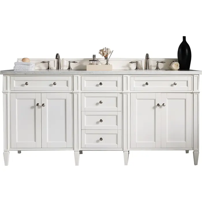 The 72" Brittany Double Vanity in Bright White by James Martin Vanities features optimal organization with two hide-away tip-out drawers plus four center drawers. This cabinet has two sets of doors, each concealing an interior shelf. All drawers are lined with an aluminum laminate surface for easy cleaning and are equipped with undermount soft-close slides. Completing this beautiful vanity is a 3 cm solid surface Arctic Fall vanity top, which displays horizontal grey veining, giving you the look of classic marble with the benefits of modern technology.3cm eased edge Arctic Fall Solid Surface top, pre-drilled for eight inch widespread faucet, includes white porcelain rectangular sinks that ship separately and includes mounting brackets for easy installation. Solid Surface Tops are beautifully consistenSolid Poplar frame with solid plywood panels.Matching wood backsplash includedFour door double vanity cabinet with six drawers and interior shelf space; top outside drawers are tip-out styleSatin Nickel HardwareSoft-close undermount drawer glides and soft-close door hingesCabinet is finished inside and out with an premium undercoat finish for superior moisture and UV resistanceDrawer bottoms are lined with our signature brushed aluminum laminateCountertop is pre-drilled for two 3-hole 8" spreadsFaucets sold separatelyOur most popular collection, the Brittany was thoughtfully crafted to combine both traditional and modern style. The tapered legs are a recognizable nod to the past, while the straight lines and shaker-style detailing suggest a more contemporary aesthetic. Available in eight beautiful finishes, Brittany's versatile design blends seamlessly with a wide range of interior styling, while the expansive storage options make this collection a functional solution for any bathroom.1 year warranty against manufacturer's defects. We will repair or replace any defective product, if the product is defective in material or workmanship at our discretion. No warranty is expressed or implied regarding damages resulting from consumer misuse.