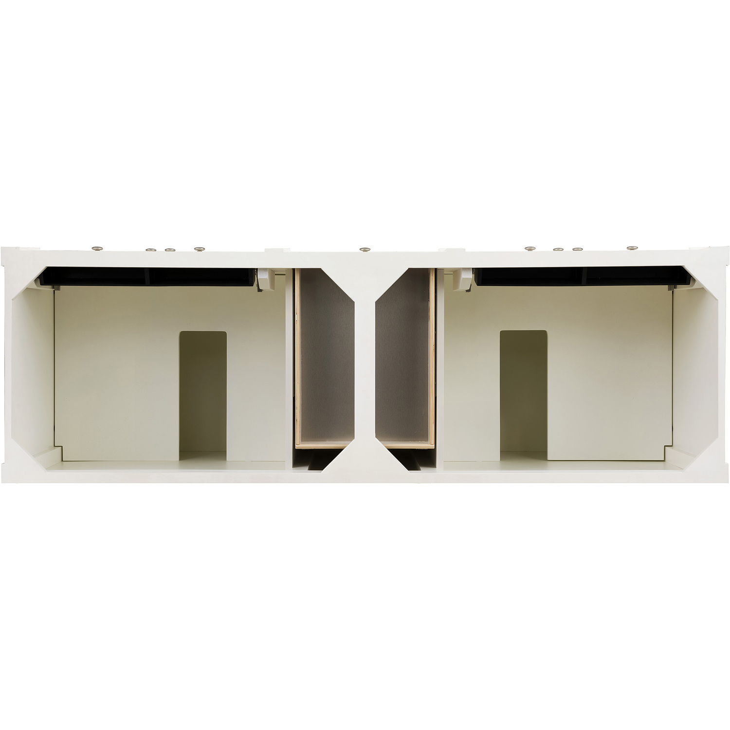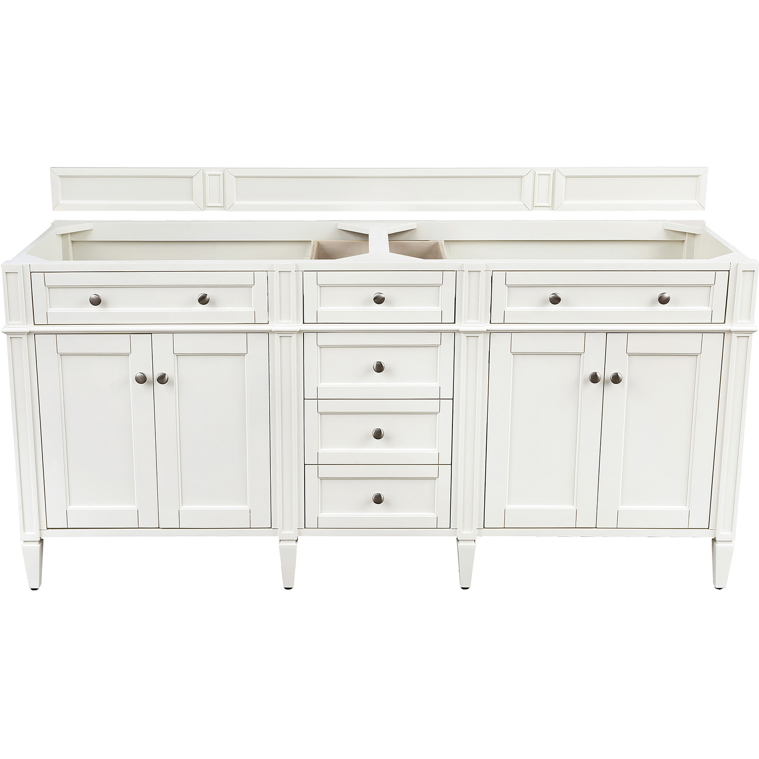 The 72" Brittany Double Vanity in Bright White by James Martin Vanities features optimal organization with two hide-away tip-out drawers plus four center drawers. This cabinet has two sets of doors, each concealing an interior shelf. All drawers are linSelect one of our coordinating 3 cm tops with undermount, white porcelain sink.Solid Poplar frame with solid plywood panels.Matching wood backsplash includedFour door double vanity cabinet with six drawers and interior shelf space; top outside drawers are tip-out styleSatin Nickel HardwareSoft-close undermount drawer glides and soft-close door hingesCabinet is finished inside and out with an premium undercoat finish for superior moisture and UV resistanceDrawer bottoms are lined with our signature brushed aluminum laminateSubtle luxury. James Martin Vanities most popular collection, Brittany, was designed to merge traditional and transitional tastes. The tapered legs are an nod to the past, but the restrained use of ornamentation suggests an modern aesthetic. Interior spac1 year warranty against manufacturer's defects. We will repair or replace any defective product, if the product is defective in material or workmanship at our discretion. No warranty is expressed or implied regarding damages resulting from consumer misuse.