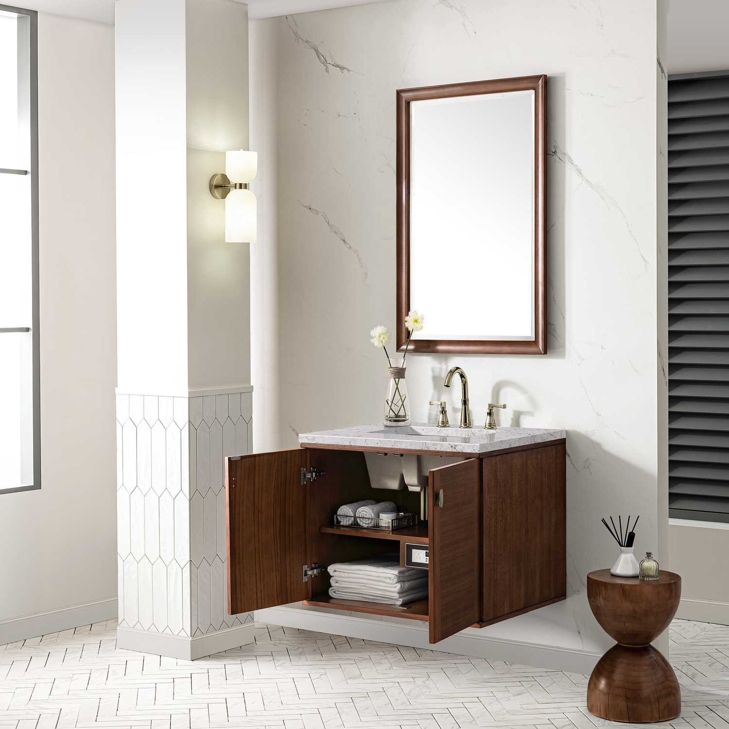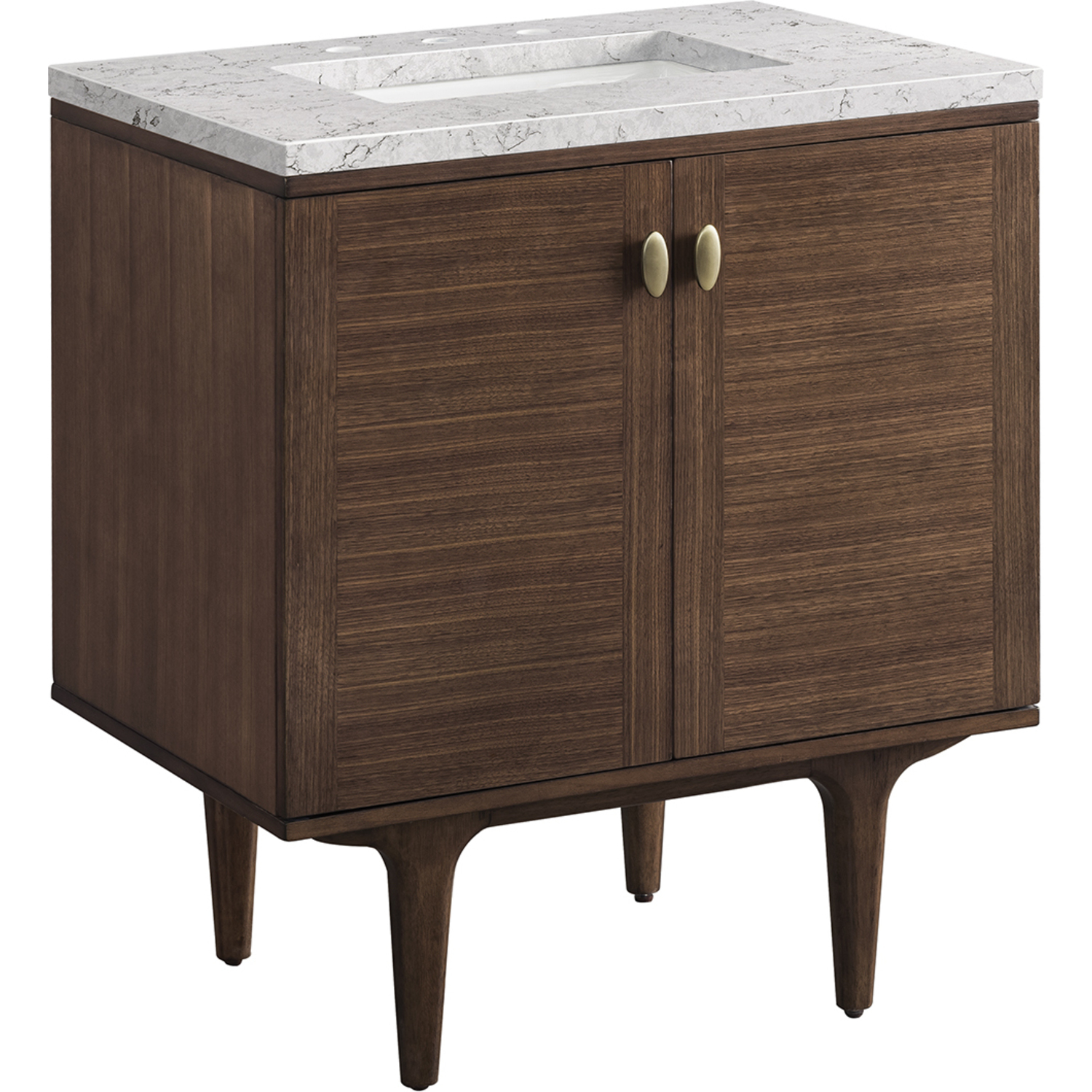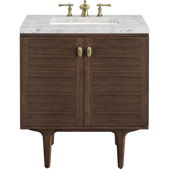 James Martin Amberly 30 inch Single Bathroom Vanity, Mid-Century Walnut w/ 3 CM Eternal Jasmine Pearl Top 670-V30-WLT-3EJP