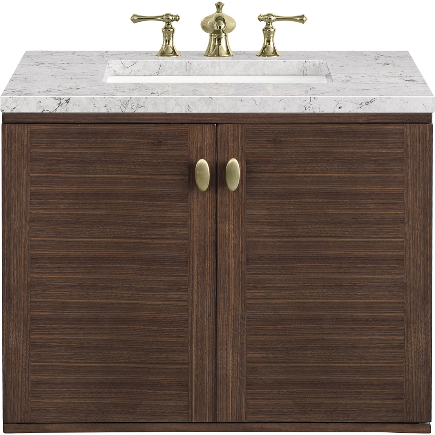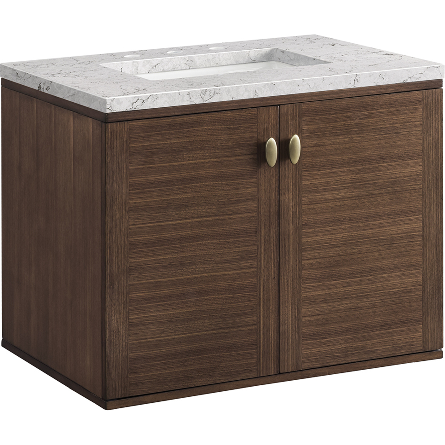 The 30" Amberly Single Vanity celebrates Mid-Century simplistic forms and finish details combined with practical function. The beauty of the natural grains in the walnut veneer steals the show, while the decorative, oval knobs in Champagne Brass provide the perfect accent. This two-door cabinet opens to a spacious interior with a single shelf and a convenient USB/Electric power outlet. The elegant wood base elevates the Vanity Cabinet in a true console style, though you may choose the more modern, space-saving wall-mount option. The 3 cm, eased edge Eternal Jasmine Pearl Silestone top completes the look.3 CM eased edge Eternal Jasmine Pearl Silestone top includes a white porcelain rectangular sink that ships separately and includes mounting brackets for easy installation. Faucet not included.Constructed from Para wood solids and quarter cut Walnut veneers over plywood coreSoft-close door hingesSingle door cabinet with one shelfDual Power and USB portsThis cabinet may be installed with the wood base as a free standing vanity or mounted to the wall as a floating vanity. All mounting hardware is included.Oval shaped knobs in Champagne Brass FinishMade specifically for our 3 CM Silestone countertops, these porcelain sinks are rated for both residential and commercial useThe Mid-Century Modern inspired Amberly collection showcases a rich walnut wood cabinet, set elegantly atop subtly curved legs, and accented with oval Champagne Brass pulls. Floating or freestanding, Amberly is an eye-catching focal point for any luxury bathroom décor.1 year warranty against manufacturer's defects. We will repair or replace any defective product, if the product is defective in material or workmanship at our discretion. No warranty is expressed or implied regarding damages resulting from consumer misuse.