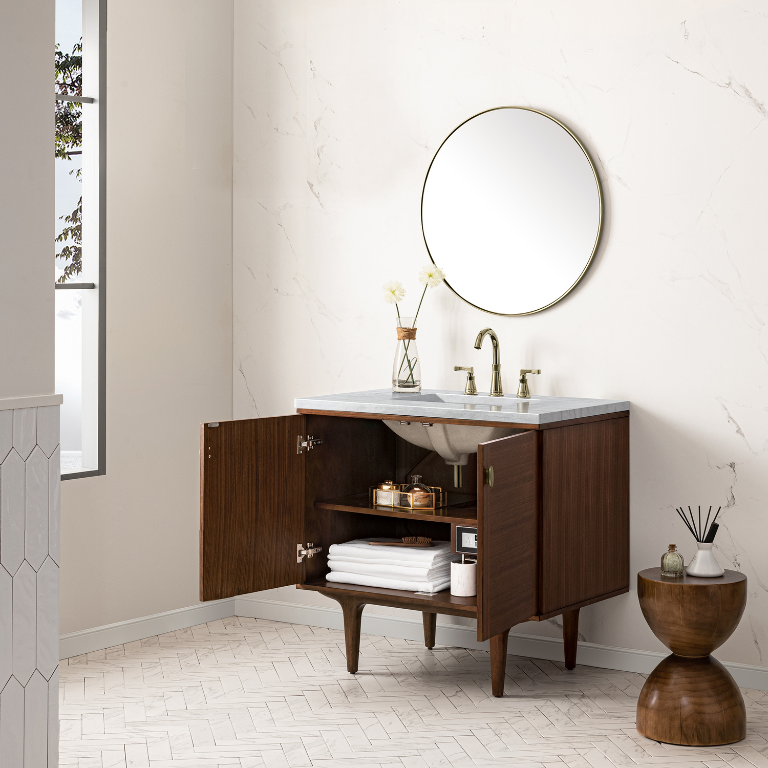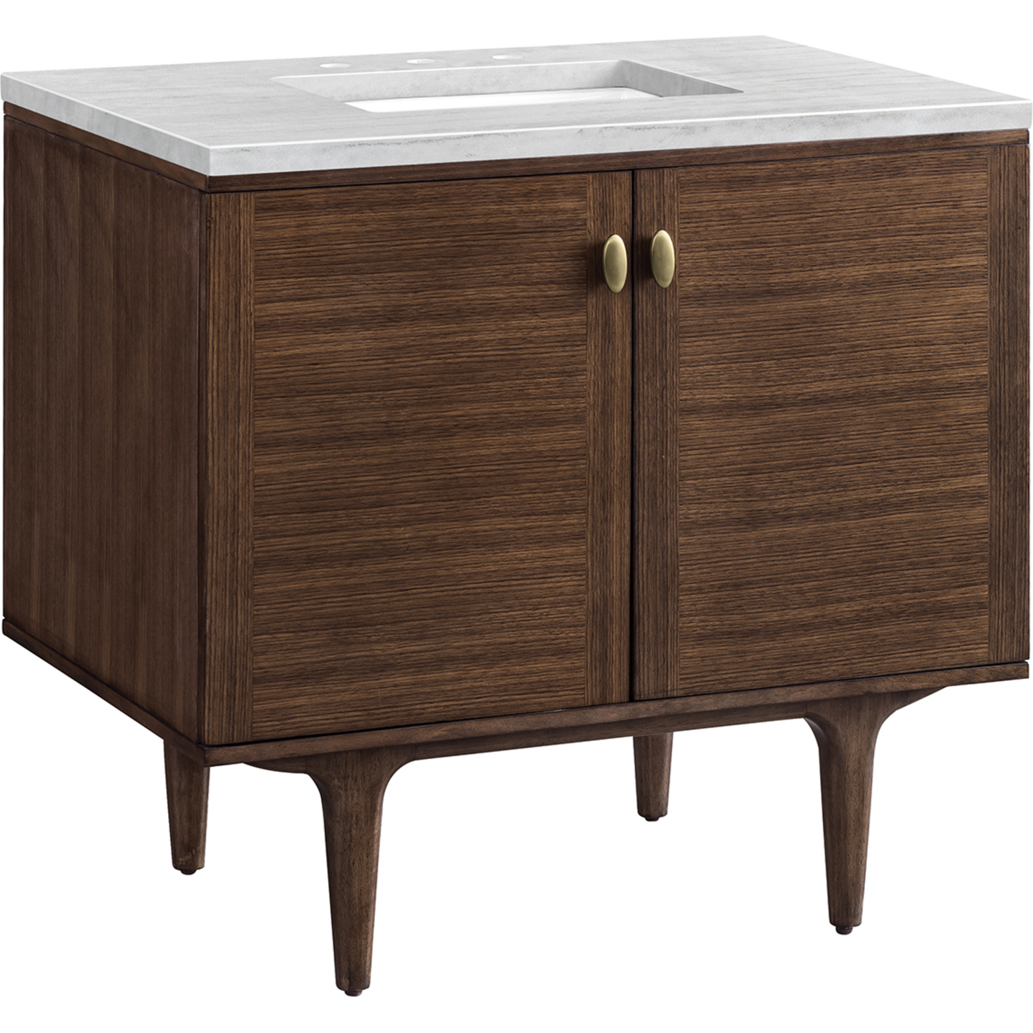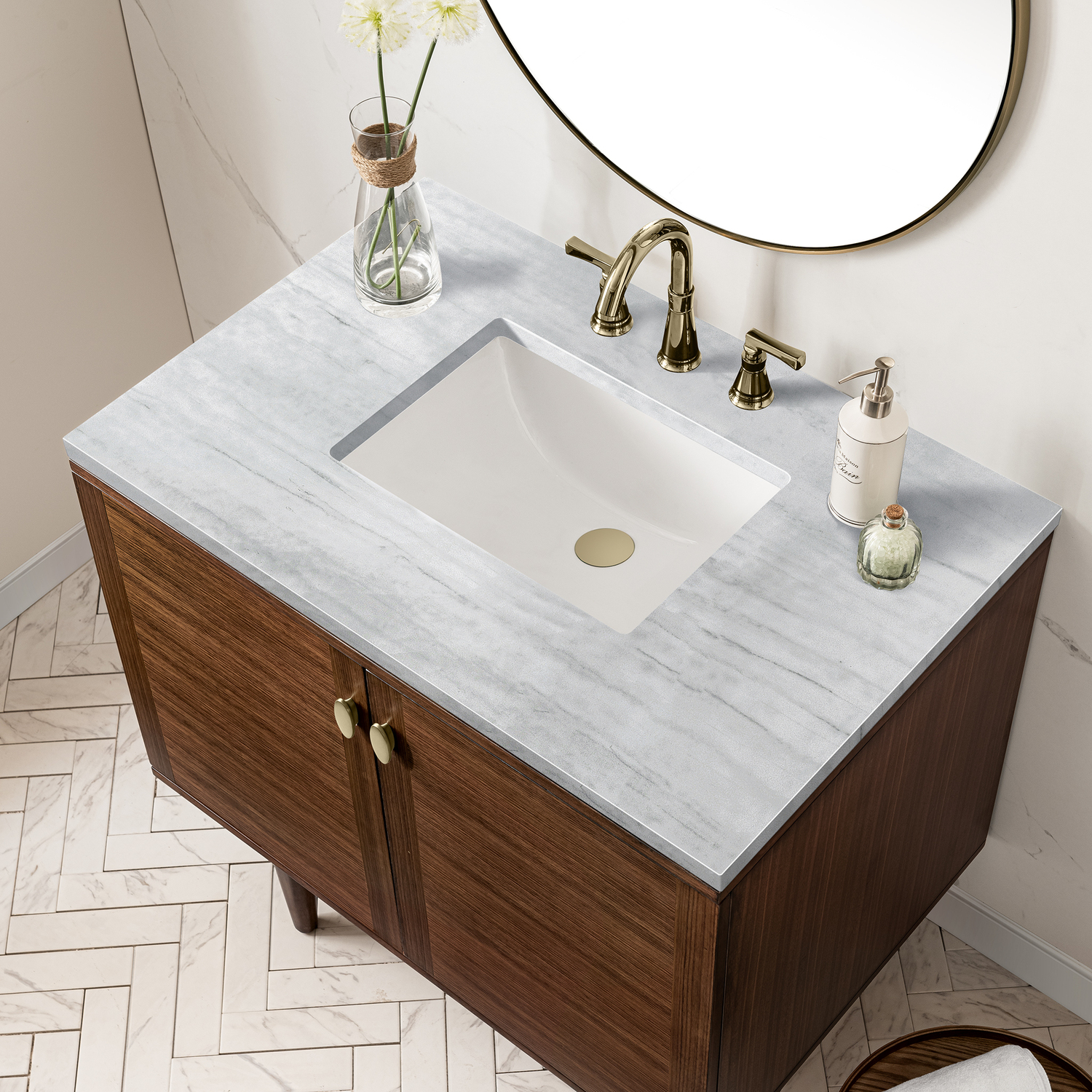 - The Mid-Century Modern inspired Amberly collection showcases a rich walnut wood cabinet, set elegantly atop subtly curved legs, and accented with oval Champagne Brass pulls. Floating or freestanding, Amberly is an eye-catching focal point for any luxury bathroom décor.
