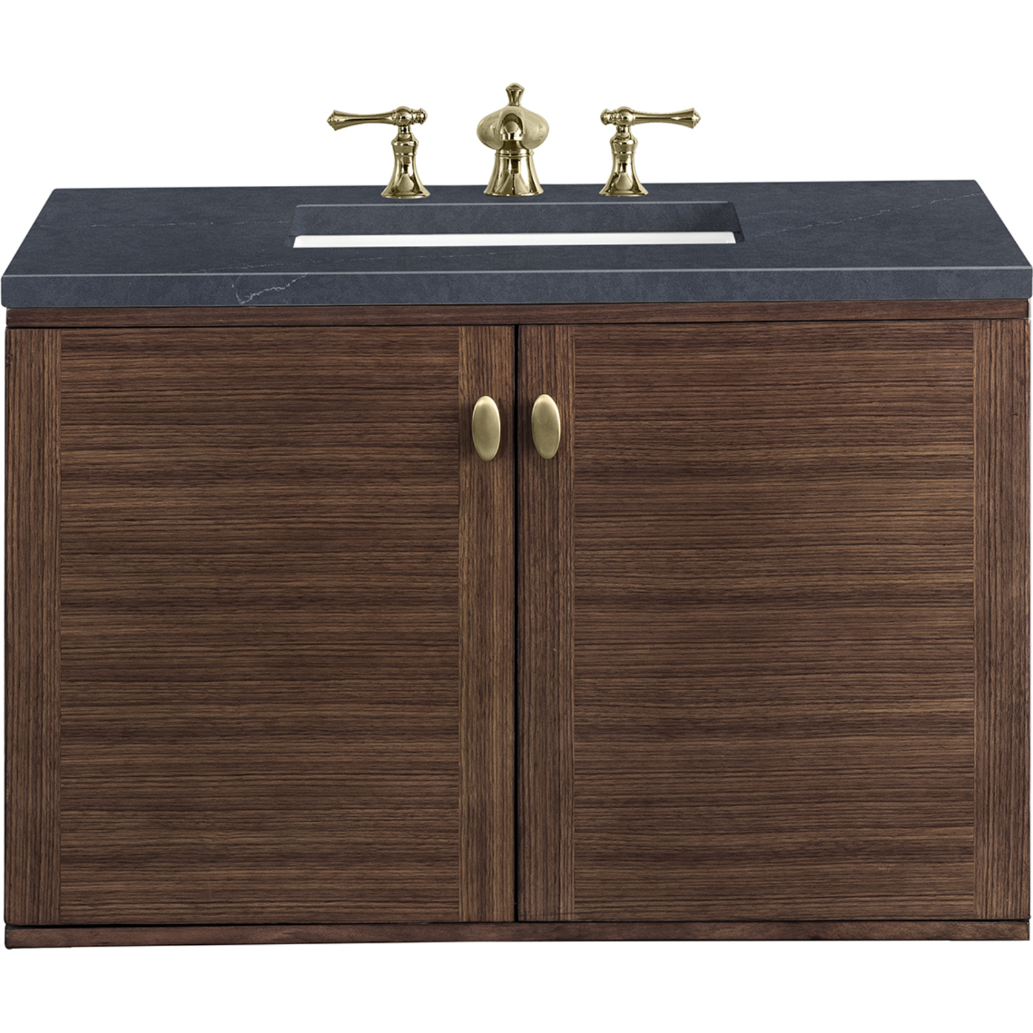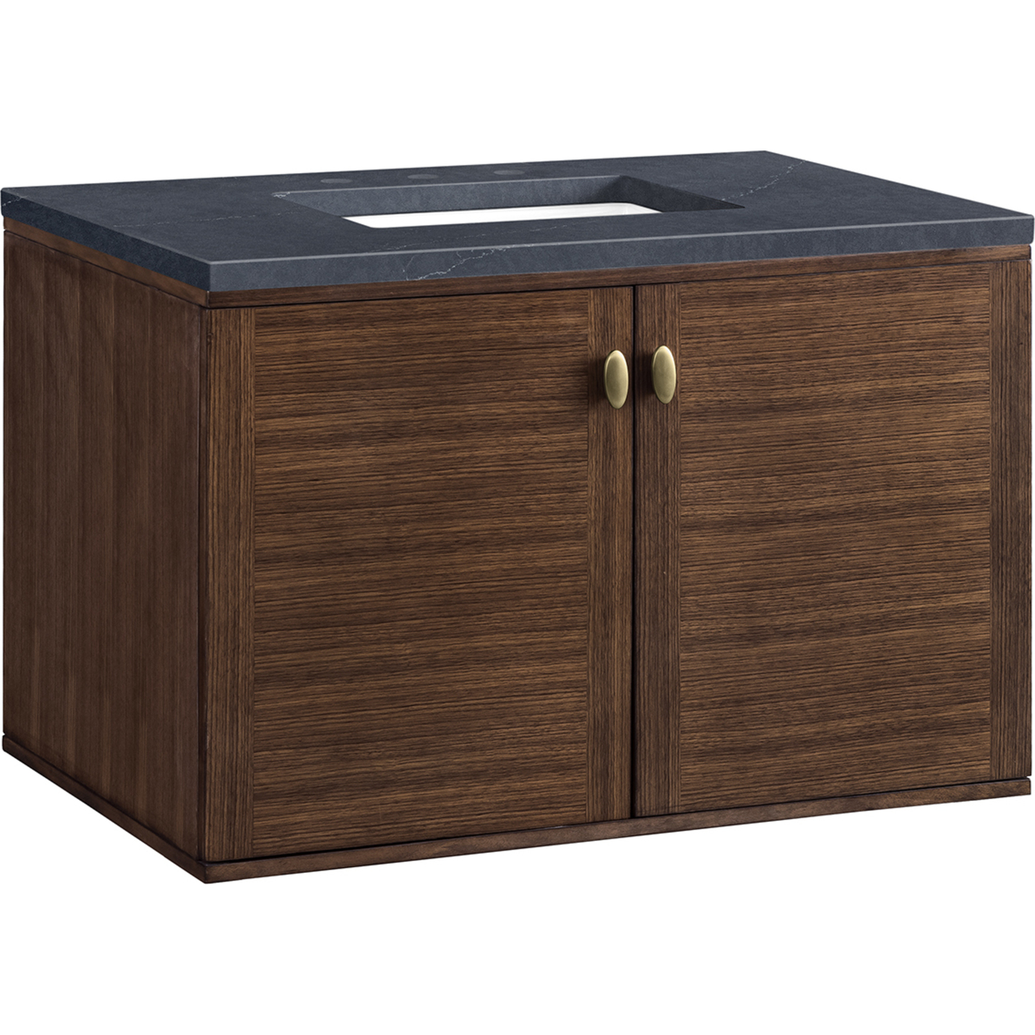 The 36" Amberly Single Vanity celebrates Mid-Century simplistic forms and finish details combined with practical function. The beauty of the natural grains in the walnut veneer steals the show, while the decorative, oval knobs in Champagne Brass provide the perfect accent. This two-door cabinet opens to a spacious interior with a single shelf and a convenient USB/Electric power outlet. The elegant wood base elevates the Vanity Cabinet in a true console style, though you may choose the more modern, space-saving wall-mount option. The 3 cm, eased-edge Charcoal Soapstone Silestone top completes the look.3 CM eased edge Charcoal Soapstone Silestone top includes a white porcelain rectangular sink that ships separately and includes mounting brackets for easy installation. Faucet not included.Constructed from Para wood solids and quarter cut Walnut veneers over plywood coreSoft-close door hingesSingle door cabinet with one shelfDual Power and USB portsThis cabinet may be installed with the wood base as a free standing vanity or mounted to the wall as a floating vanity. All mounting hardware is included.Oval shaped knobs in Champagne Brass FinishMade specifically for our 3 CM Silestone countertops, these porcelain sinks are rated for both residential and commercial useThe Mid-Century Modern inspired Amberly collection showcases a rich walnut wood cabinet, set elegantly atop subtly curved legs, and accented with oval Champagne Brass pulls. Floating or freestanding, Amberly is an eye-catching focal point for any luxury bathroom décor.1 year warranty against manufacturer's defects. We will repair or replace any defective product, if the product is defective in material or workmanship at our discretion. No warranty is expressed or implied regarding damages resulting from consumer misuse.