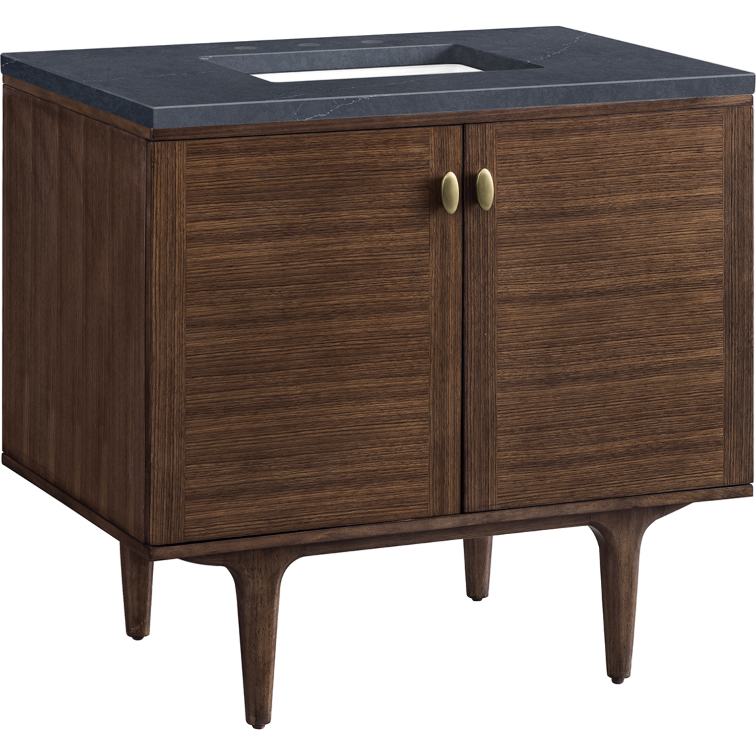 - The Mid-Century Modern inspired Amberly collection showcases a rich walnut wood cabinet, set elegantly atop subtly curved legs, and accented with oval Champagne Brass pulls. Floating or freestanding, Amberly is an eye-catching focal point for any luxury bathroom décor.
