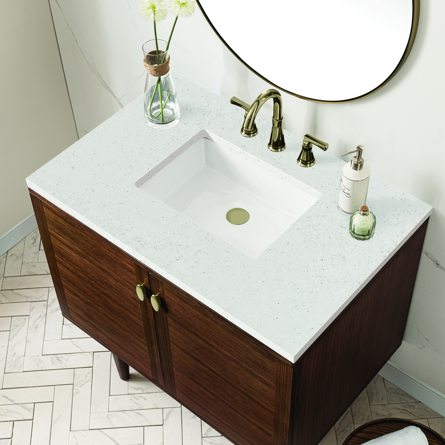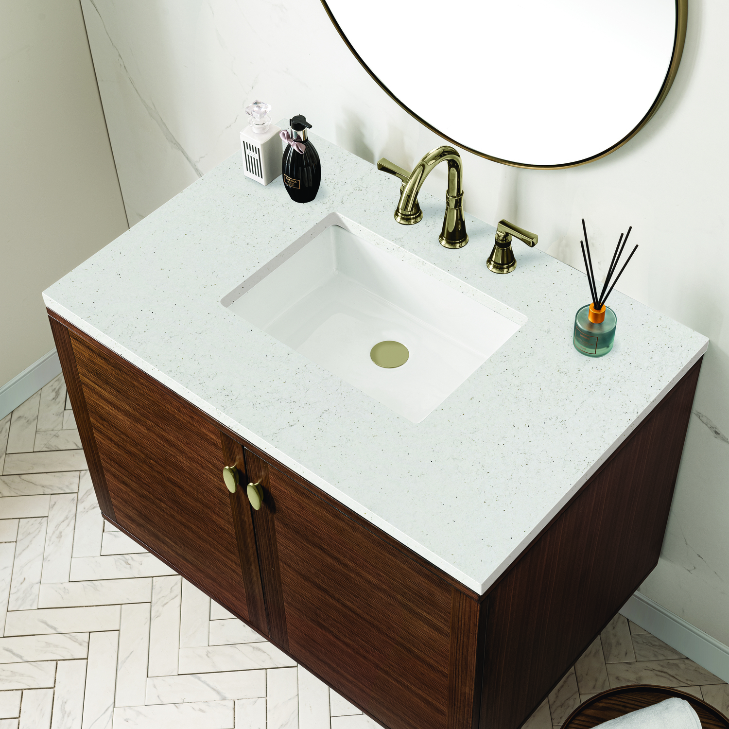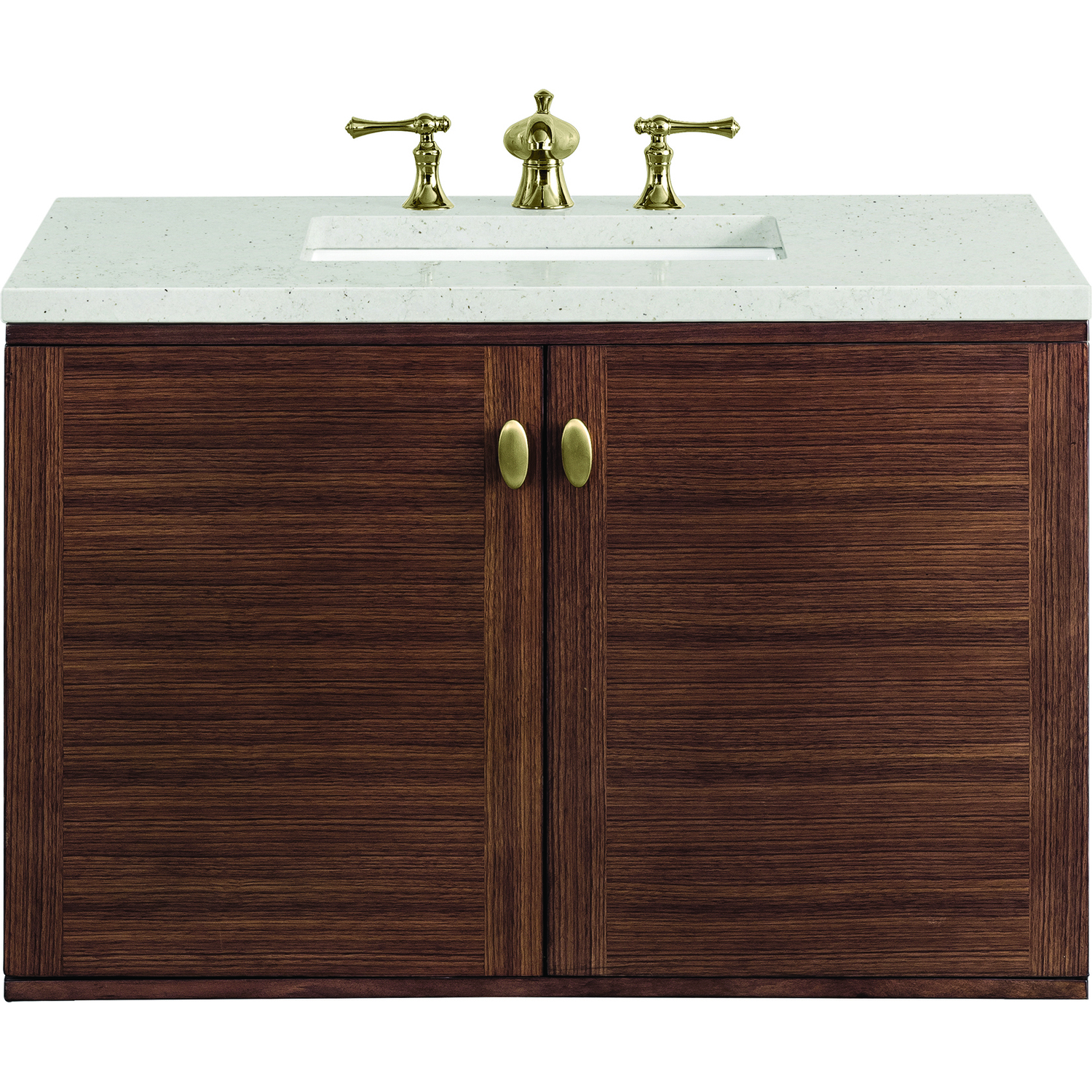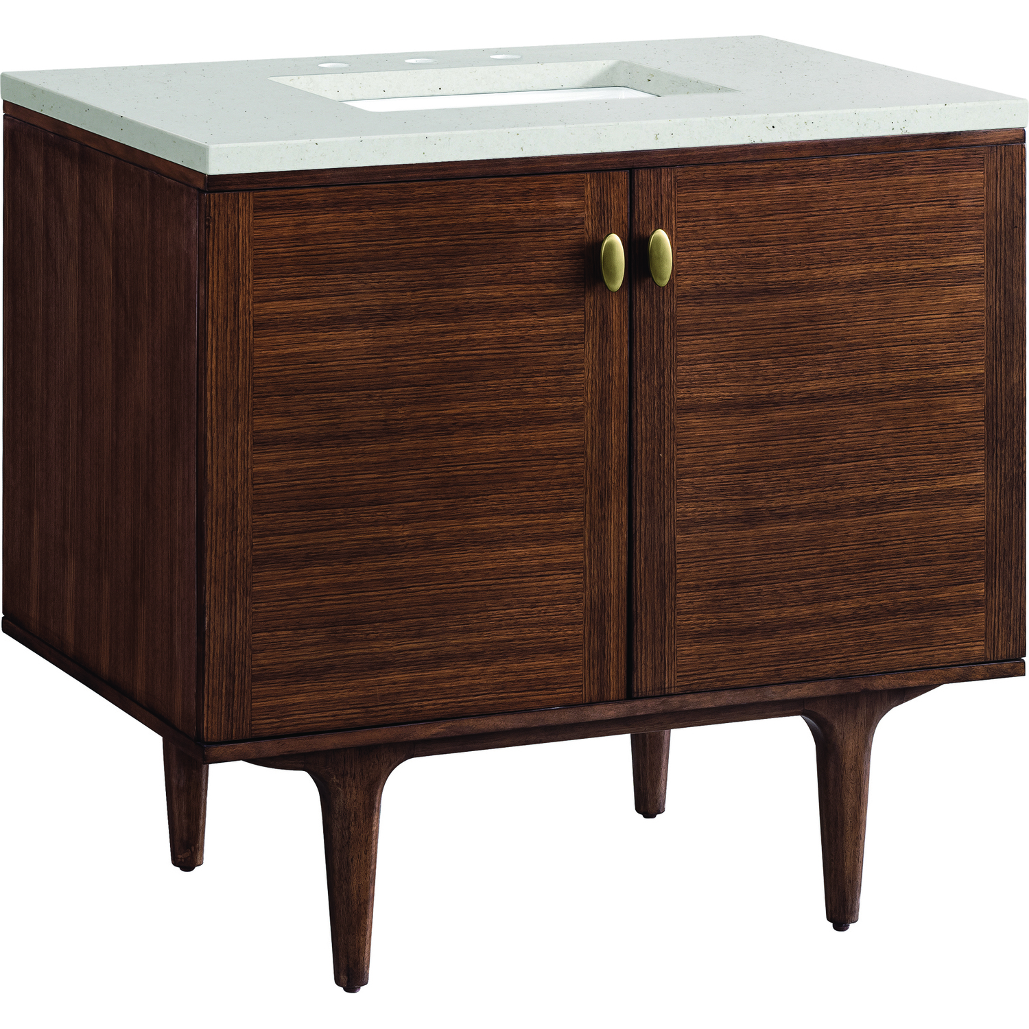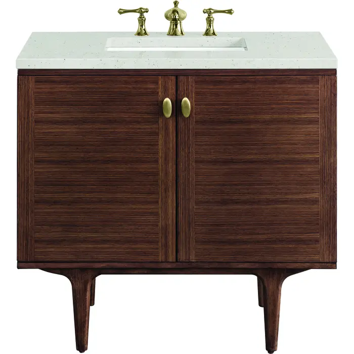 The 36" Amberly Single Vanity celebrates Mid-Century simplistic forms and finish details combined with practical function. The beauty of the natural grains in the Walnut veneer steals the show, while the decorative, oval knobs in Champagne Brass provide the perfect accent. This two-door cabinet opens to a spacious interior with a single shelf and a convenient USB/Electric power outlet. The elegant wood base elevates the vanity cabinet in a true console style, though you may choose the more modern, space-saving wall-mount option. The Lime Delight Silestone top lends warm, textured beige tones to perfectly complement the finish on the vanity.Vanity set includes a 3cm eased edge Limestone Delight Silestone top. Includes a white porcelain rectangular undermount sink that ships separately and mounting brackets for easy installation. Top is pre-drilled for 8" widespread faucet. Faucet not includeSingle door cabinet with one shelfConstructed from Para wood solids and quarter cut Walnut veneers over plywood coreCabinet doors feature adjustable, soft-close hinges.Polished Chrome hardwareThis cabinet may be installed with the wood base as a free standing vanity or mounted to the wall as a floating vanity. All mounting hardware is included.Includes a 120 UL-rated electrical component with dual power outlets and USB (Type A) portsFaucet sold separatelyCountertop is pre-drilled for one 3-hole 8" spreadThe Mid-Century Modern inspired Amberly collection showcases a rich walnut wood cabinet, set elegantly atop subtly curved legs, and accented with oval Champagne Brass pulls. Floating or freestanding, Amberly is an eye-catching focal point for any luxury bathroom décor.1 year warranty against manufacturer's defects. We will repair or replace any defective product, if the product is defective in material or workmanship at our discretion. No warranty is expressed or implied regarding damages resulting from consumer misuse.