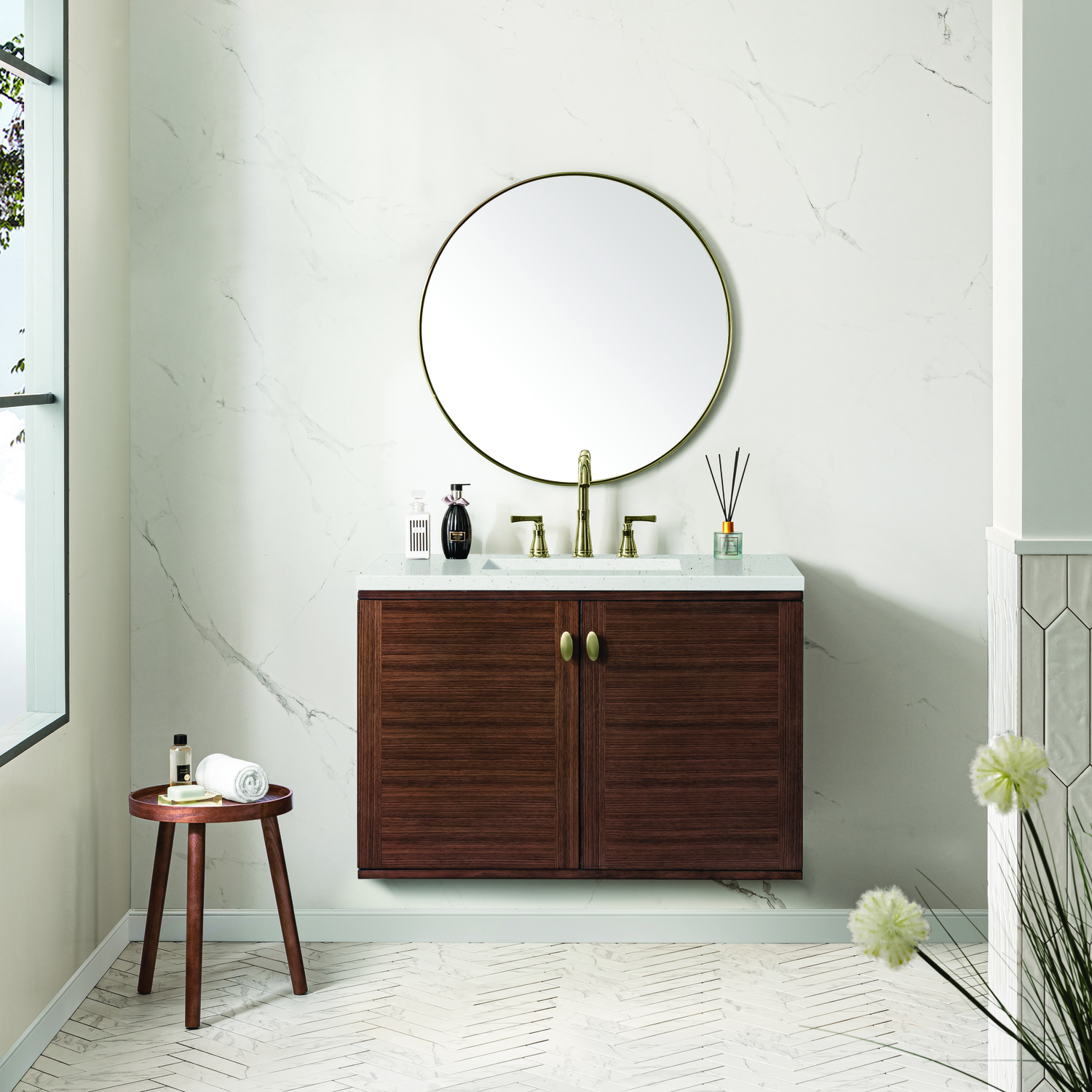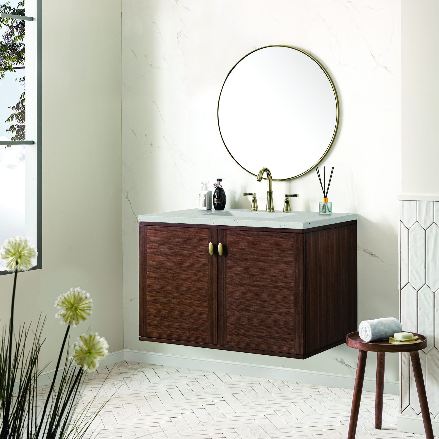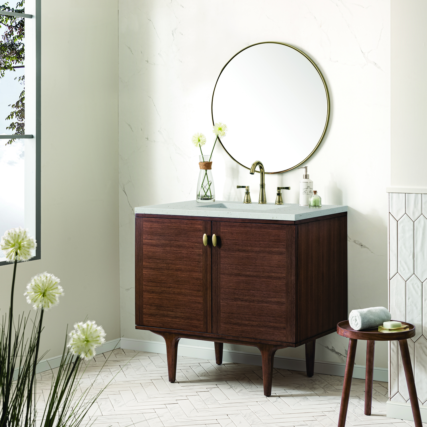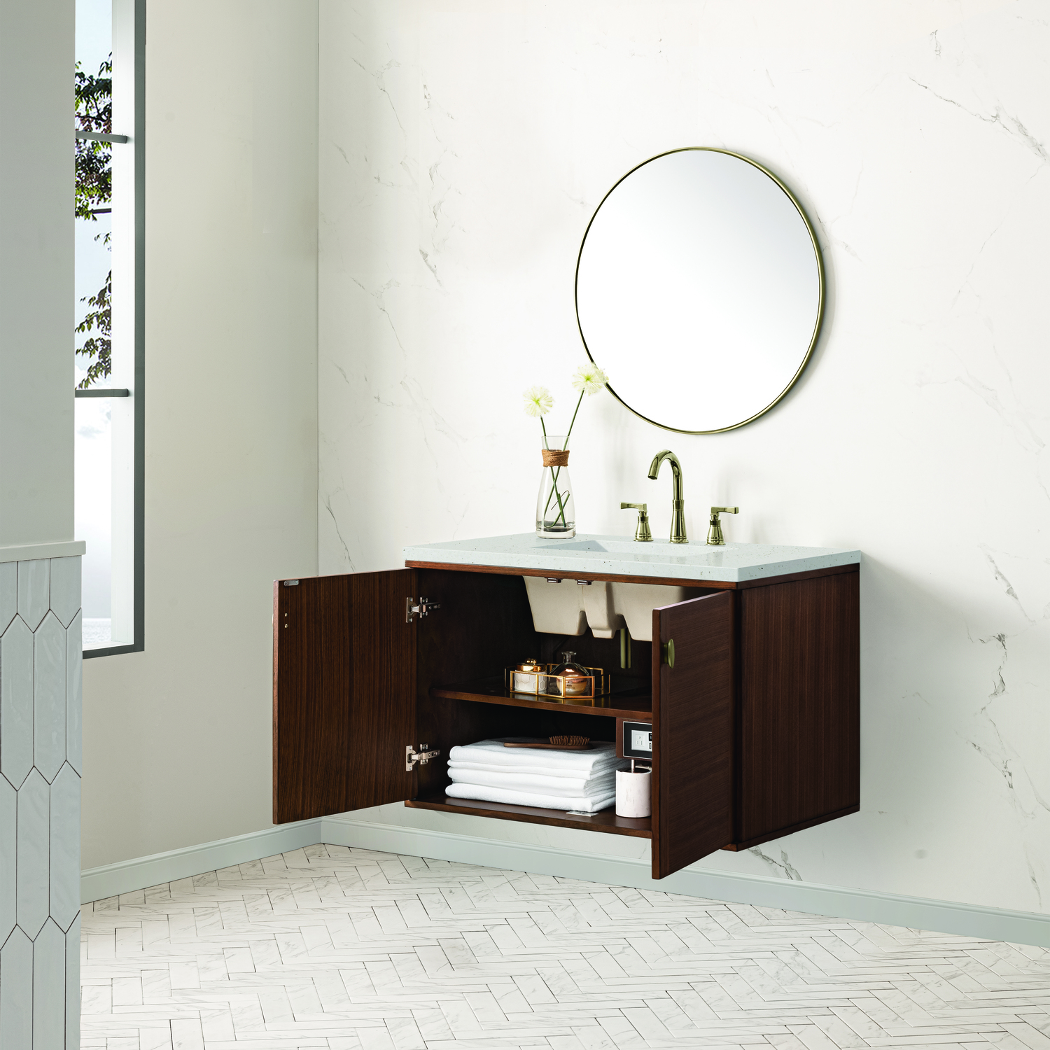 The 36" Amberly Single Vanity celebrates Mid-Century simplistic forms and finish details combined with practical function. The beauty of the natural grains in the Walnut veneer steals the show, while the decorative, oval knobs in Champagne Brass provide the perfect accent. This two-door cabinet opens to a spacious interior with a single shelf and a convenient USB/Electric power outlet. The elegant wood base elevates the vanity cabinet in a true console style, though you may choose the more modern, space-saving wall-mount option. The Lime Delight Silestone top lends warm, textured beige tones to perfectly complement the finish on the vanity.Vanity set includes a 3cm eased edge Limestone Delight Silestone top. Includes a white porcelain rectangular undermount sink that ships separately and mounting brackets for easy installation. Top is pre-drilled for 8" widespread faucet. Faucet not includeSingle door cabinet with one shelfConstructed from Para wood solids and quarter cut Walnut veneers over plywood coreCabinet doors feature adjustable, soft-close hinges.Polished Chrome hardwareThis cabinet may be installed with the wood base as a free standing vanity or mounted to the wall as a floating vanity. All mounting hardware is included.Includes a 120 UL-rated electrical component with dual power outlets and USB (Type A) portsFaucet sold separatelyCountertop is pre-drilled for one 3-hole 8" spreadThe Mid-Century Modern inspired Amberly collection showcases a rich walnut wood cabinet, set elegantly atop subtly curved legs, and accented with oval Champagne Brass pulls. Floating or freestanding, Amberly is an eye-catching focal point for any luxury bathroom décor.1 year warranty against manufacturer's defects. We will repair or replace any defective product, if the product is defective in material or workmanship at our discretion. No warranty is expressed or implied regarding damages resulting from consumer misuse.
