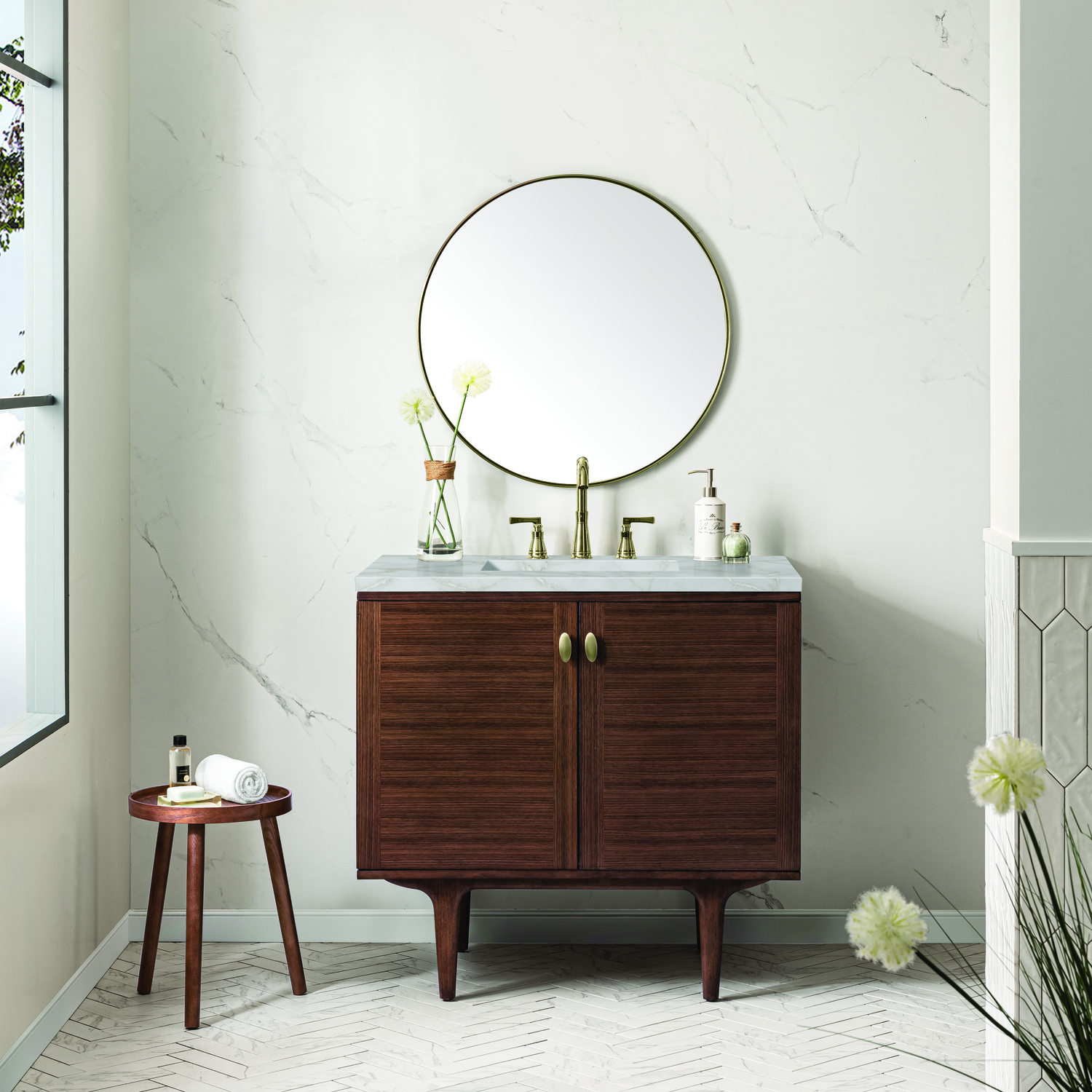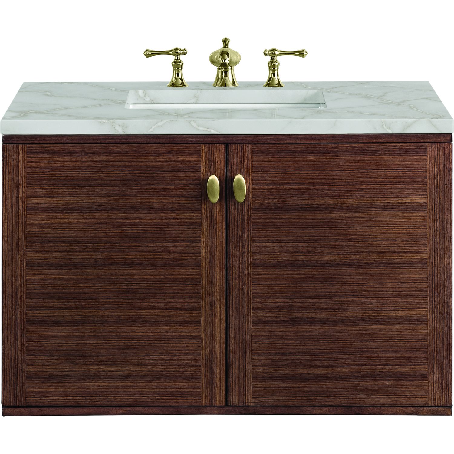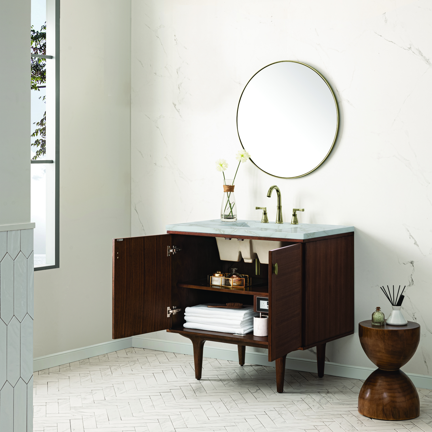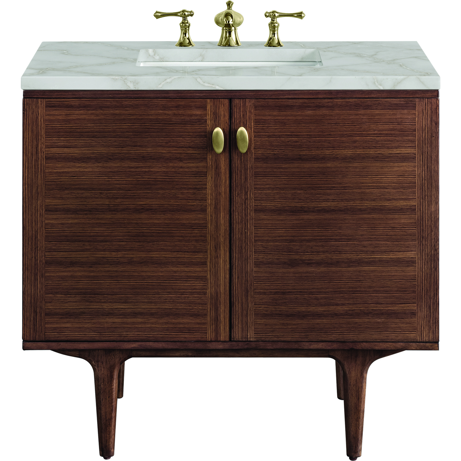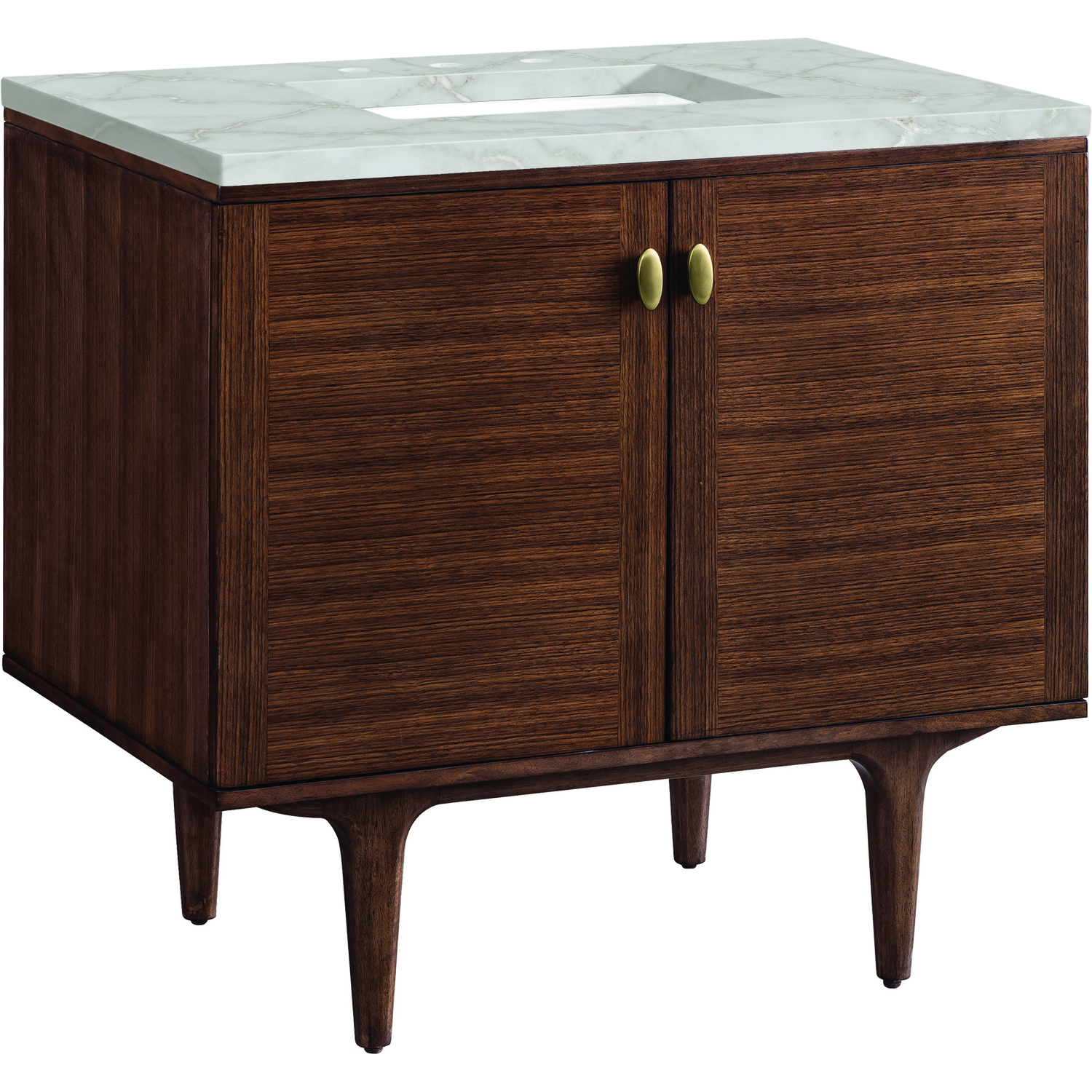The 36" Amberly Single Vanity celebrates Mid-Century simplistic forms and finish details combined with practical function. The beauty of the natural grains in the Walnut veneer steals the show, while the decorative, oval knobs in Champagne Brass provide the perfect accent. This two-door cabinet opens to a spacious interior with a single shelf and a convenient USB/Electric power outlet. The elegant wood base elevates the vanity cabinet in a true console style, though you may choose the more modern, space-saving wall-mount option. The Mid-Century Walnut finish is accented by the neutral background of the Victorian Silver Silestone top, boasting champagne metallic accents which seamlessly complement wood tones.Vanity set includes a 3cm eased edge Victorian Silver Silestone top, a white porcelain rectangular sink and mounting brackets for easy installation. Top is pre-drilled for an 8" widespread faucet. Faucet not included.Single door cabinet with one shelfConstructed from Para wood solids and quarter cut Walnut veneers over plywood coreCabinet doors feature adjustable, soft-close hinges.Polished Chrome hardwareThis cabinet may be installed with the wood base as a free standing vanity or mounted to the wall as a floating vanity. All mounting hardware is included.Includes a 120 UL-rated electrical component with dual power outlets and USB (Type A) portsFaucet sold separatelyCountertop is pre-drilled for one 3-hole 8" spreadThe Mid-Century Modern inspired Amberly collection showcases a rich walnut wood cabinet, set elegantly atop subtly curved legs, and accented with oval Champagne Brass pulls. Floating or freestanding, Amberly is an eye-catching focal point for any luxury bathroom décor.1 year warranty against manufacturer's defects. We will repair or replace any defective product, if the product is defective in material or workmanship at our discretion. No warranty is expressed or implied regarding damages resulting from consumer misuse.