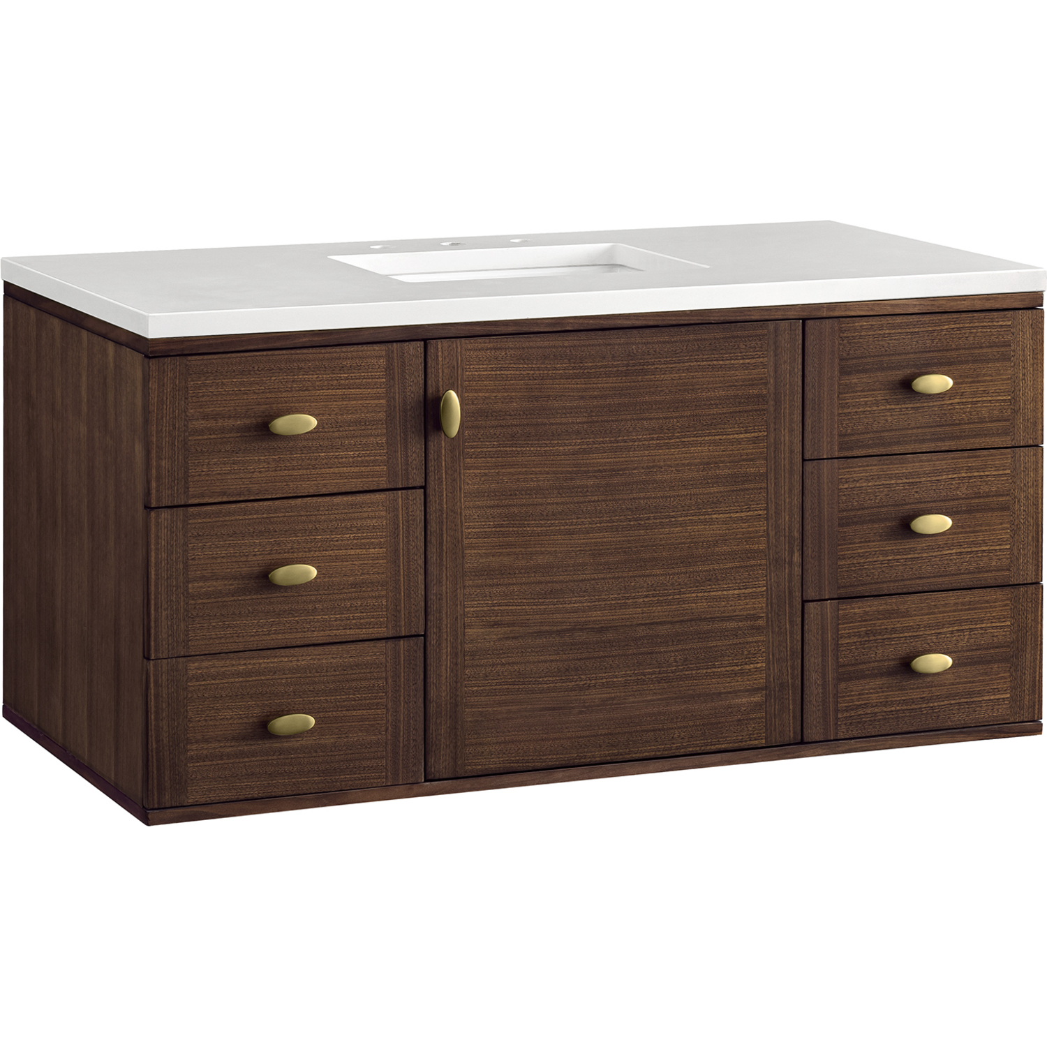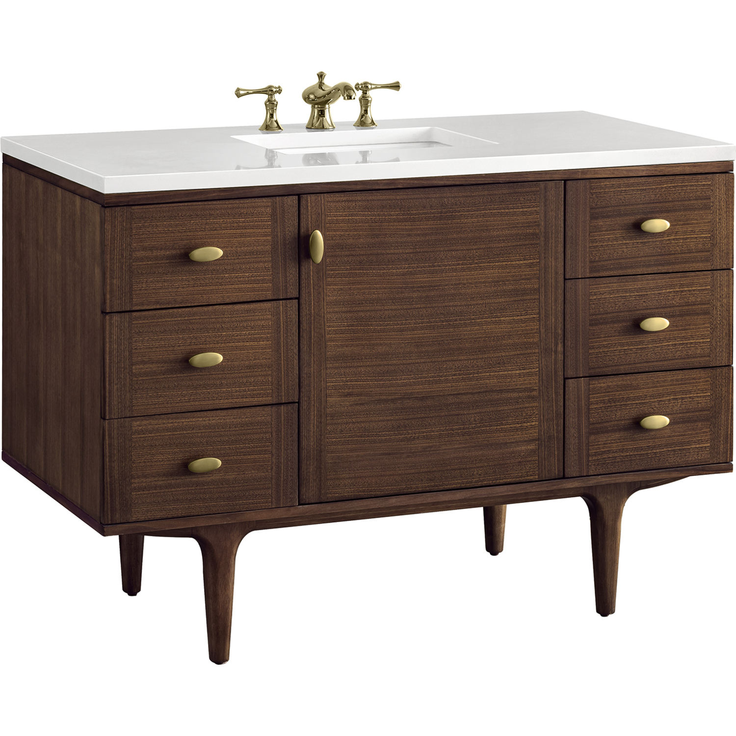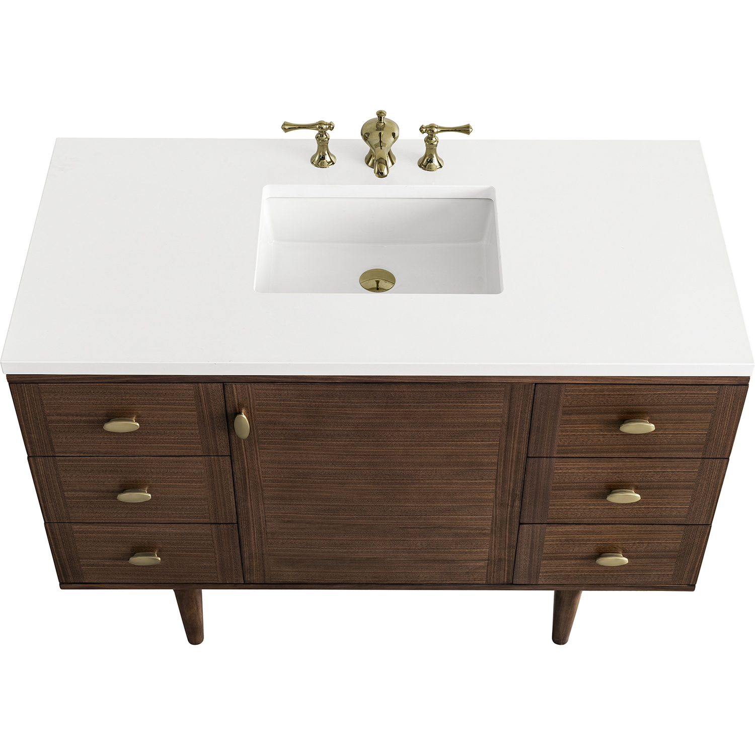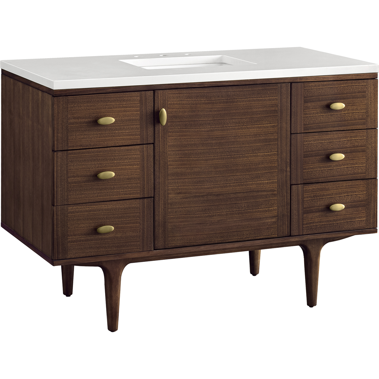 The 48" Amberly Single Vanity celebrates Mid-Century simplistic forms and finish details combined with practical function. The beauty of the natural grains in the walnut veneer steals the show, while the decorative, oval knobs in Champagne Brass provide the perfect accent. This single-door, the cabinet opens to a spacious interior with a single shelf and a convenient USB/Electric power outlet. Six drawers provide ample storage and include one removable bamboo organizer. The elegant wood base elevates the Vanity Cabinet in a true console style, though you may choose the more modern, space-saving wall-mount option. The 3 cm, eased edge Eternal Jasmine Pearl Silestone top completes the look.3 CM eased edge White Zeus Silestone top includes a white porcelain rectangular sink that ships separately and includes mounting brackets for easy installation. Faucet not included.Constructed from Para wood solids and quarter cut Walnut veneers over plywood corePlywood drawer boxes feature English Dovetail joinery and our signature brushed aluminum laminate drawer liners for easy cleaningSingle door cabinet with one shelf and six drawersDual Power and USB portsOne removeable Bamboo storage organizer trayThis cabinet may be installed with the wood base as a free standing vanity or mounted to the wall as a floating vanity. All mounting hardware is included.Oval shaped knobs in Champagne Brass FinishThe Mid-Century Modern inspired Amberly collection showcases a rich walnut wood cabinet, set elegantly atop subtly curved legs, and accented with oval Champagne Brass pulls. Floating or freestanding, Amberly is an eye-catching focal point for any luxury bathroom décor.1 year warranty against manufacturer's defects. We will repair or replace any defective product, if the product is defective in material or workmanship at our discretion. No warranty is expressed or implied regarding damages resulting from consumer misuse.