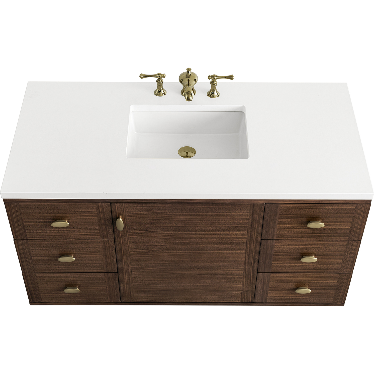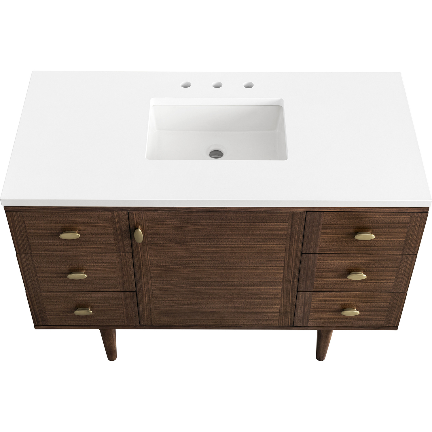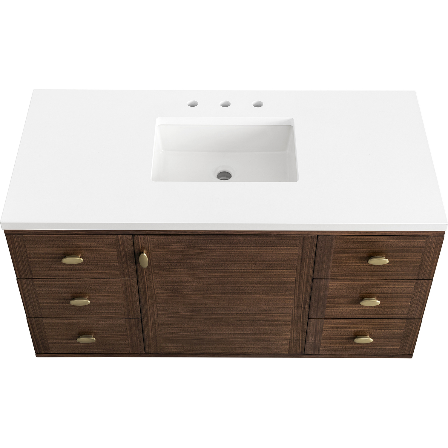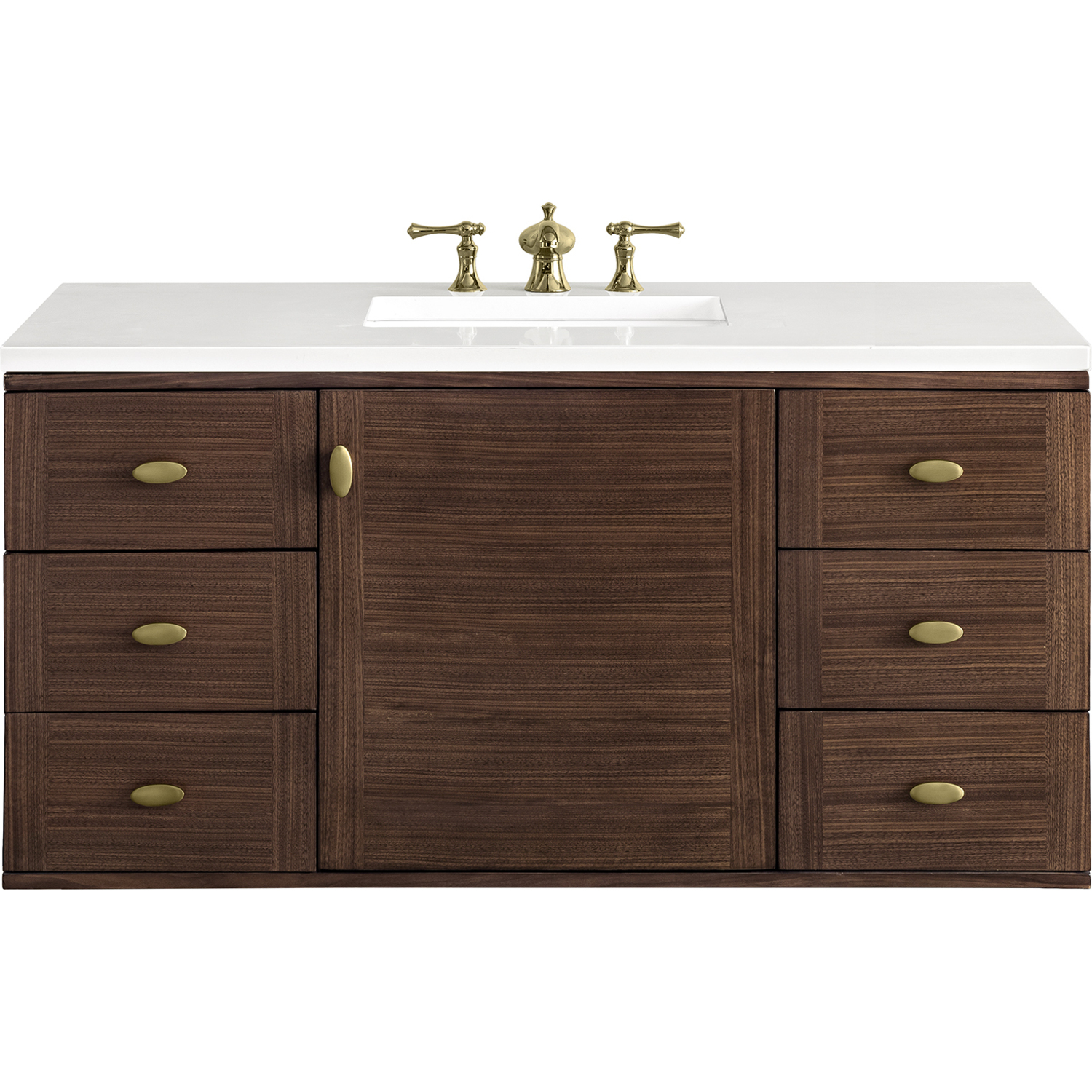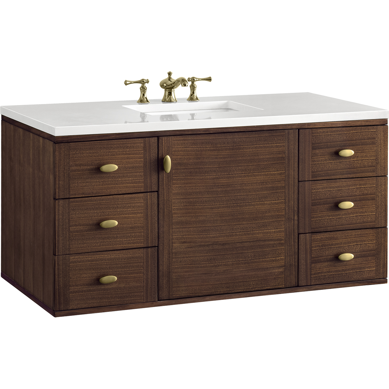 The 48" Amberly Single Vanity celebrates Mid-Century simplistic forms and finish details combined with practical function. The beauty of the natural grains in the walnut veneer steals the show, while the decorative, oval knobs in Champagne Brass provide the perfect accent. This single-door, the cabinet opens to a spacious interior with a single shelf and a convenient USB/Electric power outlet. Six drawers provide ample storage and include one removable bamboo organizer. The elegant wood base elevates the Vanity Cabinet in a true console style, though you may choose the more modern, space-saving wall-mount option. The 3 cm, eased edge Eternal Jasmine Pearl Silestone top completes the look.3 CM eased edge White Zeus Silestone top includes a white porcelain rectangular sink that ships separately and includes mounting brackets for easy installation. Faucet not included.Constructed from Para wood solids and quarter cut Walnut veneers over plywood corePlywood drawer boxes feature English Dovetail joinery and our signature brushed aluminum laminate drawer liners for easy cleaningSingle door cabinet with one shelf and six drawersDual Power and USB portsOne removeable Bamboo storage organizer trayThis cabinet may be installed with the wood base as a free standing vanity or mounted to the wall as a floating vanity. All mounting hardware is included.Oval shaped knobs in Champagne Brass FinishThe Mid-Century Modern inspired Amberly collection showcases a rich walnut wood cabinet, set elegantly atop subtly curved legs, and accented with oval Champagne Brass pulls. Floating or freestanding, Amberly is an eye-catching focal point for any luxury bathroom décor.1 year warranty against manufacturer's defects. We will repair or replace any defective product, if the product is defective in material or workmanship at our discretion. No warranty is expressed or implied regarding damages resulting from consumer misuse.