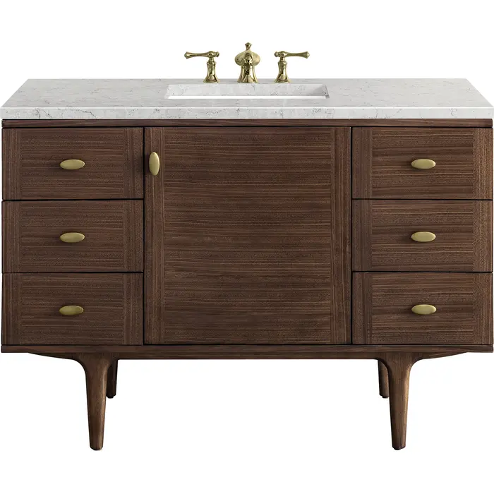 The Amberly 48" Single Vanity by James Martin Vanities celebrates Mid-Century Modern design by combining beautiful details with practical function. The beauty of the natural wood grain of the rich walnut veneers steal the show, while the decorative, oval knobs in Champagne Brass provide the perfect accent. This vanity features six drawers and a single-door cabinet that opens to a spacious interior with a single shelf and a convenient USB/120V power outlet. A removable drawer organizer is also included. The rich walnut cabinet sits atop a wood base with tapered legs, completing the Mid-Century Modern look, but can be removed for a more modern, space-saving wall-mount option. The cabinet is topped with a beautiful 3cm Eternal Jasmine Pearl Silestone® top with undermount sink. This unit is enabled with FreePower wireless charging; featuring a single-device charger seamlessly embedded into the countertop, indicated by a light-up halo to the left of the sink. Designed for modern living, FreePower offers convenient, integrated, wireless charging when and where you need it.FreePower Wireless Charging; single-device unit left of sinkSingle-door middle cabinet with interior shelf and six full-extension drawersDrawer boxes feature English Dovetail joinery with premium, soft-close undermount drawer slides and doors feature soft-close, adjustable door hingesCabinet features a multi-stage premium finish coat to offer UV and moisture resistanceMid-Century Walnut finish with oval-shaped knobs in Champagne BrassCountertop is pre-drilled for 8" widespread faucet(s); our 3cm eased edge countertops come with white porcelain rectangular sink(s) that ship separately and include mounting brackets for easy installationIntegrated USB/120V Outlet with USB PortsDrawers lined with our signature brushed aluminum laminate for easy cleaningRemovable bamboo drawer organizer includedMatching stone backsplash available as add-on purchaseDual-mounted: can be installed freestanding or floating with included French Cleat hardwareFaucet(s) sold separatelyThe Mid-Century Modern inspired Amberly Collection by James Martin Vanities showcases a rich walnut cabinet set elegantly atop subtly tapered legs, accented with oval Champagne Brass pulls. Floating or freestanding, Amberly is an eye-catching focal point for any luxury bathroom, imbuing the space with a touch of retro-chic charm and unparalleled elegance.1 year warranty against manufacturer's defects. We will repair or replace any defective product, if the product is defective in material or workmanship at our discretion. No warranty is expressed or implied regarding damages resulting from consumer misuse.
