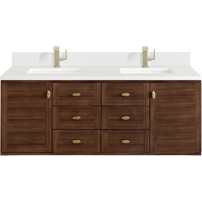 The 60" Amberly Double Vanity celebrates Mid-Century simplistic forms and finish details combined with practical function. The beauty of the natural grains in the Walnut veneer steals the show, while the decorative, oval knobs in Champagne Brass provide the perfect accent. This two-door cabinet opens to spacious interior storage with adjustable shelves and a convenient USB/Electric power outlet. Six drawers provide ample storage and include one removable bamboo organizer. The top row drawers are tip-out style. The elegant wood base elevates the vanity cabinet in a true console style, though you may choose the more modern, space-saving wall-mount option. The timeless, White Zeus Silestone top and backsplash provides a contemporary touch.Vanity set includes a 3cm eased edge White Zeus Silestone top with matching backsplash, two white porcelain rectangular sinks and mounting brackets for easy installation. Top is pre-drilled for two single hole faucets. Faucets not included.Two-door cabinet with two interior, adjustable height shelves, and six drawers; the top row drawers are tip-out style.Constructed from Para wood solids and quarter cut Walnut veneers over plywood core sealed inside and out with premium moisture and UV-resistant coatingsDrawer boxes are constructed using English Dovetail joinery, feature soft-close undermount glides and a Brushed Aluminum laminate drawer bottom.Polished Chrome hardwareIncludes one removable Bamboo drawer organizer trayThis cabinet may be installed with the wood base as a free standing vanity or mounted to the wall as a floating vanity. All mounting hardware is included.Includes a 120 UL-rated electrical component with dual power outlets and USB (Type A) portsMatching White Zeus 3cm Silestone backsplash included.Faucets sold separatelyThe Mid-Century Modern-inspired Amberly collection showcases a rich walnut wood cabinet set elegantly atop subtly curved legs and accented with oval Champagne Brass pulls. Floating or freestanding, Amberly is an eye-catching focal point for any luxury bathroom décor.1 year warranty against manufacturer's defects. We will repair or replace any defective product, if the product is defective in material or workmanship at our discretion. No warranty is expressed or implied regarding damages resulting from consumer misuse.