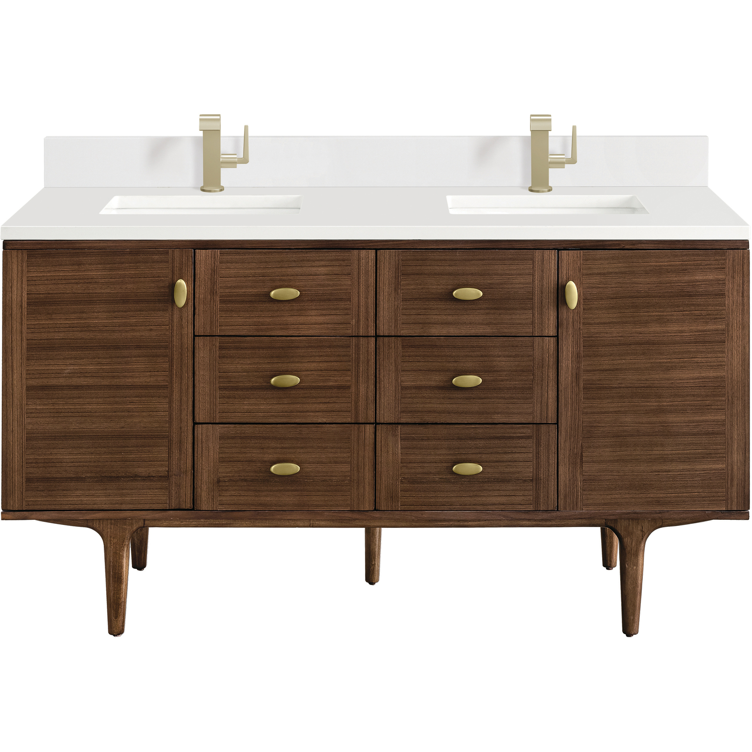 James Martin Amberly 60 inch Double Vanity, Mid-Century Walnut w/ Single Hole 3 CM White Zeus Top & Backsplash, 840108976681, 670-V60D-WLT-1WZ