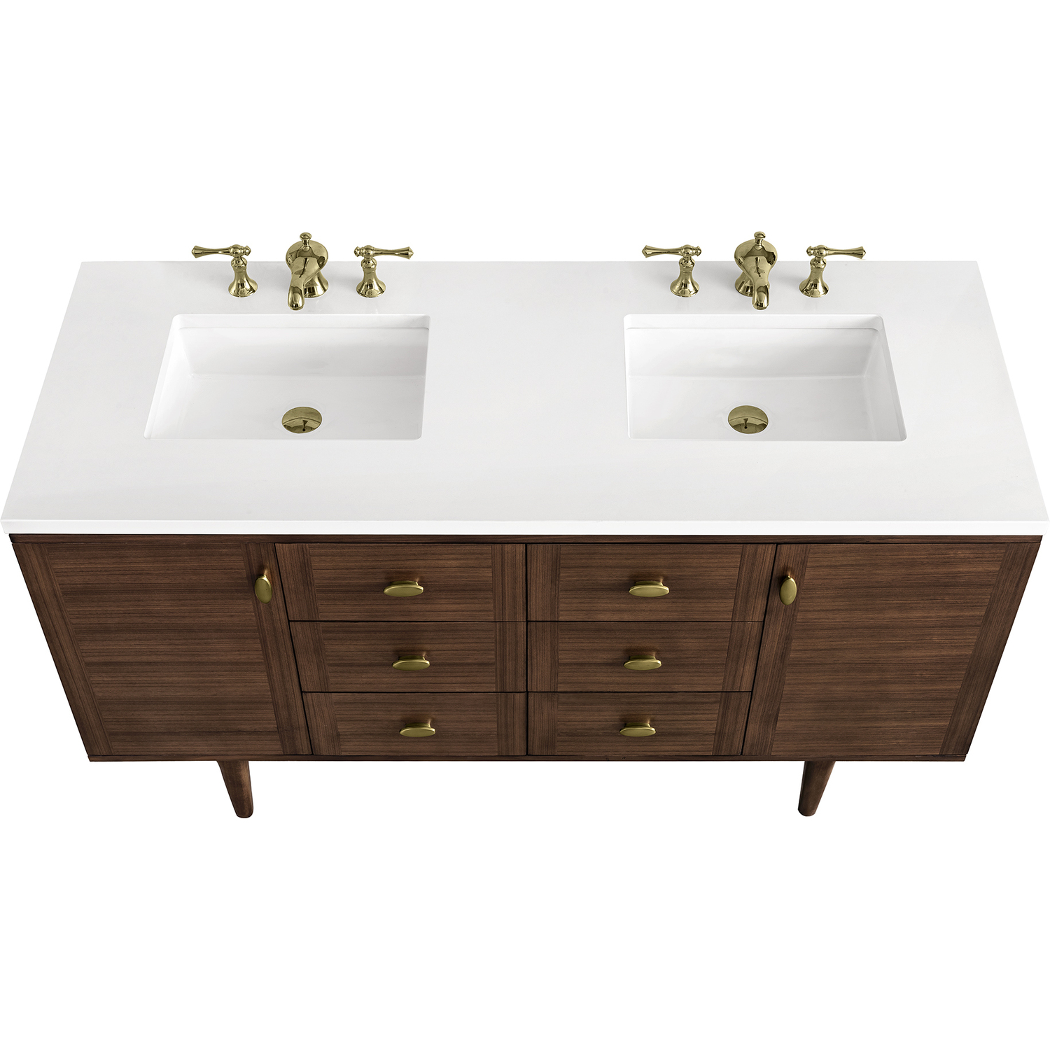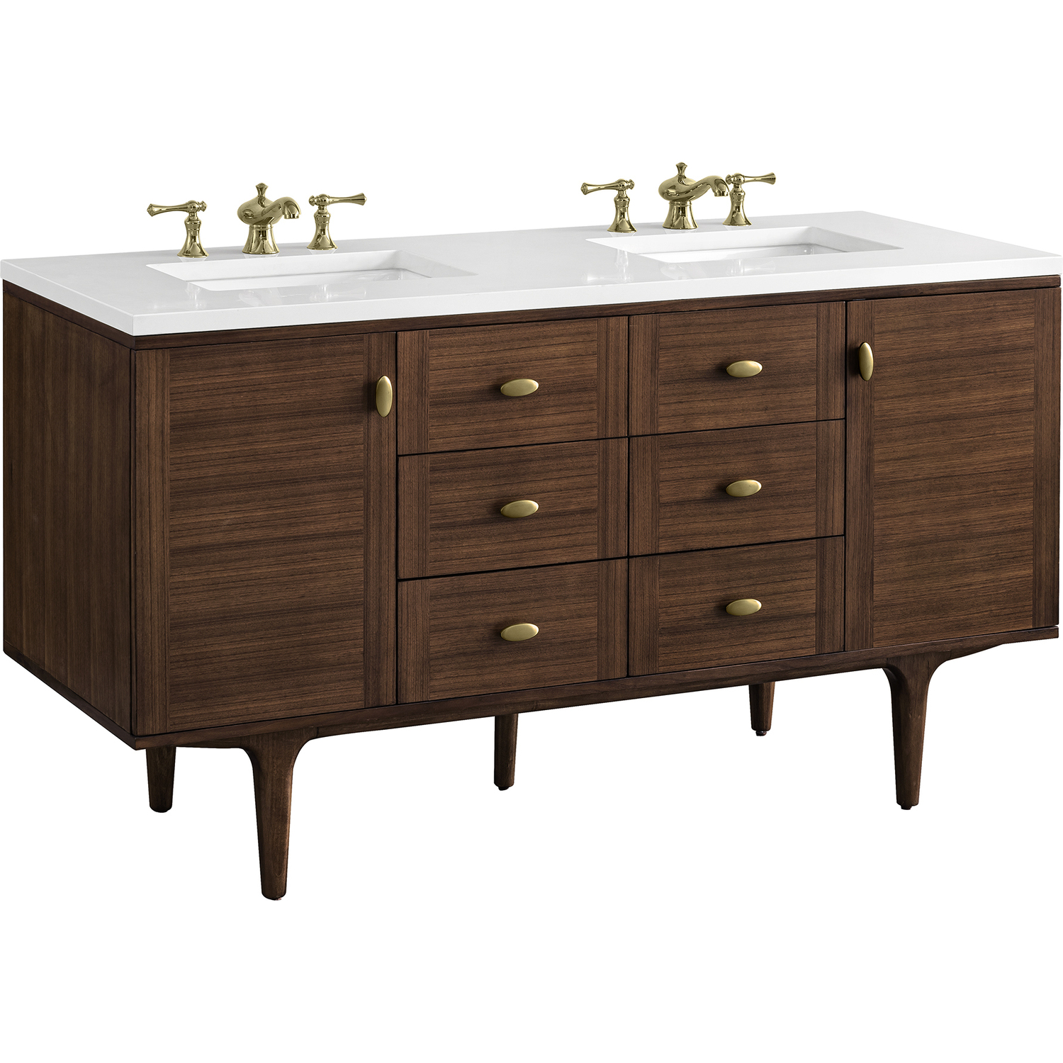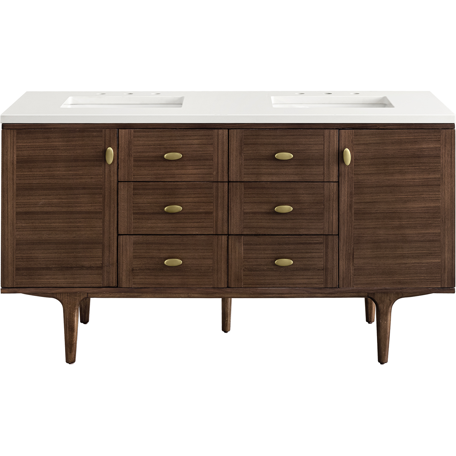 The 60" Amberly Double Vanity celebrates Mid-Century simplistic forms and finish details combined with practical function. The beauty of the natural grains in the walnut veneer steals the show, while the decorative, oval knobs in Champagne Brass provide the perfect accent. This two-door cabinet opens to spacious interior storage with adjustable shelves and a convenient USB/Electric power outlet. Six drawers provide ample storage and include one removable bamboo organizer. The top row drawers are tip-out style. The elegant wood base elevates the Vanity Cabinet in a true console style, though you may choose the more modern, space-saving wall-mount option. The 3 cm, eased edge Eternal Jasmine Pearl Silestone top completes the look.3 CM eased edge White Zeus Silestone top includes a white porcelain rectangular sink that ships separately and includes mounting brackets for easy installation. Faucet not included.Constructed from Para wood solids and quarter cut Walnut veneers over plywood core sealed inside and out with premium moisture and UV-resistant coatingsPlywood drawer boxes feature English Dovetail joinery and our signature brushed aluminum laminate drawer liners for easy cleaningTwo-door cabinet with two interior, adjustable height shelves, and six drawers; the top row drawers are tip-out style.Dual Power and USB portsOne removeable Bamboo storage organizer trayThis cabinet may be installed with the wood base as a free standing vanity or mounted to the wall as a floating vanity. All mounting hardware is included.Oval shaped knobs in Champagne Brass FinishThe Mid-Century Modern-inspired Amberly collection showcases a rich walnut wood cabinet set elegantly atop subtly curved legs and accented with oval Champagne Brass pulls. Floating or freestanding, Amberly is an eye-catching focal point for any luxury bathroom décor.1 year warranty against manufacturer's defects. We will repair or replace any defective product, if the product is defective in material or workmanship at our discretion. No warranty is expressed or implied regarding damages resulting from consumer misuse.