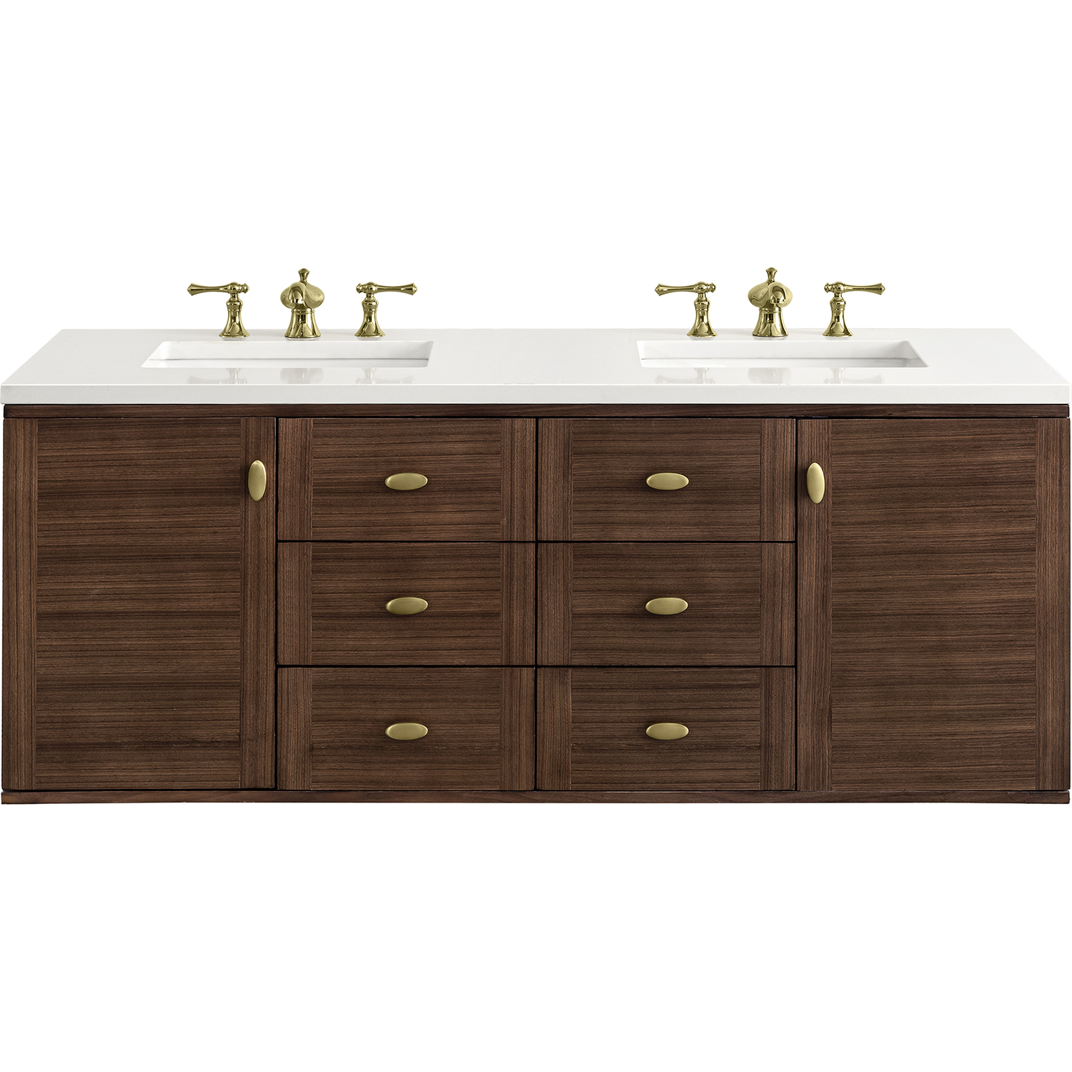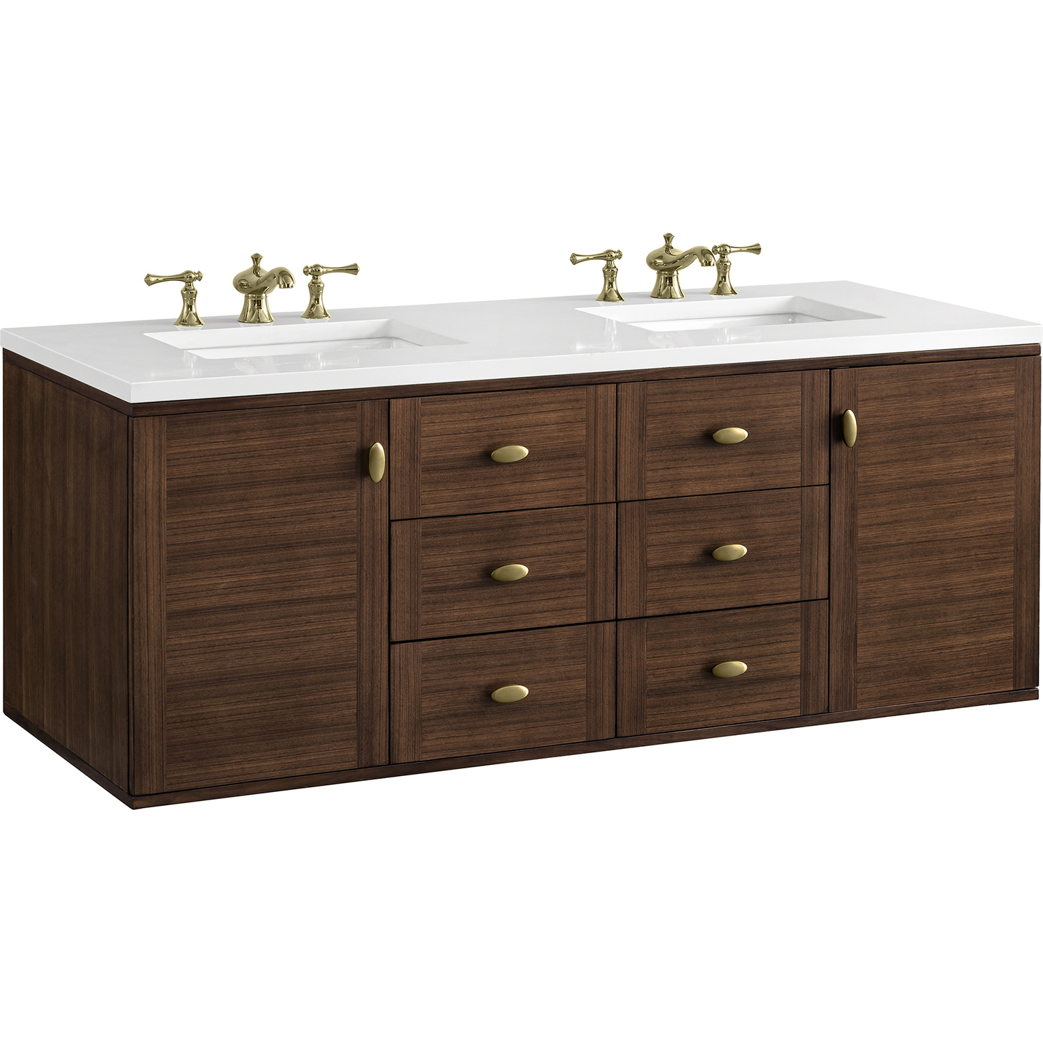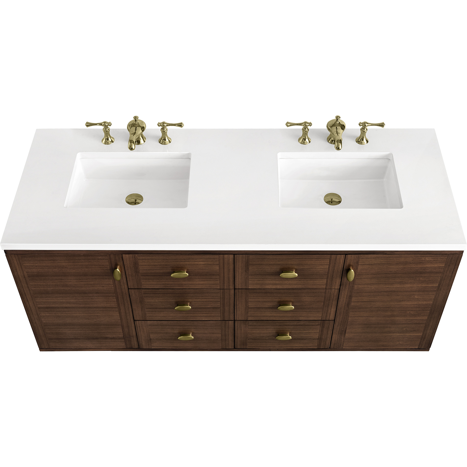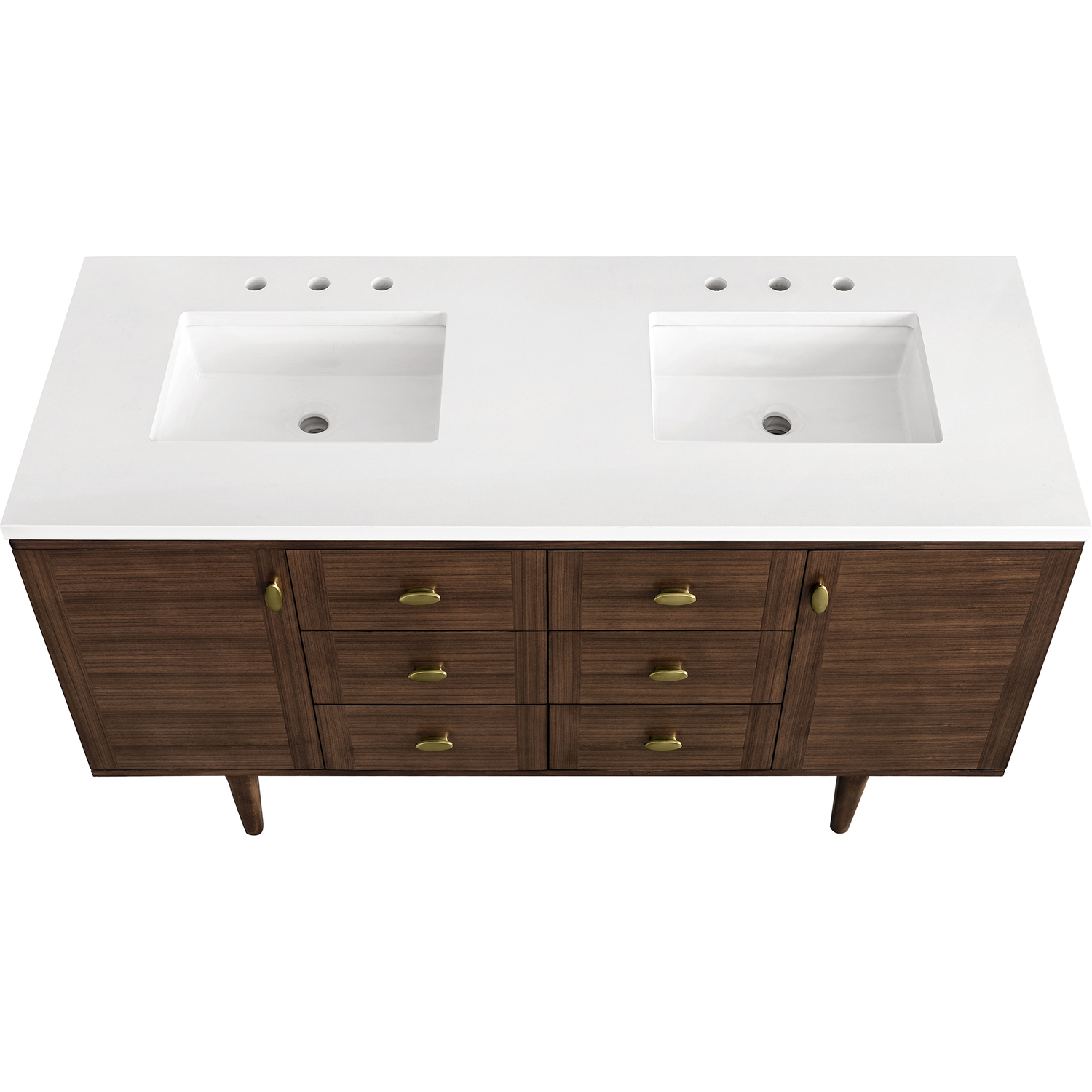 The 60" Amberly Double Vanity celebrates Mid-Century simplistic forms and finish details combined with practical function. The beauty of the natural grains in the walnut veneer steals the show, while the decorative, oval knobs in Champagne Brass provide the perfect accent. This two-door cabinet opens to spacious interior storage with adjustable shelves and a convenient USB/Electric power outlet. Six drawers provide ample storage and include one removable bamboo organizer. The top row drawers are tip-out style. The elegant wood base elevates the Vanity Cabinet in a true console style, though you may choose the more modern, space-saving wall-mount option. The 3 cm, eased edge Eternal Jasmine Pearl Silestone top completes the look.3 CM eased edge White Zeus Silestone top includes a white porcelain rectangular sink that ships separately and includes mounting brackets for easy installation. Faucet not included.Constructed from Para wood solids and quarter cut Walnut veneers over plywood core sealed inside and out with premium moisture and UV-resistant coatingsPlywood drawer boxes feature English Dovetail joinery and our signature brushed aluminum laminate drawer liners for easy cleaningTwo-door cabinet with two interior, adjustable height shelves, and six drawers; the top row drawers are tip-out style.Dual Power and USB portsOne removeable Bamboo storage organizer trayThis cabinet may be installed with the wood base as a free standing vanity or mounted to the wall as a floating vanity. All mounting hardware is included.Oval shaped knobs in Champagne Brass FinishThe Mid-Century Modern-inspired Amberly collection showcases a rich walnut wood cabinet set elegantly atop subtly curved legs and accented with oval Champagne Brass pulls. Floating or freestanding, Amberly is an eye-catching focal point for any luxury bathroom décor.1 year warranty against manufacturer's defects. We will repair or replace any defective product, if the product is defective in material or workmanship at our discretion. No warranty is expressed or implied regarding damages resulting from consumer misuse.