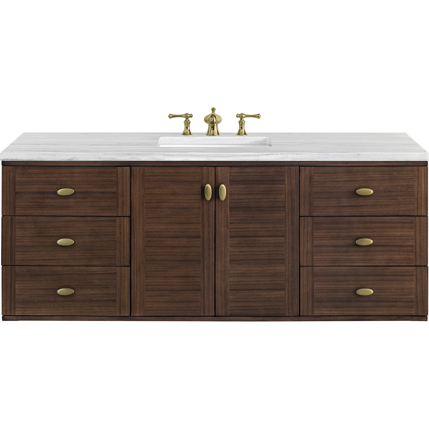 The 60" Amberly Single Vanity celebrates Mid-Century simplistic forms and finish details combined with practical function. The beauty of the natural grains in the walnut veneer steals the show, while the decorative, oval knobs in Champagne Brass provide the perfect accent. This two-door cabinet opens to a spacious interior with a single shelf and a convenient USB/Electric power outlet. Six drawers provide ample storage and include one removable bamboo organizer. The elegant wood base elevates the Vanity Cabinet in a true console style, though you may choose the more modern, space-saving wall-mount option. The 3 cm, eased edge Arctic Fall Solid Surface top completes the look.3 CM eased edge Arctic Fall, solid surface top includes a white porcelain rectangular sink that ships separately and includes mounting brackets for easy installation. Faucet not included.Constructed from Para wood solids and quarter cut Walnut veneers over plywood corePlywood drawer boxes feature English Dovetail joinery and our signature brushed aluminum laminate drawer liners for easy cleaningTwo door cabinet, one interior adjustable height shelf and six drawersDual Power and USB portsOne removeable Bamboo storage organizer trayThis cabinet may be installed with the wood base as a free standing vanity or mounted to the wall as a floating vanity. All mounting hardware is included.Oval shaped knobs in Champagne Brass FinishThe Mid-Century Modern inspired Amberly collection showcases a rich walnut wood cabinet, set elegantly atop subtly curved legs, and accented with oval Champagne Brass pulls. Floating or freestanding, Amberly is an eye-catching focal point for any luxury bathroom décor.1 year warranty against manufacturer's defects. We will repair or replace any defective product, if the product is defective in material or workmanship at our discretion. No warranty is expressed or implied regarding damages resulting from consumer misuse.