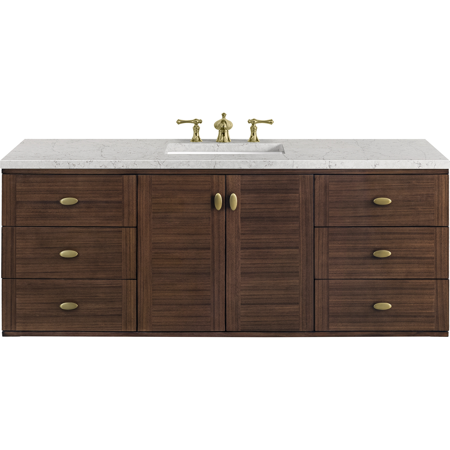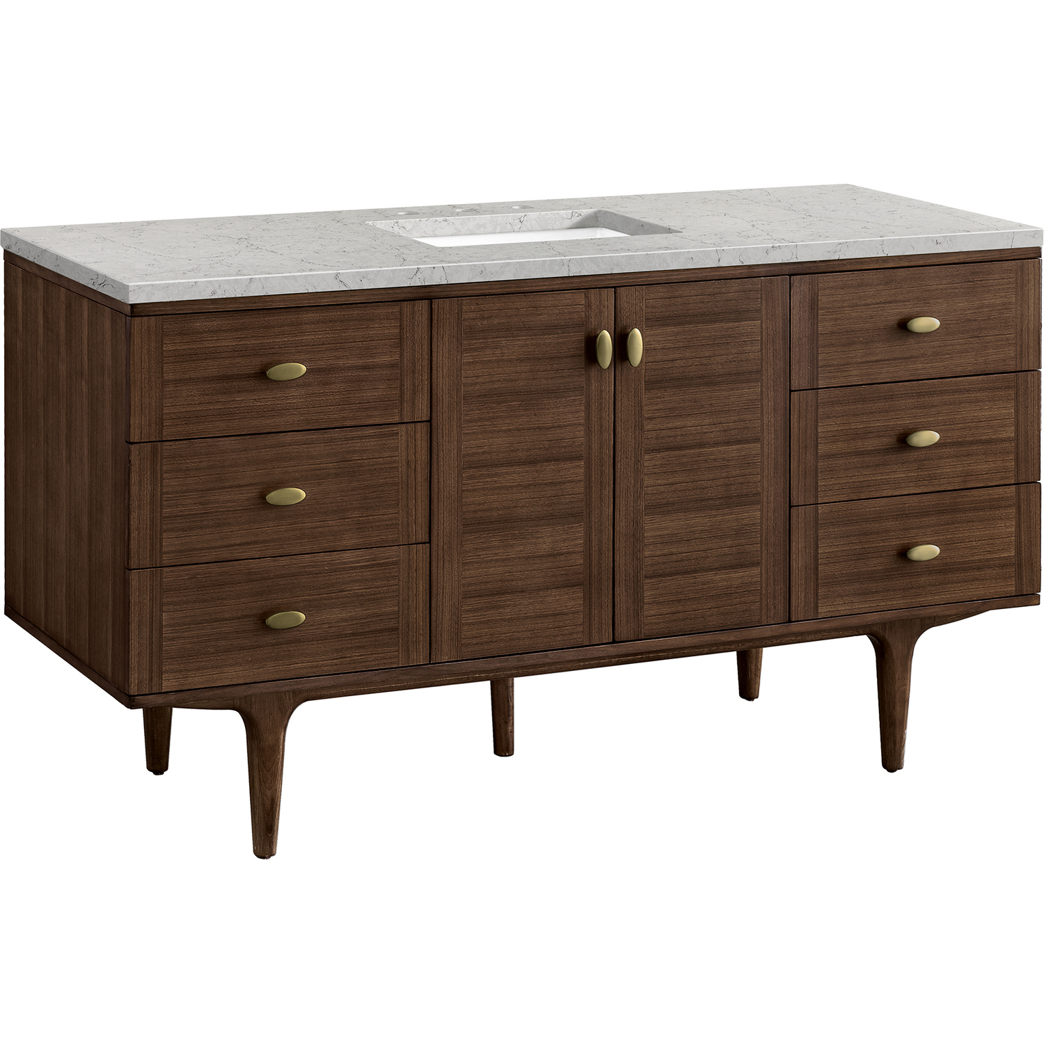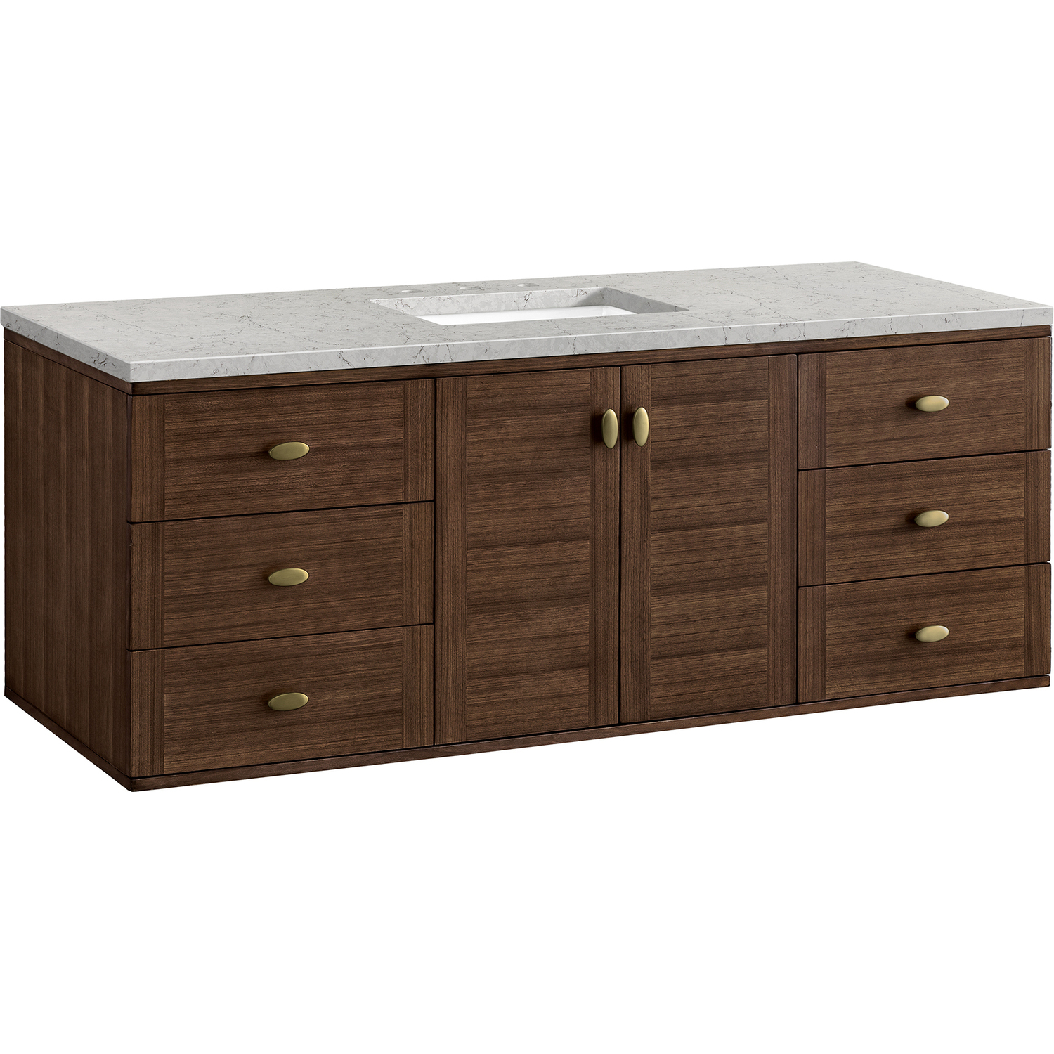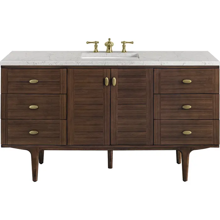 The 60" Amberly Single Vanity celebrates Mid-Century simplistic forms and finish details combined with practical function. The beauty of the natural grains in the walnut veneer steals the show, while the decorative, oval knobs in Champagne Brass provide the perfect accent. This two-door the cabinet opens to a spacious interior with a single shelf and a convenient USB/Electric power outlet. Six drawers provide ample storage and include one removable bamboo organizer. The elegant wood base elevates the Vanity Cabinet in a true console style, though you may choose the more modern, space-saving wall-mount option. The 3 cm, eased edge Eternal Jasmine Pearl Silestone top completes the look.3 CM eased edge Eternal Jasmine Pearl Silestone top includes a white porcelain rectangular sink that ships separately and includes mounting brackets for easy installation. Faucet not included.Constructed from Para wood solids and quarter cut Walnut veneers over plywood corePlywood drawer boxes feature English Dovetail joinery and our signature brushed aluminum laminate drawer liners for easy cleaningTwo door cabinet, one interior adjustable height shelf and six drawersDual Power and USB portsOne removeable Bamboo storage organizer trayThis cabinet may be installed with the wood base as a free standing vanity or mounted to the wall as a floating vanity. All mounting hardware is included.Oval shaped knobs in Champagne Brass FinishThe Mid-Century Modern inspired Amberly collection showcases a rich walnut wood cabinet, set elegantly atop subtly curved legs, and accented with oval Champagne Brass pulls. Floating or freestanding, Amberly is an eye-catching focal point for any luxury bathroom décor.1 year warranty against manufacturer's defects. We will repair or replace any defective product, if the product is defective in material or workmanship at our discretion. No warranty is expressed or implied regarding damages resulting from consumer misuse.