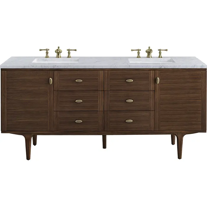 James Martin Amberly 72 inch Double Bathroom Vanity, Mid-Century Walnut w/ 3 CM Carrara Marble Top 670-V72-WLT-3CAR