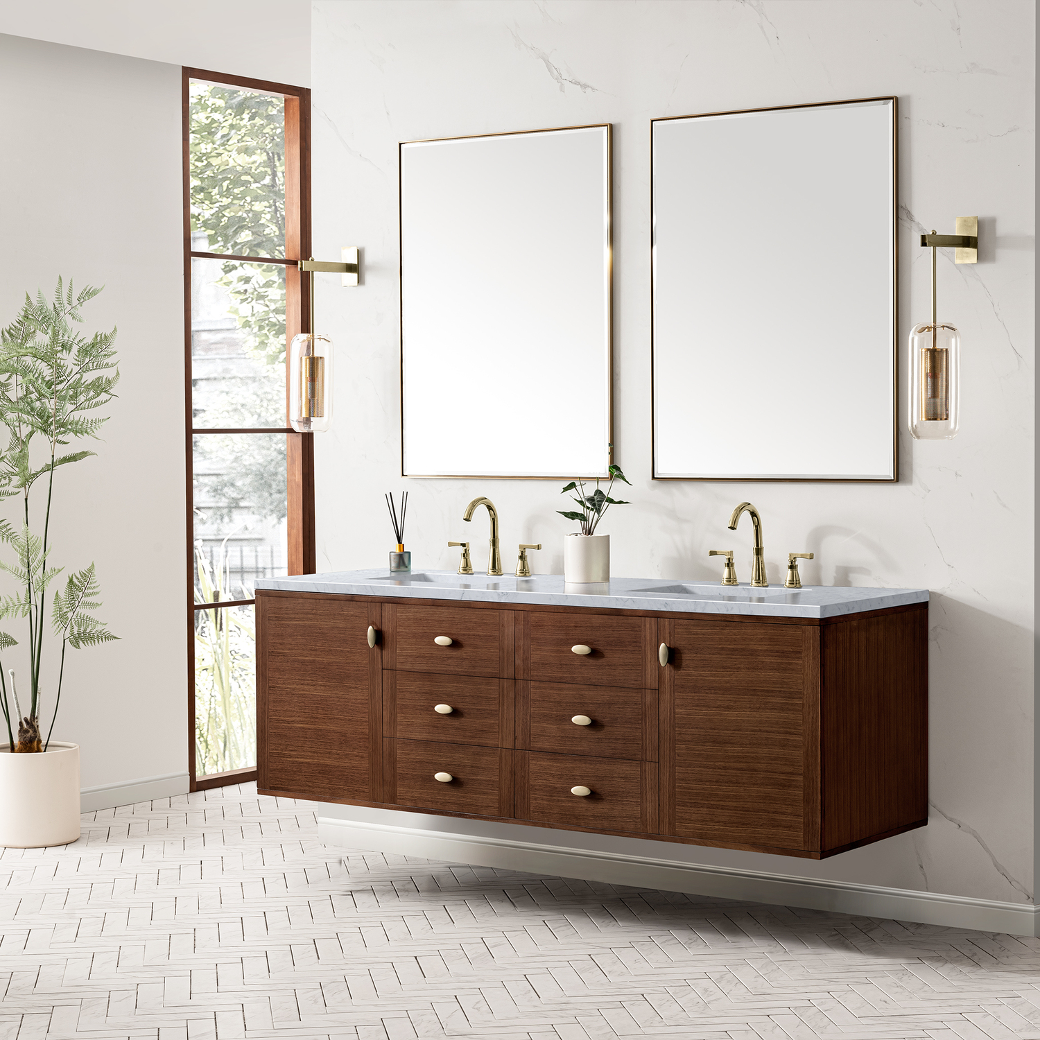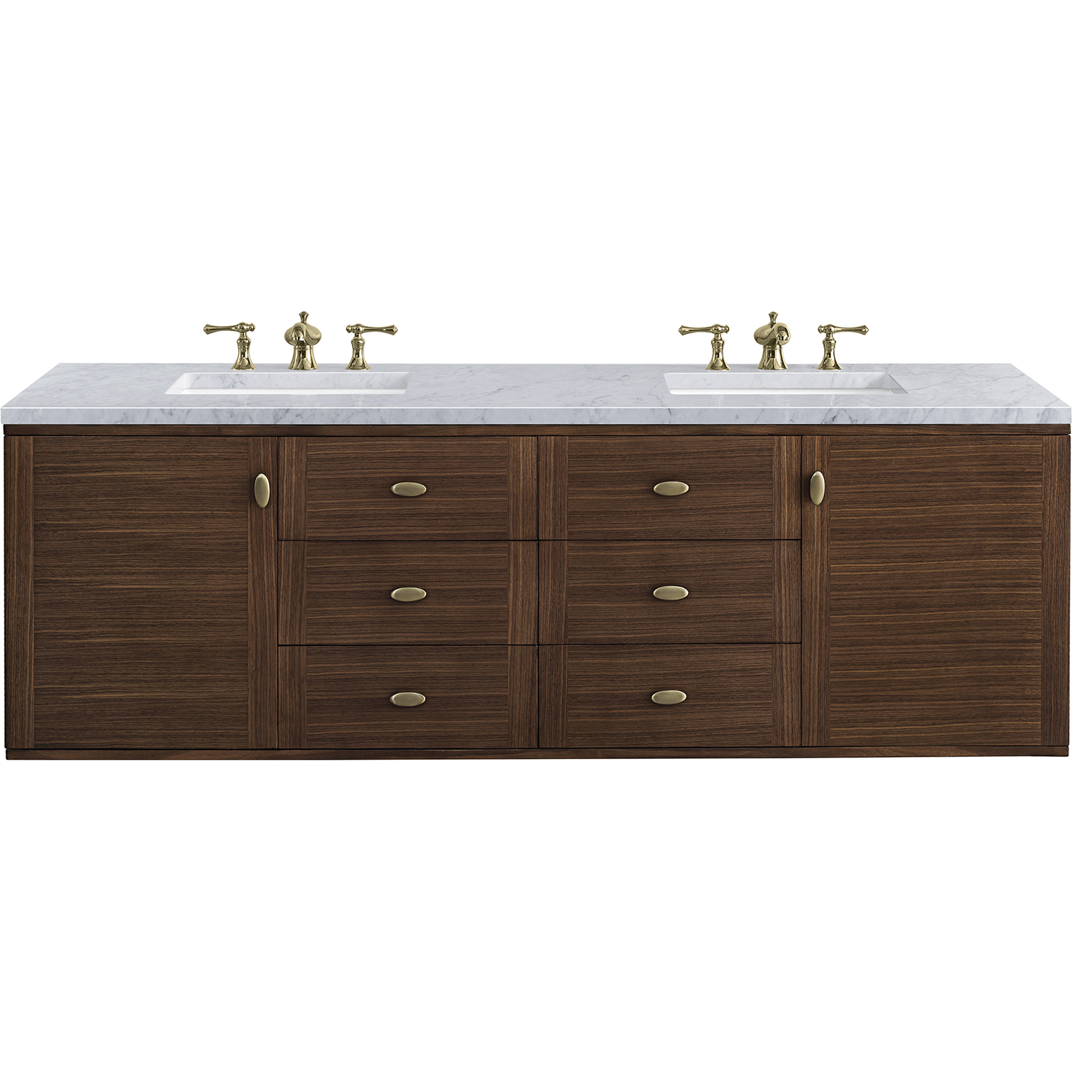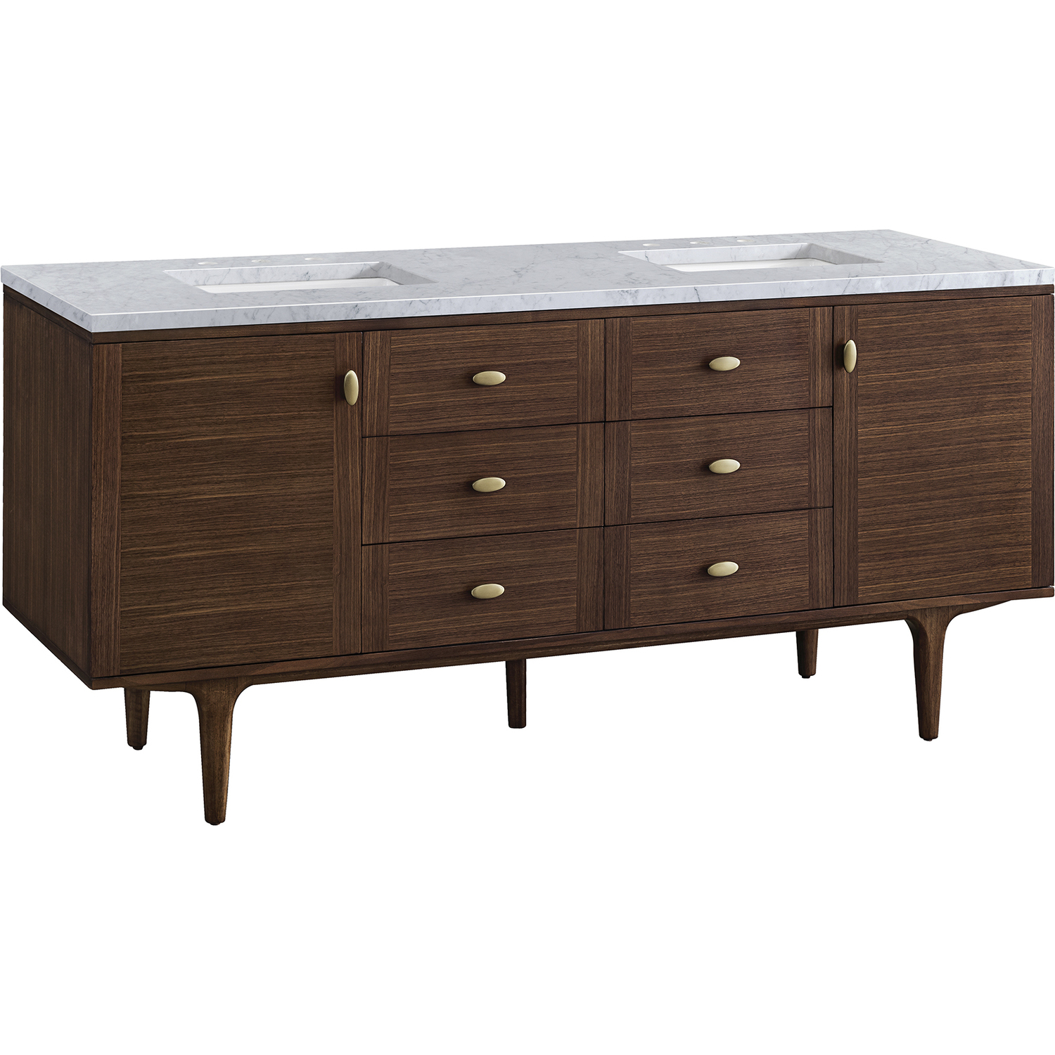 The 72" Amberly Double Vanity celebrates Mid-Century simplistic forms and finish details combined with practical function. The beauty of the natural grains in the walnut veneer steals the show, while the decorative, oval knobs in Champagne Brass provide the perfect accent. This two-door cabinet opens to spacious interior storage with two adjustable shelves and a convenient USB/Electric power outlet. Six drawers provide ample storage and include one removable bamboo organizer. The top row drawers are tip-out style. The elegant wood base elevates the Vanity Cabinet in a true console style, though you may choose the more modern, space-saving wall-mount option. The 3 cm, eased-edge Carrara marble top completes the look.3 CM eased edge Carrara marble top includes a white porcelain rectangular sink that ships separately and includes mounting brackets for easy installation. Faucet not included.Constructed from Para wood solids and quarter cut Walnut veneers over plywood corePlywood drawer boxes feature English Dovetail joinery and our signature brushed aluminum laminate drawer liners for easy cleaningTwo door cabinet with two interior, adjustable height shelves and six drawers, the top row drawers are tip-out style.Dual Power and USB portsOne removeable Bamboo storage organizer trayThis cabinet may be installed with the wood base as a free standing vanity or mounted to the wall as a floating vanity. All mounting hardware is included.Oval shaped knobs in Champagne Brass FinishThe Mid-Century Modern inspired Amberly collection showcases a rich walnut wood cabinet, set elegantly atop subtly curved legs, and accented with oval Champagne Brass pulls. Floating or freestanding, Amberly is an eye-catching focal point for any luxury bathroom décor.1 year warranty against manufacturer's defects. We will repair or replace any defective product, if the product is defective in material or workmanship at our discretion. No warranty is expressed or implied regarding damages resulting from consumer misuse.