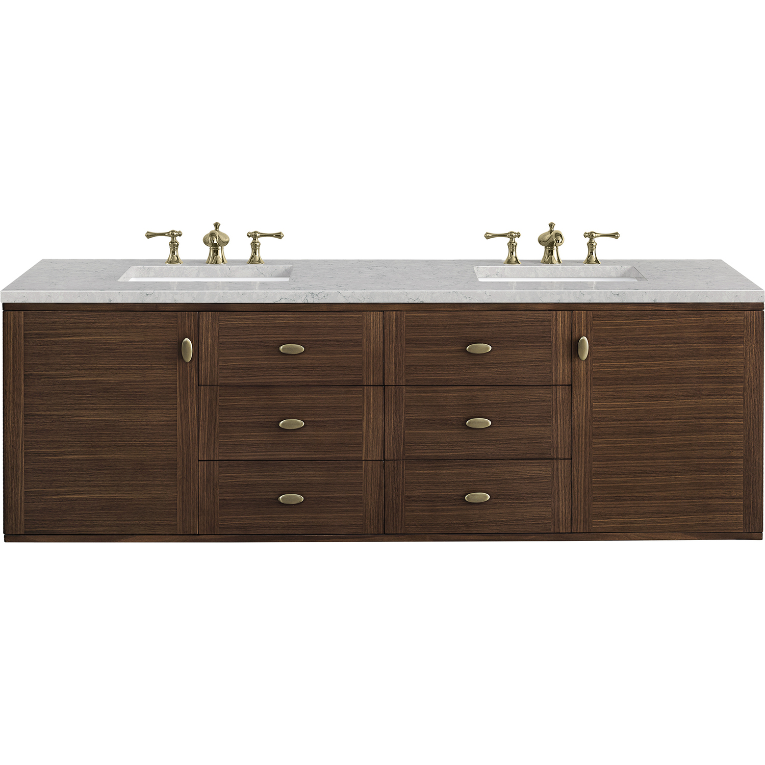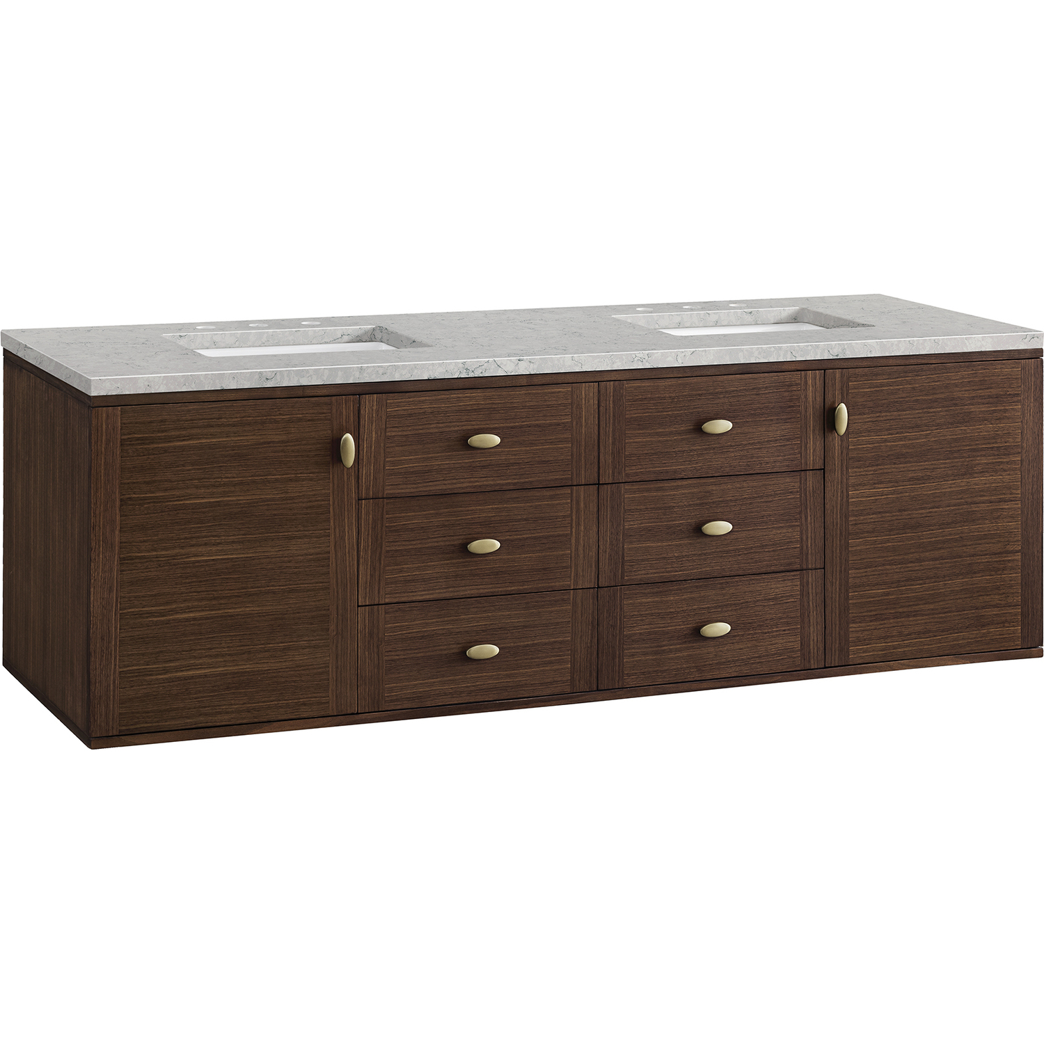 The 72" Amberly Double Vanity celebrates Mid-Century simplistic forms and finish details combined with practical function. The beauty of the natural grains in the walnut veneer steals the show, while the decorative, oval knobs in Champagne Brass provide the perfect accent. This two-door cabinet opens to spacious interior storage with two adjustable shelves and a convenient USB/Electric power outlet. Six drawers provide ample storage and include one removable bamboo organizer. The top row drawers are tip-out style. The elegant wood base elevates the Vanity Cabinet in a true console style, though you may choose the more modern, space-saving wall-mount option. The 3 cm, eased edge Eternal Jasmine Pearl Silestone top completes the look.3 CM eased edge Eternal Jasmine Pearl Silestone top includes a white porcelain rectangular sink that ships separately and includes mounting brackets for easy installation. Faucet not included.Constructed from Para wood solids and quarter cut Walnut veneers over plywood corePlywood drawer boxes feature English Dovetail joinery and our signature brushed aluminum laminate drawer liners for easy cleaningTwo door cabinet with two interior, adjustable height shelves and six drawers, the top row drawers are tip-out style.Dual Power and USB portsOne removeable Bamboo storage organizer trayThis cabinet may be installed with the wood base as a free standing vanity or mounted to the wall as a floating vanity. All mounting hardware is included.Oval shaped knobs in Champagne Brass FinishThe Mid-Century Modern inspired Amberly collection showcases a rich walnut wood cabinet, set elegantly atop subtly curved legs, and accented with oval Champagne Brass pulls. Floating or freestanding, Amberly is an eye-catching focal point for any luxury bathroom décor.1 year warranty against manufacturer's defects. We will repair or replace any defective product, if the product is defective in material or workmanship at our discretion. No warranty is expressed or implied regarding damages resulting from consumer misuse.