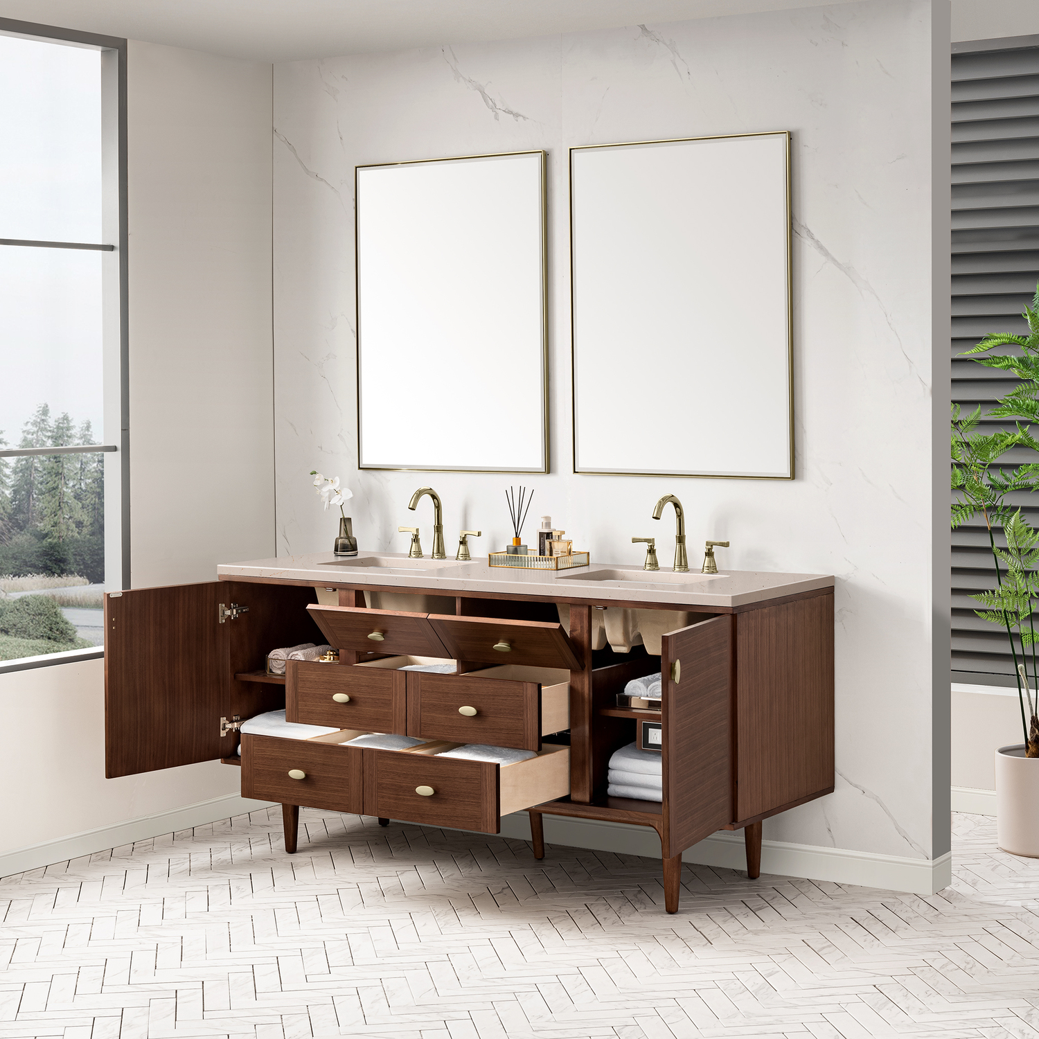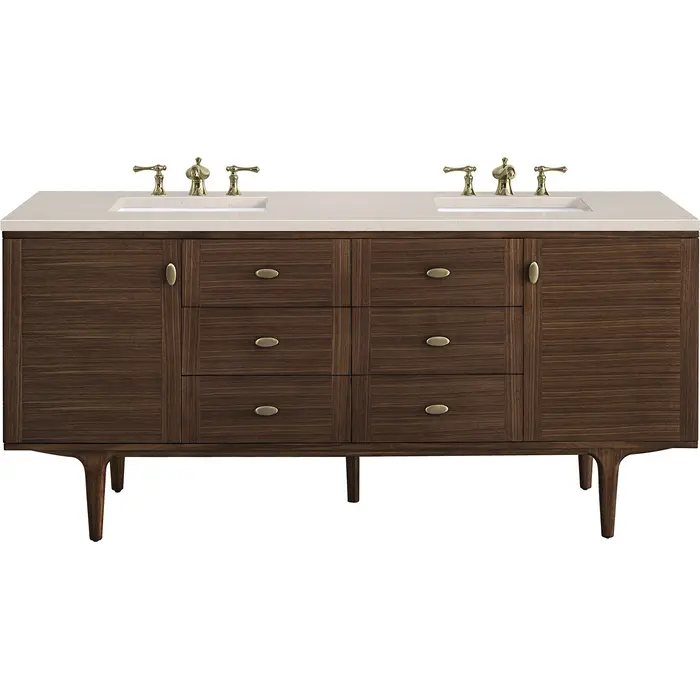James Martin Amberly 72 inch Double Bathroom Vanity, Mid-Century Walnut w/ 3 CM Eternal Marfil Top 670-V72-WLT-3EMR