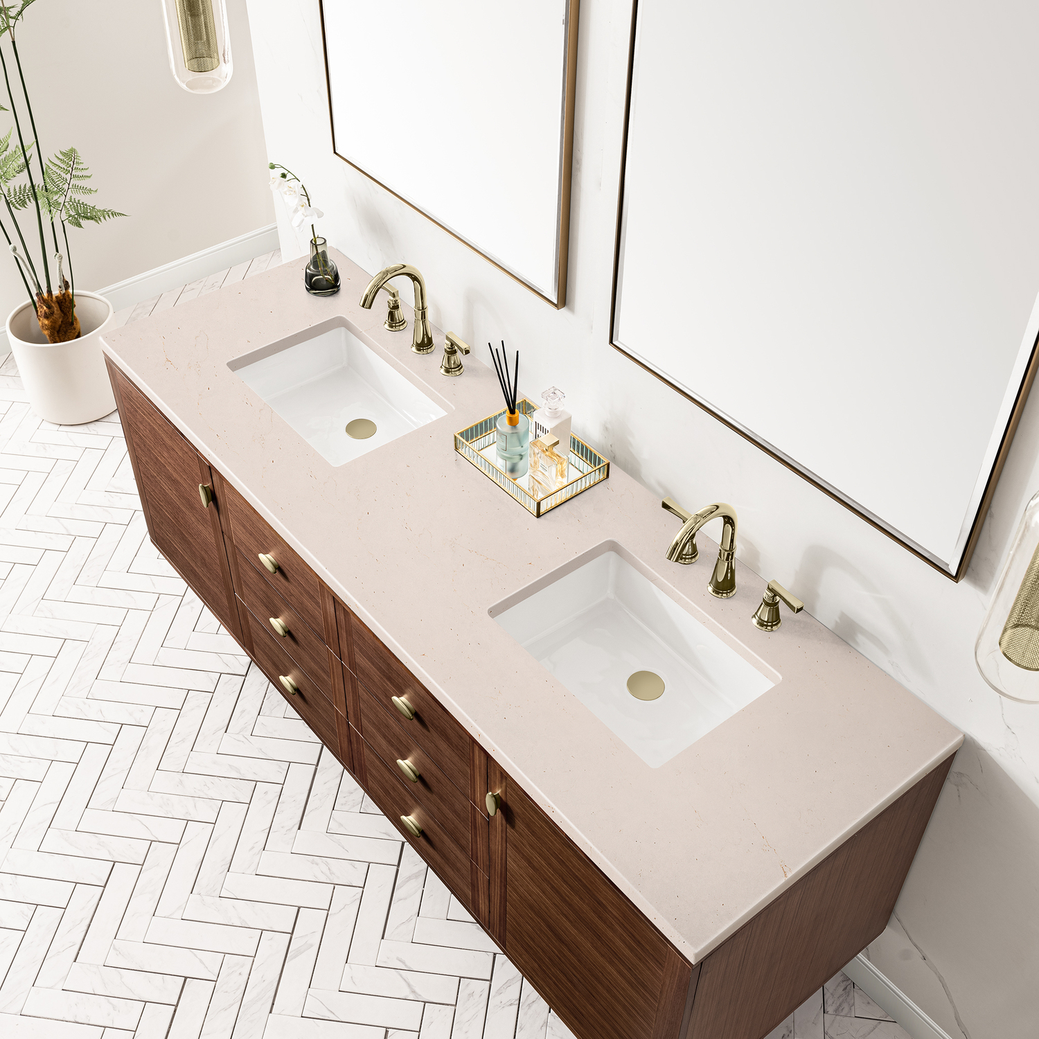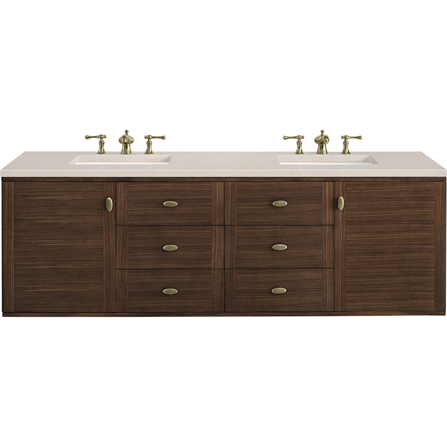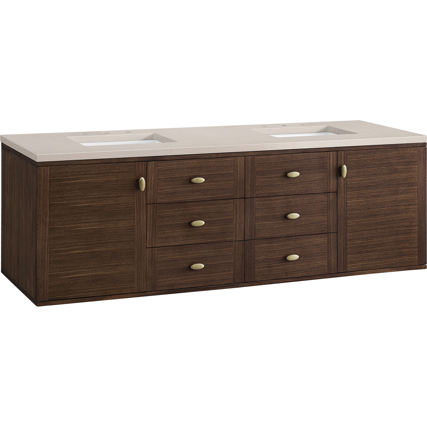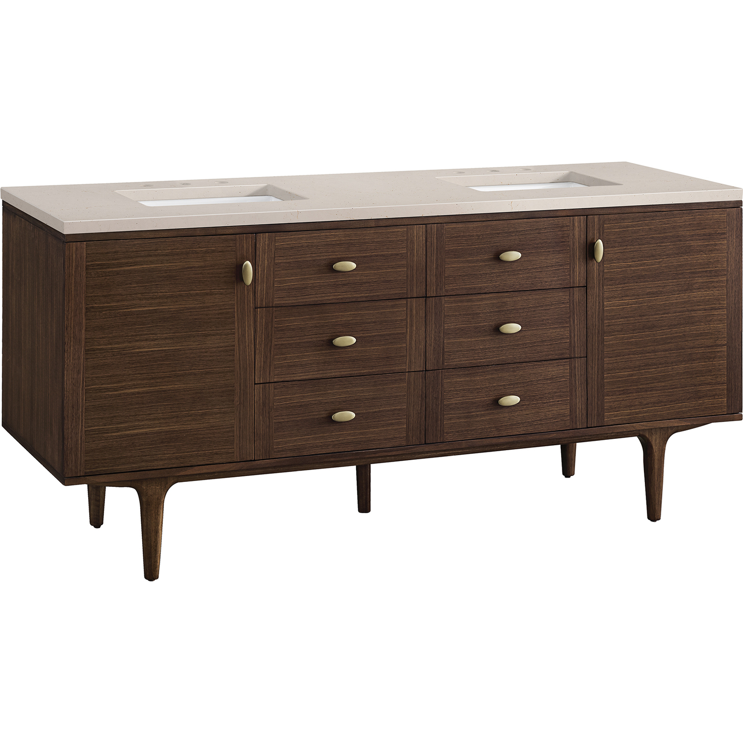 The 72" Amberly Double Vanity celebrates Mid-Century simplistic forms and finish details combined with practical function. The beauty of the natural grains in the walnut veneer steals the show, while the decorative, oval knobs in Champagne Brass provide the perfect accent. This two-door cabinet opens to spacious interior storage with two adjustable shelves and a convenient USB/Electric power outlet. Six drawers provide ample storage and include one removable bamboo organizer. The top row drawers are tip-out style. The elegant wood base elevates the Vanity Cabinet in a true console style, though you may choose the more modern, space-saving wall-mount option. The 3 cm, eased edge Eternal Marfil Silestone top completes the look.3 CM eased edge Eternal Marfil Silestone top includes a white porcelain rectangular sink that ships separately and includes mounting brackets for easy installation. Faucet not included.Constructed from Para wood solids and quarter cut Walnut veneers over plywood corePlywood drawer boxes feature English Dovetail joinery and our signature brushed aluminum laminate drawer liners for easy cleaningTwo door cabinet with two interior, adjustable height shelves and six drawers, the top row drawers are tip-out style.Dual Power and USB portsOne removeable Bamboo storage organizer trayThis cabinet may be installed with the wood base as a free standing vanity or mounted to the wall as a floating vanity. All mounting hardware is included.Oval shaped knobs in Champagne Brass FinishThe Mid-Century Modern inspired Amberly collection showcases a rich walnut wood cabinet, set elegantly atop subtly curved legs, and accented with oval Champagne Brass pulls. Floating or freestanding, Amberly is an eye-catching focal point for any luxury bathroom décor.1 year warranty against manufacturer's defects. We will repair or replace any defective product, if the product is defective in material or workmanship at our discretion. No warranty is expressed or implied regarding damages resulting from consumer misuse.
