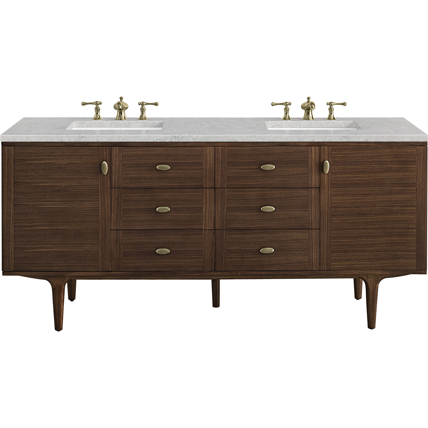 The Amberly 72" Double Vanity by James Martin Vanities celebrates Mid-Century Modern design by combining beautiful details with practical function. The beauty of the natural wood grain of the rich walnut veneers steal the show, while the decorative, oval knobs in Champagne Brass provide the perfect accent. This vanity features two single-door cabinets that open to interior shelves, four drawers, and two tip-out drawers. A convenient USB/120V power outlet and removable drawer organizer are also included. The rich walnut cabinet sits atop a wood base with tapered legs, completing the Mid-Century Modern look, but can be removed for a more modern, space-saving wall-mount option. The cabinet is topped with a beautiful 3cm Eternal Jasmine Pearl Silestone® top. This unit is enabled with FreePower wireless charging; featuring a two-device charger seamlessly embedded into the countertop, indicated by a light-up halo in between the sinks. Designed for modern living, FreePower offers convenient, integrated, wireless charging when and where you need it.FreePower Wireless Charging; two-device unit in between sinksTwo single-door cabinets with interior shelves, four full-extension drawers, and two tip-out drawersDrawer boxes feature English Dovetail joinery with premium, soft-close undermount drawer slides and doors feature soft-close, adjustable door hingesCabinet features a multi-stage premium finish coat to offer UV and moisture resistanceMid-Century Walnut finish with oval-shaped knobs in Champagne BrassCountertop is pre-drilled for 8" widespread faucet(s); our 3cm eased edge countertops come with white porcelain rectangular sink(s) that ship separately and include mounting brackets for easy installationIntegrated USB/120V Outlet with USB PortsDrawers lined with our signature brushed aluminum laminate for easy cleaningRemovable bamboo drawer organizer includedMatching stone backsplash available as add-on purchaseDual-mounted: can be installed freestanding or floating with included French Cleat hardwareFaucet(s) sold separatelyThe Mid-Century Modern inspired Amberly Collection by James Martin Vanities showcases a rich walnut cabinet set elegantly atop subtly tapered legs, accented with oval Champagne Brass pulls. Floating or freestanding, Amberly is an eye-catching focal point for any luxury bathroom, imbuing the space with a touch of retro-chic charm and unparalleled elegance.1 year warranty against manufacturer's defects. We will repair or replace any defective product, if the product is defective in material or workmanship at our discretion. No warranty is expressed or implied regarding damages resulting from consumer misuse.