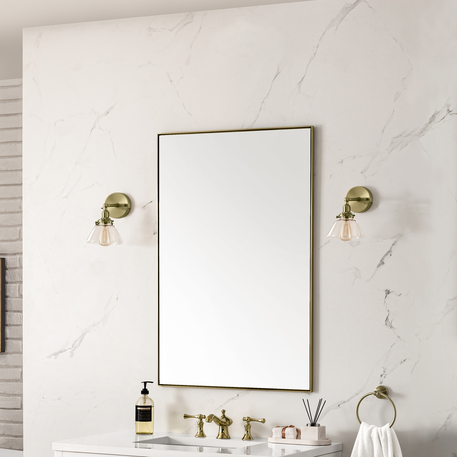 Inspired by modern framed canvas art, the Rohe 26" Rectangular Mirror appears to float inside the minimalistic Champagne Brass metal frame, adding visual interest to the beautifully bevel-cut glass. Designed for versatility, this mirror can be hung vertically or horizontally, and comes with mounting hardware for your convenience. The Rohe's simple, yet elegant design and sophisticated finish make it the perfect accent for your bathroom and any other living spaces in your home.26" W x 3/4" D x 40" H Rectangular MirrorChampagne Brass finish over stainless steelMounting hardware included for ease of installationAvailable in three finish optionsThis mirror is designed to be hung horizontally or vertically1" Bevel cut glassThe Rohe Mirror Collection by James Martin Vanities offers an elegant selection of mirrors that blend timeless sophistication with practical versatility. Available in seven sizes, four metal finishes, and four unique shapes - rectangle, octagon, round, and arched - the Rohe mirror caters to a variety of design preferences and aesthetics, ensuring the perfect fit for your home. Each mirror is crafted with meticulous attention to detail, featuring hand-finished frames and beveled glass for a premium look. The Rohe mirrors include recessed keyhole-style hangers, allowing for secure mounting. Mounting hardware is included for your convenience. Whether you're searching for a mirror to complement a vanity or a statement piece for your walls, the Rohe Mirror Collection offers a versatile and stylish solution to elevate any space.1 year warranty against manufacturer's defects. We will repair or replace any defective product, if the product is defective in material or workmanship at our discretion. No warranty is expressed or implied regarding damages resulting from consumer misuse.
