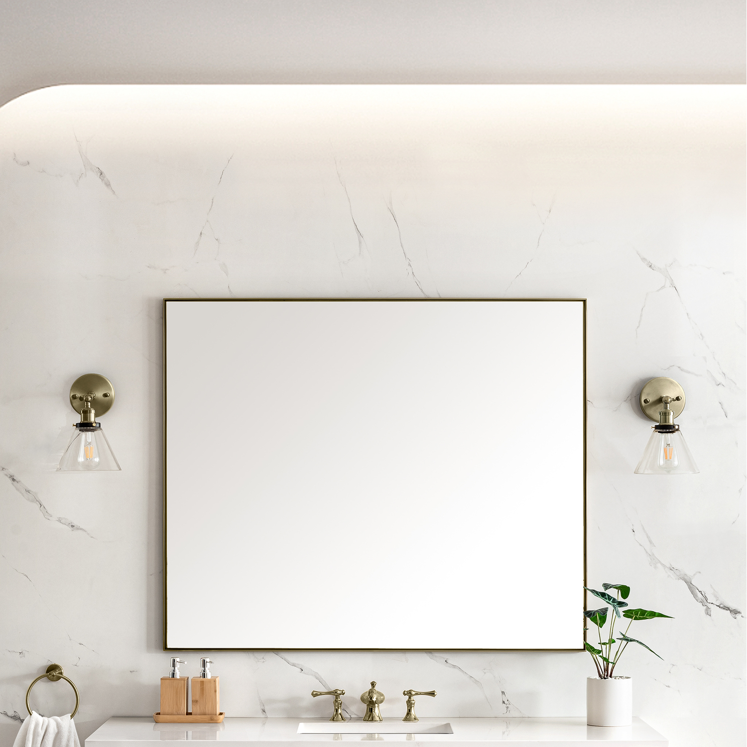 Inspired by modern framed canvas art, the Rohe 48" Rectangular Mirror appears to float inside the minimalistic Champagne Brass metal frame, adding visual interest to the beautifully bevel-cut glass. Designed for versatility, this mirror can be hung vertically or horizontally, and comes with mounting hardware for your convenience. The Rohe's simple, yet elegant design and sophisticated finish make it the perfect accent for your bathroom and any other living spaces in your home.48" W x 3/4" D x 40" H Rectangular MirrorChampagne Brass finish over stainless steelMounting hardware included for ease of installationAvailable in two finish optionsThis mirror is designed to be hung horizontally or vertically1" Bevel cut glassThe Rohe Mirror Collection by James Martin Vanities offers an elegant selection of mirrors that blend timeless sophistication with practical versatility. Available in seven sizes, four metal finishes, and four unique shapes - rectangle, octagon, round, and arched - the Rohe mirror caters to a variety of design preferences and aesthetics, ensuring the perfect fit for your home. Each mirror is crafted with meticulous attention to detail, featuring hand-finished frames and beveled glass for a premium look. The Rohe mirrors include recessed keyhole-style hangers, allowing for secure mounting. Mounting hardware is included for your convenience. Whether you're searching for a mirror to complement a vanity or a statement piece for your walls, the Rohe Mirror Collection offers a versatile and stylish solution to elevate any space.1 year warranty against manufacturer's defects. We will repair or replace any defective product, if the product is defective in material or workmanship at our discretion. No warranty is expressed or implied regarding damages resulting from consumer misuse.