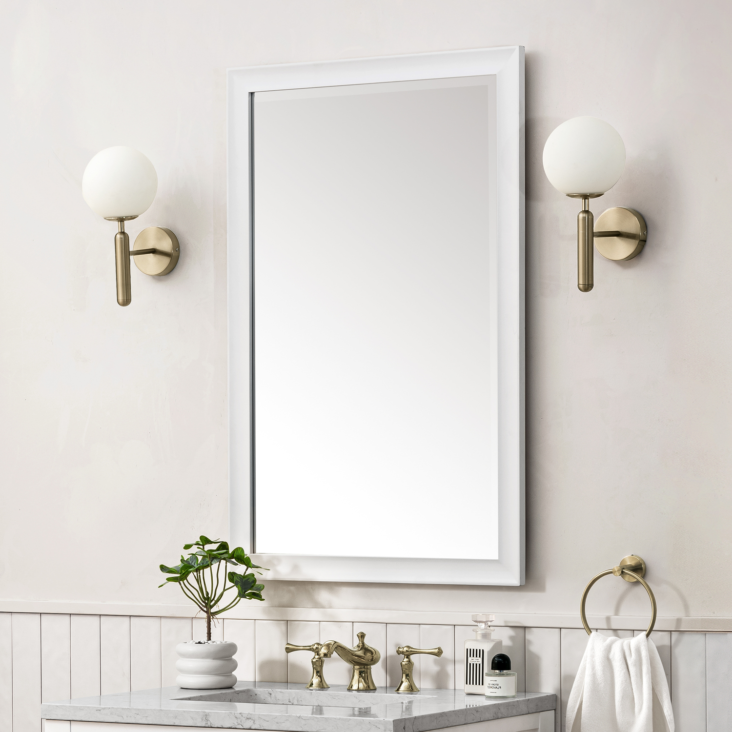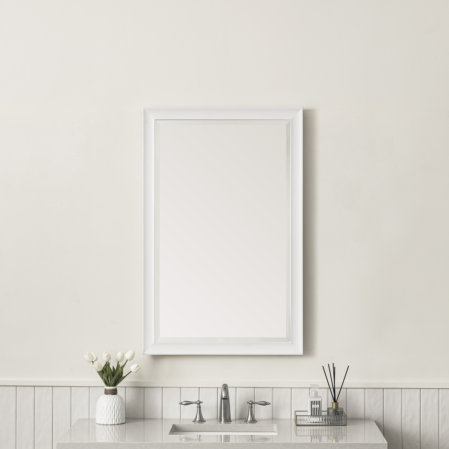 The simple sculpted detail and subtle concave frame of the Glenbrooke 26" Rectangular Mirror add a modern touch to a timeless look. Designed to coordinate across several James Martin Vanities collections, this classically elegant mirror in Bright White finish is the perfect addition to any room of your home. Crafted using premium bevel-cut glass, the Glenbrooke features two sets of recessed keyhole brackets, which allow for versatile installation - either vertical or horizontal. For your convenience, mounting hardware is included.26" W x 7/8" D x 40" H Rectangular MirrorBright White finishMounting hardware included for ease of installationAvailable in several of our most popular finish optionsThis mirror may be hung vertically or horizontally1" Bevel cut glassThe sculpted, curved detailing of Glenbrooke’s frame adds a modern touch to a timeless look. Designed to coordinate across several James Martin Vanities collections, this classically elegant mirror is available in several of our most popular made-to-match finishes. Crafted using premium bevel-cut glass, the Glenbrooke is the perfect accent for any room in your home. Two sets of recessed, premium keyhole brackets allow for versatile installation.1 year warranty against manufacturer's defects. We will repair or replace any defective product, if the product is defective in material or workmanship at our discretion. No warranty is expressed or implied regarding damages resulting from consumer misuse.
