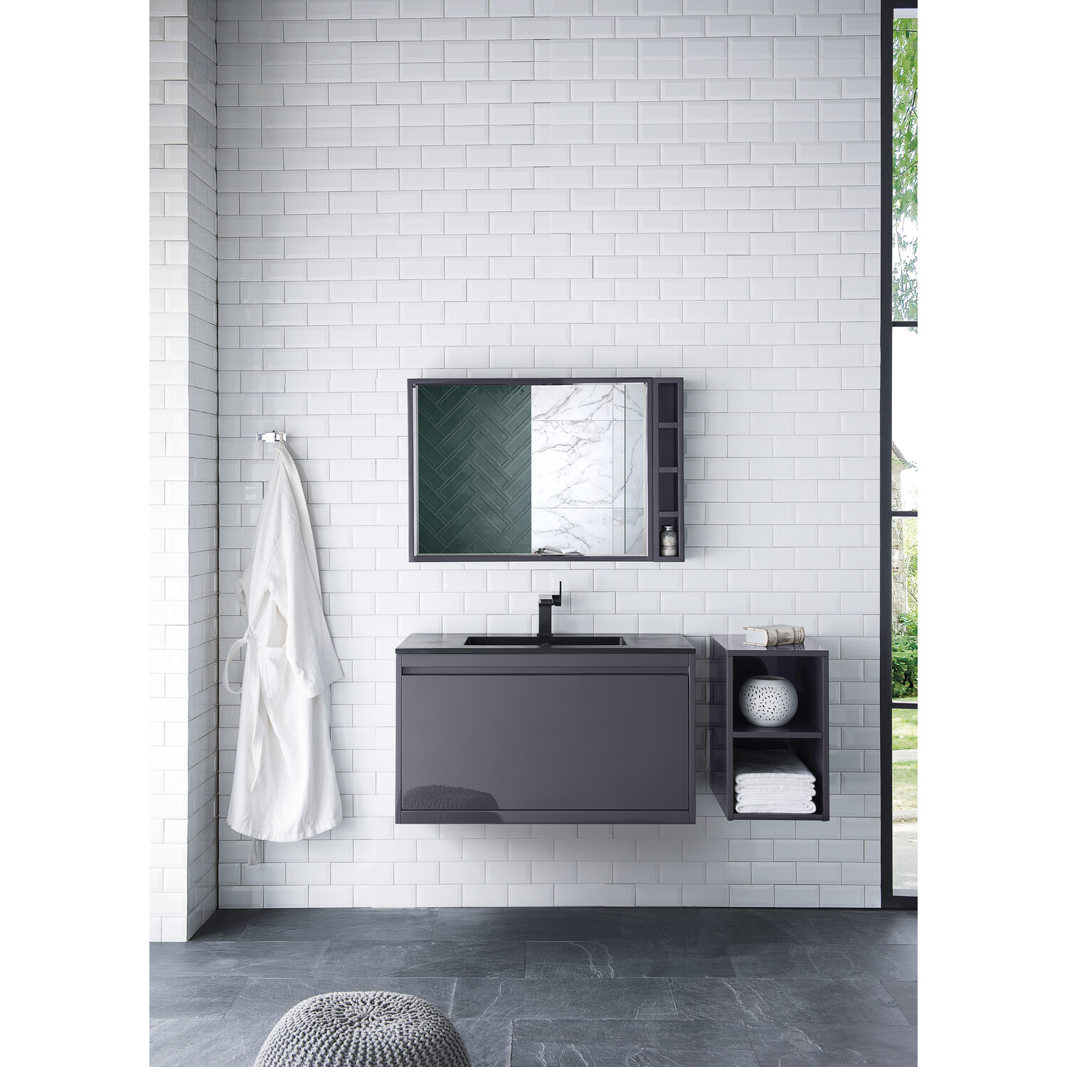 - Ideal for the modern home, the Milan Collection by James Martin Vanities is a swank, contemporary look at the future of bathroom vanities. Superbly crafted out of durable wood, it is immediately recognizable by its inherent beauty and durability. A true masterpiece of elegance and style, that is available in either a freestanding or wall-mounted edition. Each drawer is soft closing with ample storage room, that does not impede the design aesthetic of the overall piece. Each vanity comes with your choice of composite sink color either a glossy white or a charcoal black matte, as well as three options in cabinet finish, mid-century walnut, glossy white or modern grey. To top it all off you have four options for the metal base, brushed nickel, glossy white, radiant gold or matte black, giving you hundreds of different options to customize your bathroom. The Milan collection is available in multiple sizes and will work with a wide variety of different styles and decors.
