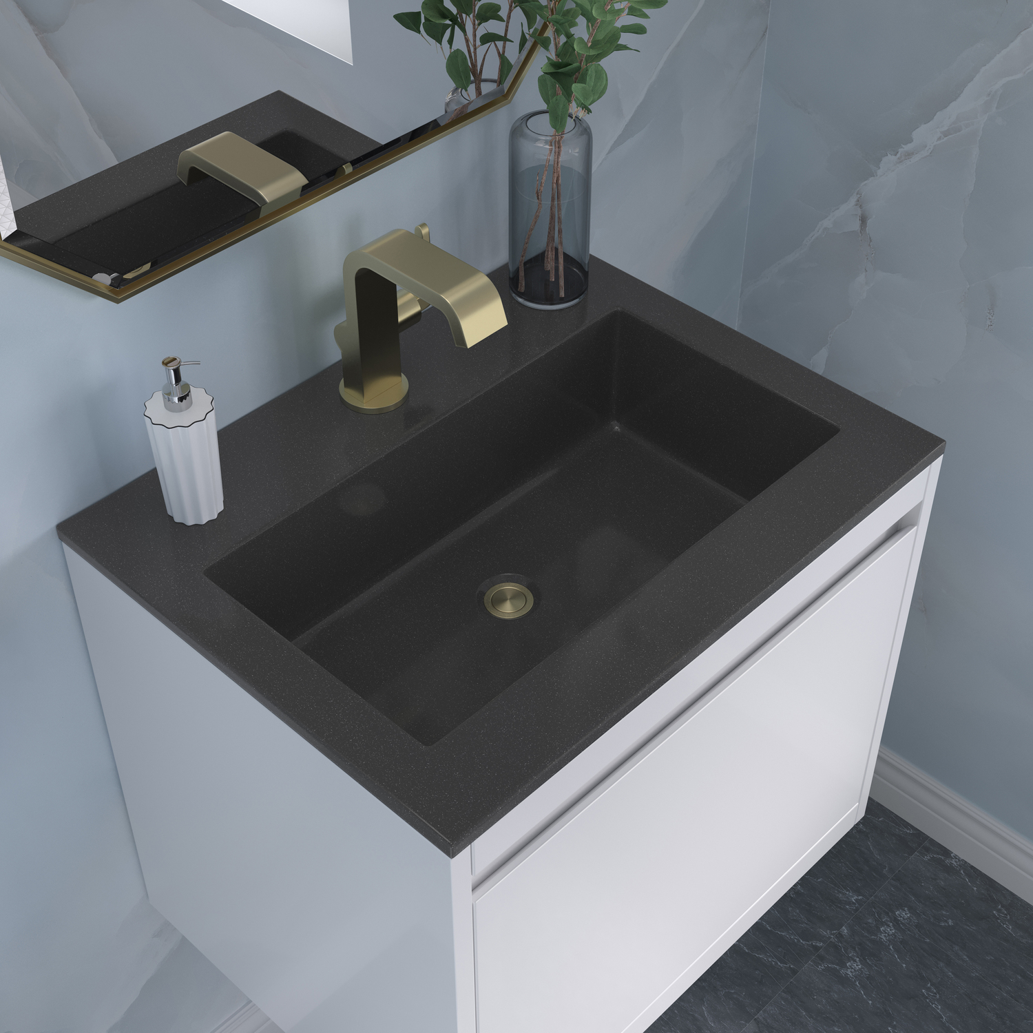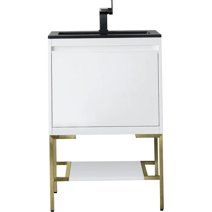 The Mantova 23.6” Glossy White Single Vanity by James Martin Vanities will elevate your space by adding a touch of timeless décor to your bathroom. This vanity combines a cutting-edge design with pristine craftmanship to bring your bathroom a clean modern look providing you with both style and functionality. Generous storage features include soft-close drawers with one removable drawer organizer. The look is completed with Champagne Brass finished Stainless Steel Base and a Charcoal Black Composite Stone integrated top and sink.Glossy White single vanity with two interior drawers and lower open shelvingHardware/Stand Finish: Champagne BrassSolid kiln-dried Grade A hardwoodCabinet is finished inside and out with a premium undercoat finish for superior moisture and UV resistanceSoft-close undermount drawer glidesDrawer bottoms are lined with our signature brushed aluminum laminateCharcoal Black Composite Stone integrated top and sink includedCountertop is pre-drilled for one single hole faucetFaucet sold separatelyIdeal for the modern home, the Mantova Collection by James Martin Vanities offers a clean, contemporary look. Superbly crafted out of durable wood, it is immediately recognizable by its inherent beauty and durability. A true masterpiece of elegance and style, that is available in either a freestanding or wall-mounted edition. Each drawer is soft closing with ample storage room, that does not impede the design aesthetic of the overall piece. Each vanity comes with your choice of composite sink color either a Glossy White or a Charcoal Black Matte, as well as two options in cabinet finishes, Mid-Century Walnut or Glossy White. To complete the look, choose between three options for the metal base; Brushed Nickel, Champagne Brass, or Matte Black. The Mantova collection is available in multiple sizes and will work with a wide variety of different styles and decors.1 year warranty against manufacturer's defects. We will repair or replace any defective product, if the product is defective in material or workmanship at our discretion. No warranty is expressed or implied regarding damages resulting from consumer misuse.