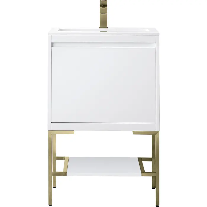 James Martin Mantova 23.6 inch Single Vanity, Glossy White, Champagne Brass Base w/ Glossy White Composite Stone Top, 840108962042, 805-V23.6-GW-CB-GW