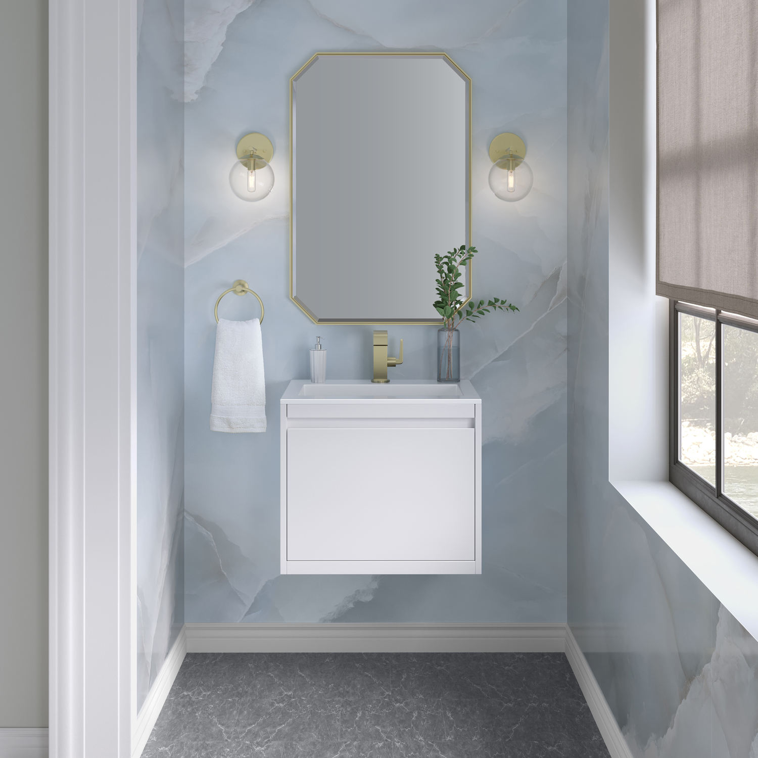 The Mantova 23.6” Glossy White Single Vanity by James Martin Vanities will elevate your space by adding a touch of timeless décor to your bathroom. This vanity combines a cutting-edge design with pristine craftmanship to bring your bathroom a clean modern look providing you with both style and functionality. Generous storage features include soft-close drawers with one removable drawer organizer. The look is completed with Champagne Brass finished Stainless Steel Base and a Glossy White Composite Stone integrated top and sink.Glossy White single vanity with two interior drawers and lower open shelvingHardware/Stand Finish: Champagne BrassSolid kiln-dried Grade A hardwoodCabinet is finished inside and out with a premium undercoat finish for superior moisture and UV resistanceSoft-close undermount drawer glidesDrawer bottoms are lined with our signature brushed aluminum laminateGlossy White Composite Stone integrated top and sink includedCountertop is pre-drilled for one single hole faucetFaucet sold separatelyIdeal for the modern home, the Mantova Collection by James Martin Vanities offers a clean, contemporary look. Superbly crafted out of durable wood, it is immediately recognizable by its inherent beauty and durability. A true masterpiece of elegance and style, that is available in either a freestanding or wall-mounted edition. Each drawer is soft closing with ample storage room, that does not impede the design aesthetic of the overall piece. Each vanity comes with your choice of composite sink color either a Glossy White or a Charcoal Black Matte, as well as two options in cabinet finishes, Mid-Century Walnut or Glossy White. To complete the look, choose between three options for the metal base; Brushed Nickel, Champagne Brass, or Matte Black. The Mantova collection is available in multiple sizes and will work with a wide variety of different styles and decors.1 year warranty against manufacturer's defects. We will repair or replace any defective product, if the product is defective in material or workmanship at our discretion. No warranty is expressed or implied regarding damages resulting from consumer misuse.