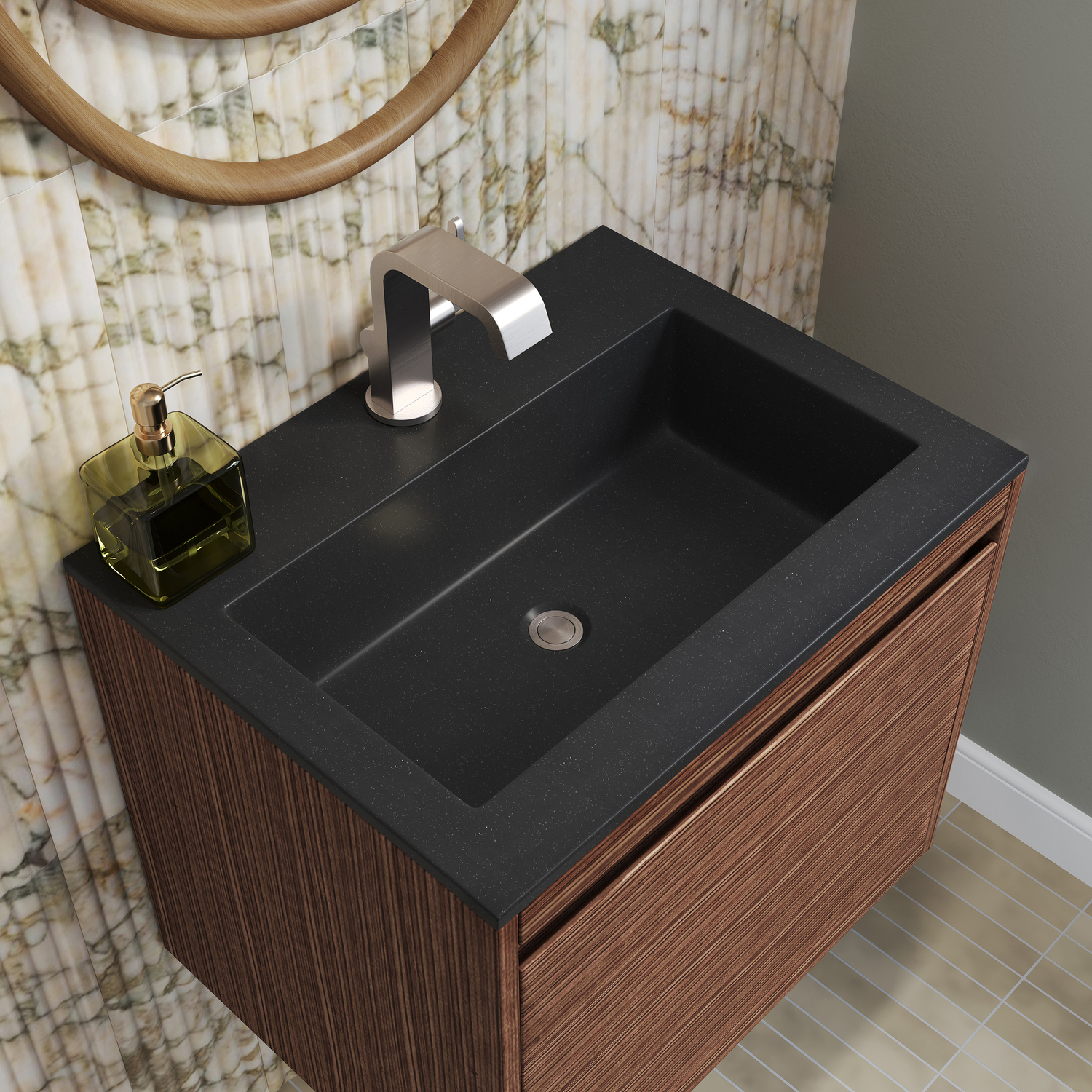 James Martin Mantova 23.6 inch Single Vanity, Mid-Century Walnut, Brushed Nickel Base w/ Charcoal Black Composite Stone Top, 840108962073, 805-V23.6-W-BN-CH