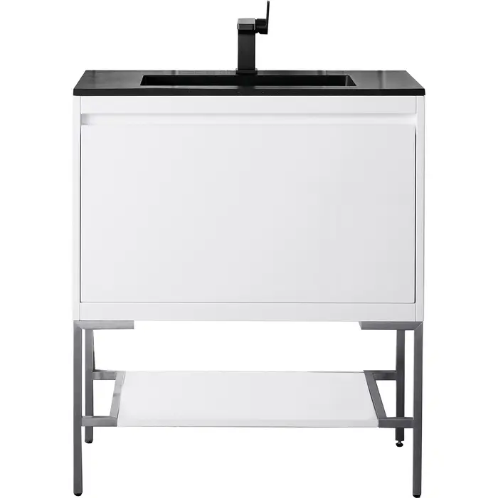 James Martin Mantova 31.5 inch Single Vanity, Glossy White, Brushed Nickel Base w/ Charcoal Black Composite Stone Top, 840108962172, 805-V31.5-GW-BN-CH
