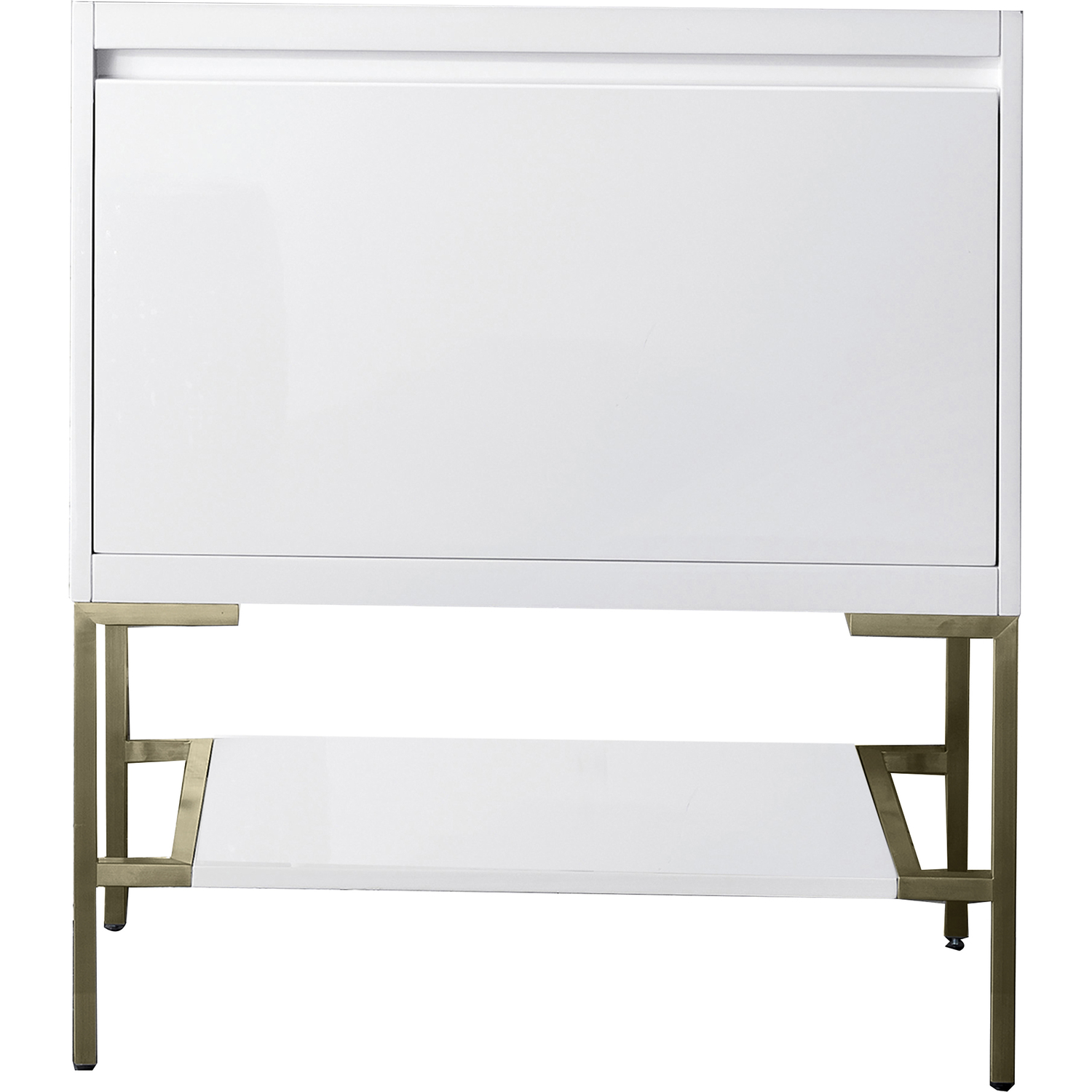 The Mantova 31.5” Glossy White Single Vanity Cabinet by James Martin Vanities will elevate your space by adding a touch of timeless décor to your bathroom. This vanity combines a cutting-edge design with pristine craftmanship to bring your bathroom a clean modern look providing you with both style and functionality. Generous storage features include soft-close drawers with one removable drawer organizer. Champagne Brass finished Stainless Steel Base is included.Glossy White single vanity cabinet with two interior drawers and lower open shelvingHardware/Stand Finish: Champagne BrassSolid kiln-dried Grade A hardwoodCabinet is finished inside and out with a premium undercoat finish for superior moisture and UV resistanceSoft-close undermount drawer glidesDrawer bottoms are lined with our signature brushed aluminum laminateCabinet and hardware/stand only, Composite Stone integrated top and sink not includedIdeal for the modern home, the Mantova Collection by James Martin Vanities offers a clean, contemporary look. Superbly crafted out of durable wood, it is immediately recognizable by its inherent beauty and durability. A true masterpiece of elegance and style, that is available in either a freestanding or wall-mounted edition. Each drawer is soft closing with ample storage room, that does not impede the design aesthetic of the overall piece. Each vanity comes with your choice of composite sink color either a Glossy White or a Charcoal Black Matte, as well as two options in cabinet finishes, Mid-Century Walnut or Glossy White. To complete the look, choose between three options for the metal base; Brushed Nickel, Champagne Brass, or Matte Black. The Mantova collection is available in multiple sizes and will work with a wide variety of different styles and decors.1 year warranty against manufacturer's defects. We will repair or replace any defective product, if the product is defective in material or workmanship at our discretion. No warranty is expressed or implied regarding damages resulting from consumer misuse.